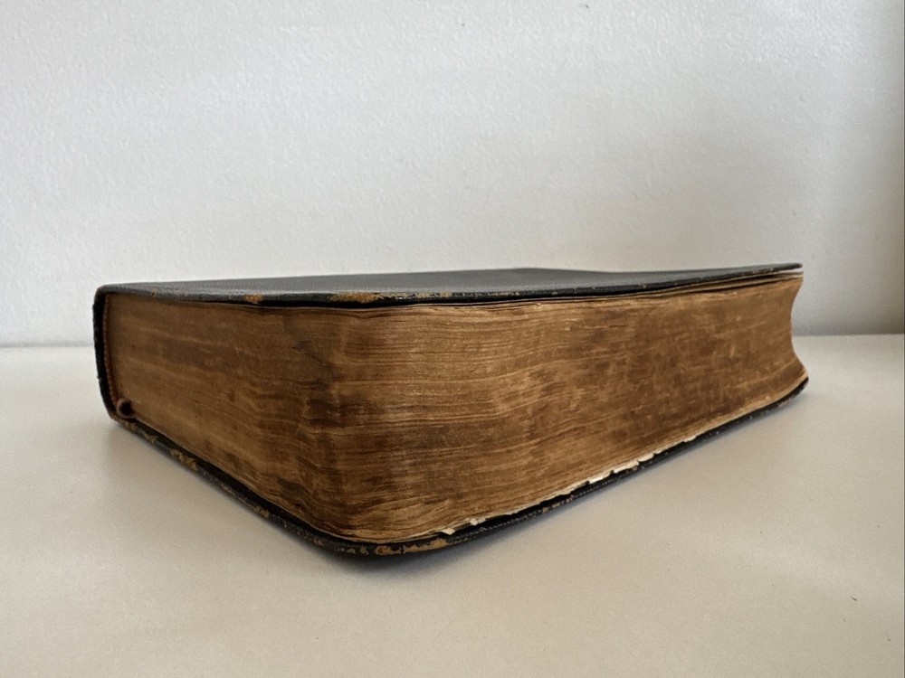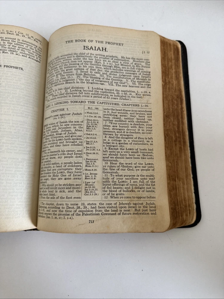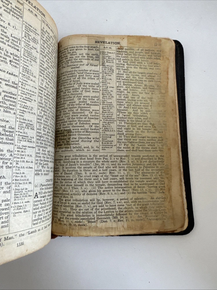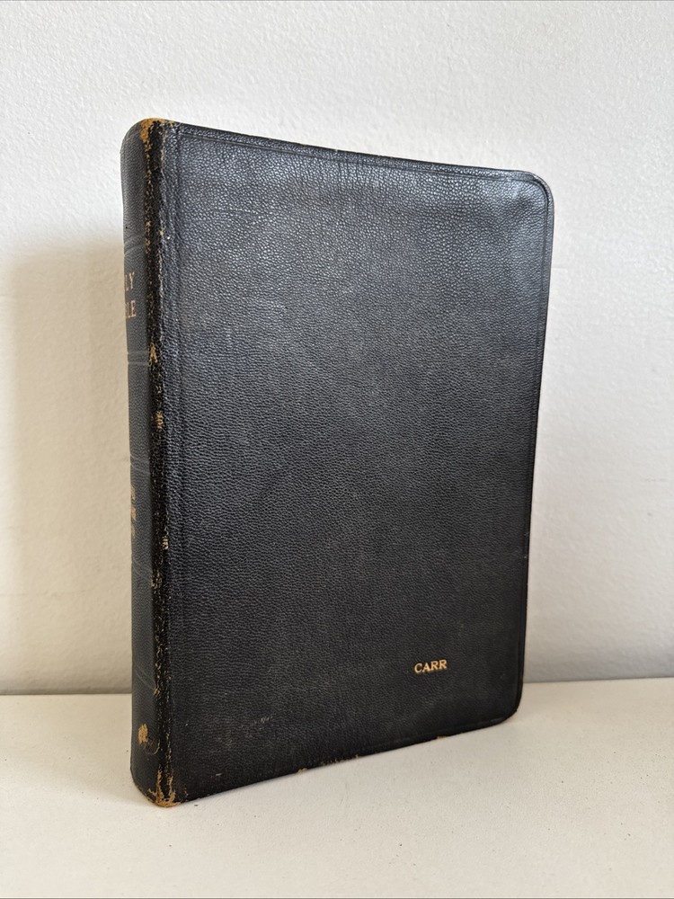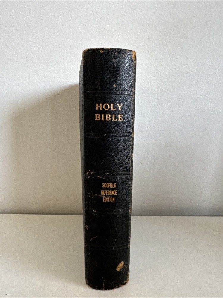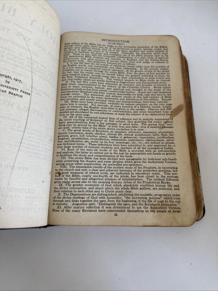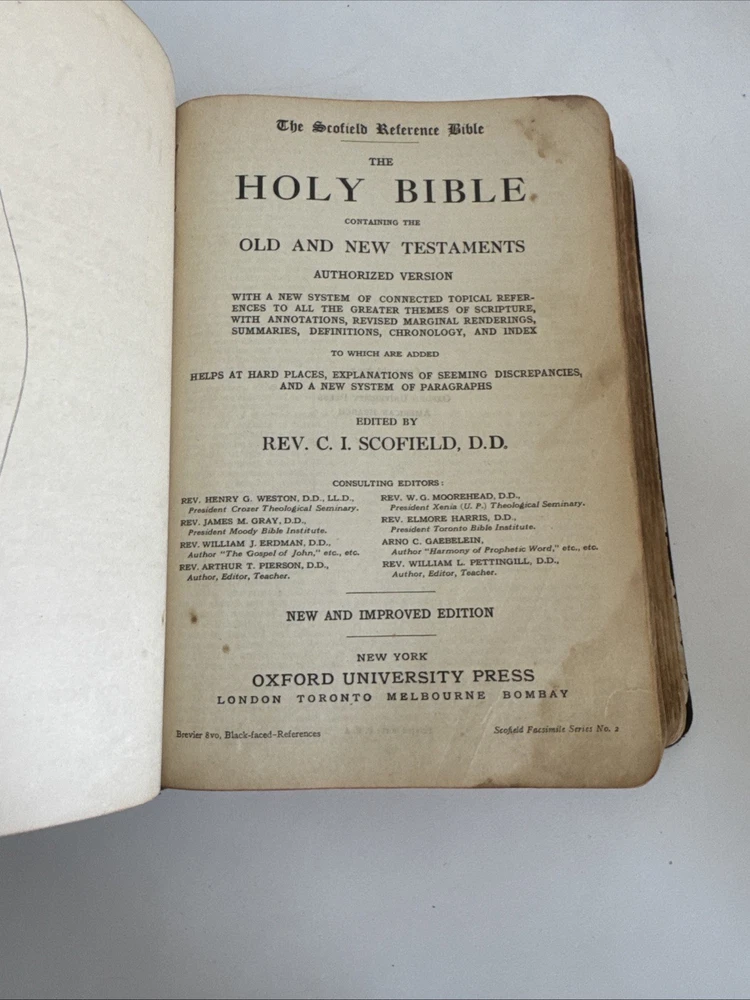 Holy Bible - Scofield Reference Edition Published by Oxford University Press. Copyright, 1917. New and Improved Edition. Black leather. Name emblazoned on front. Condition: dirt and age wear. Writing and names written on blank end pages. Some stains. A couple pages towards rear are hard to read. Some shelf wear. See photos. Shipped for FREE!