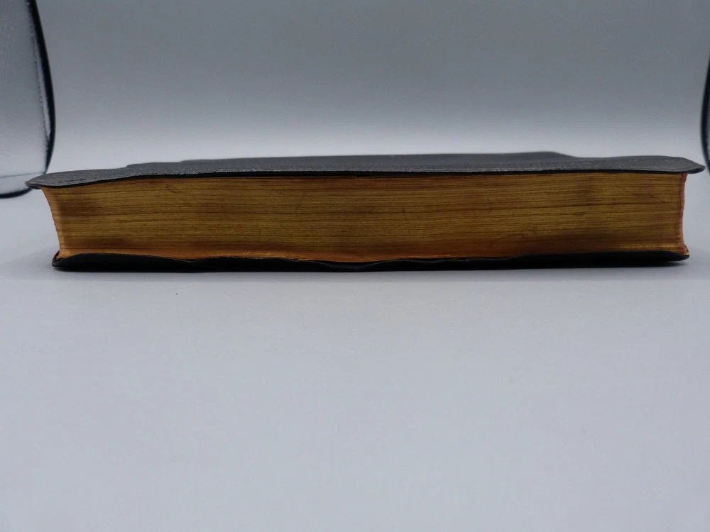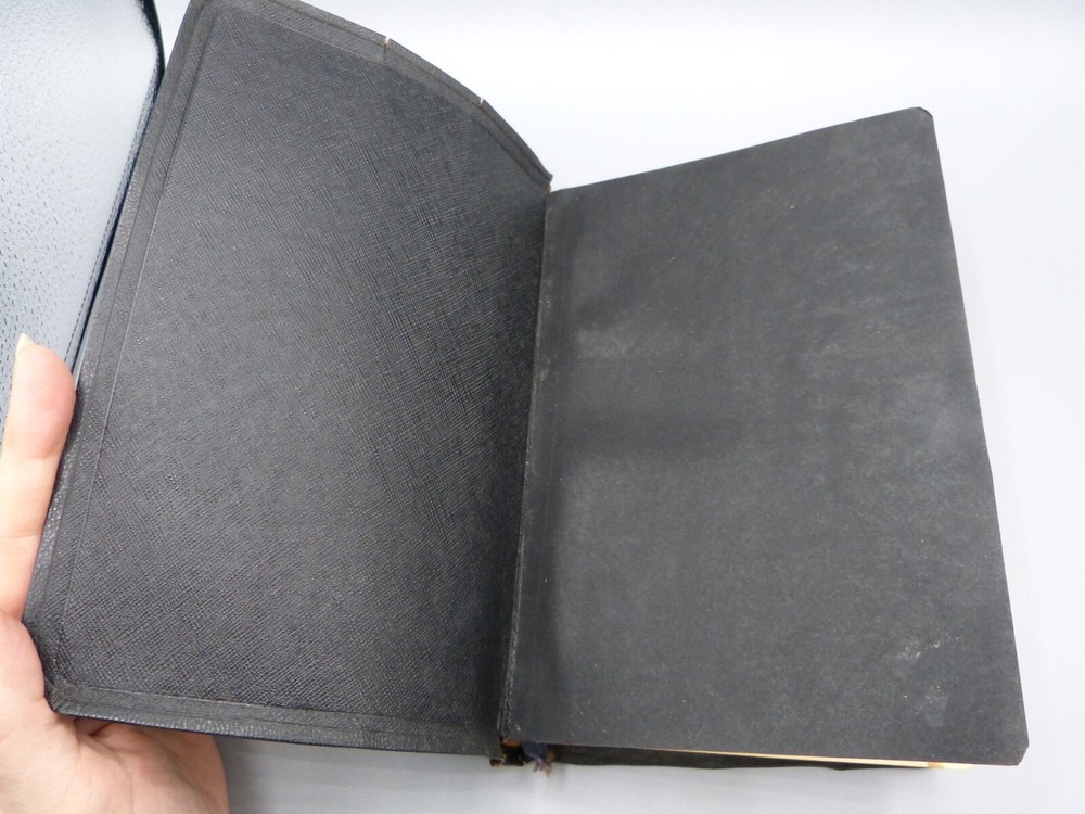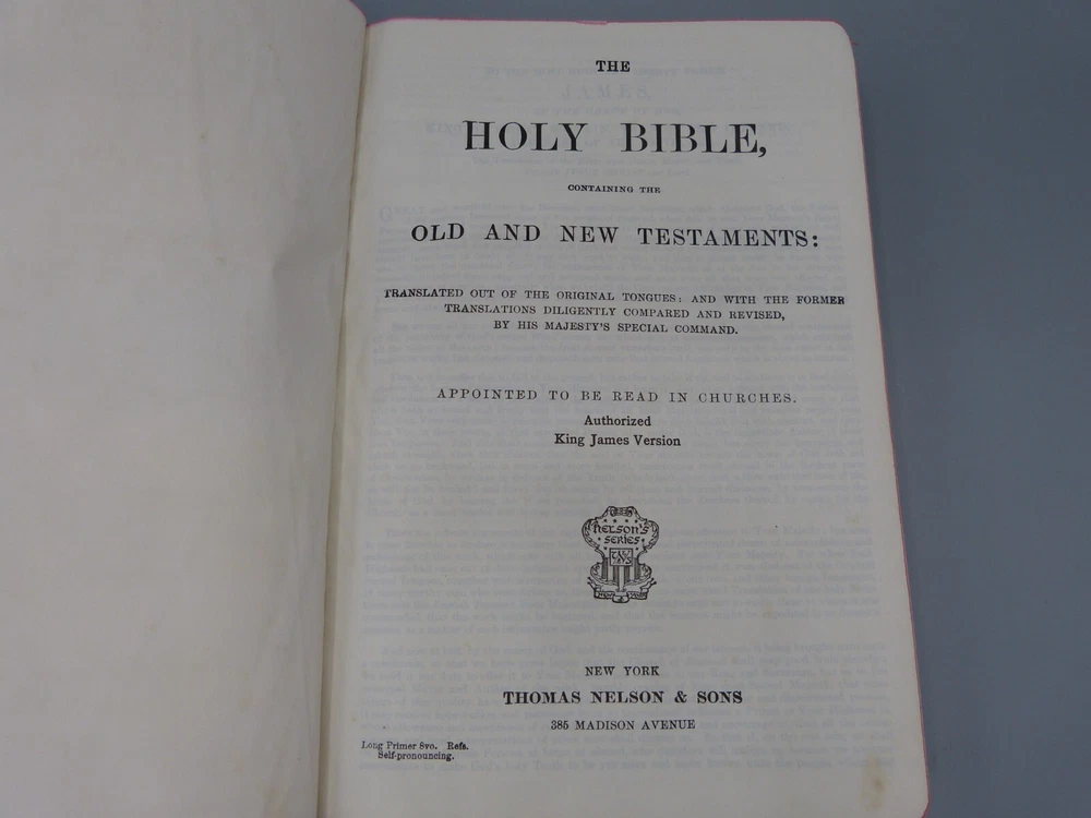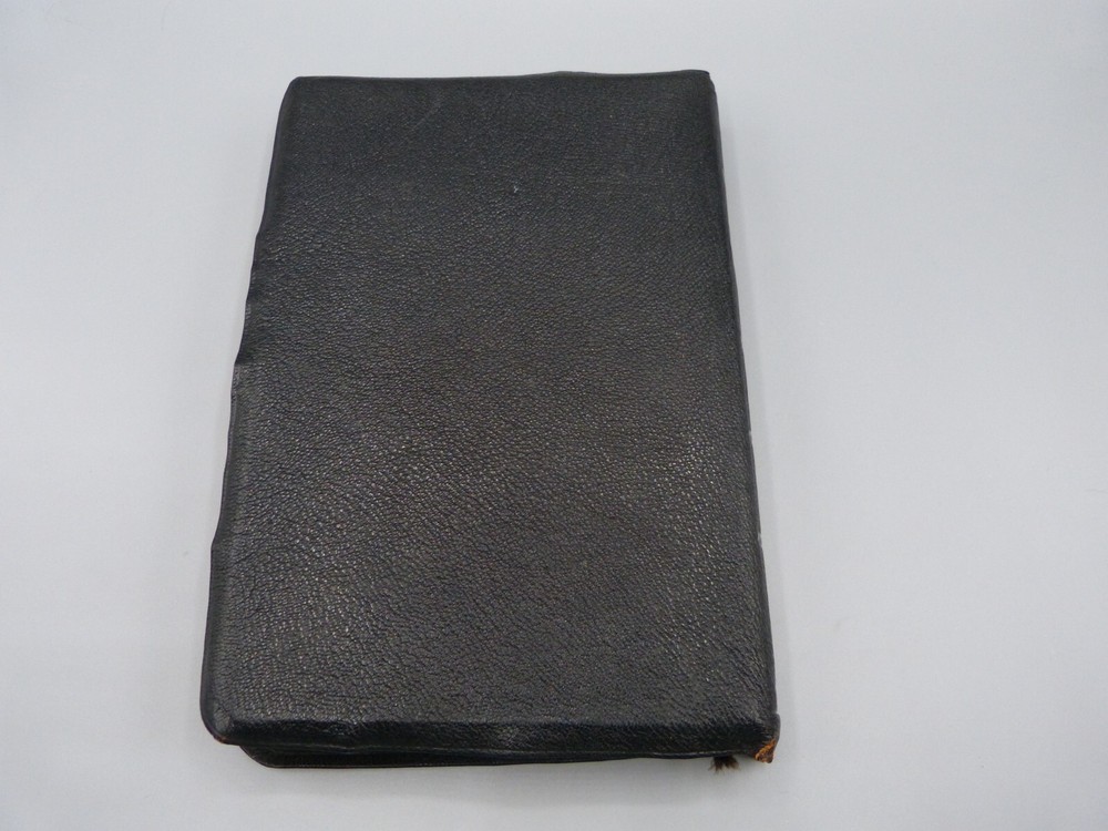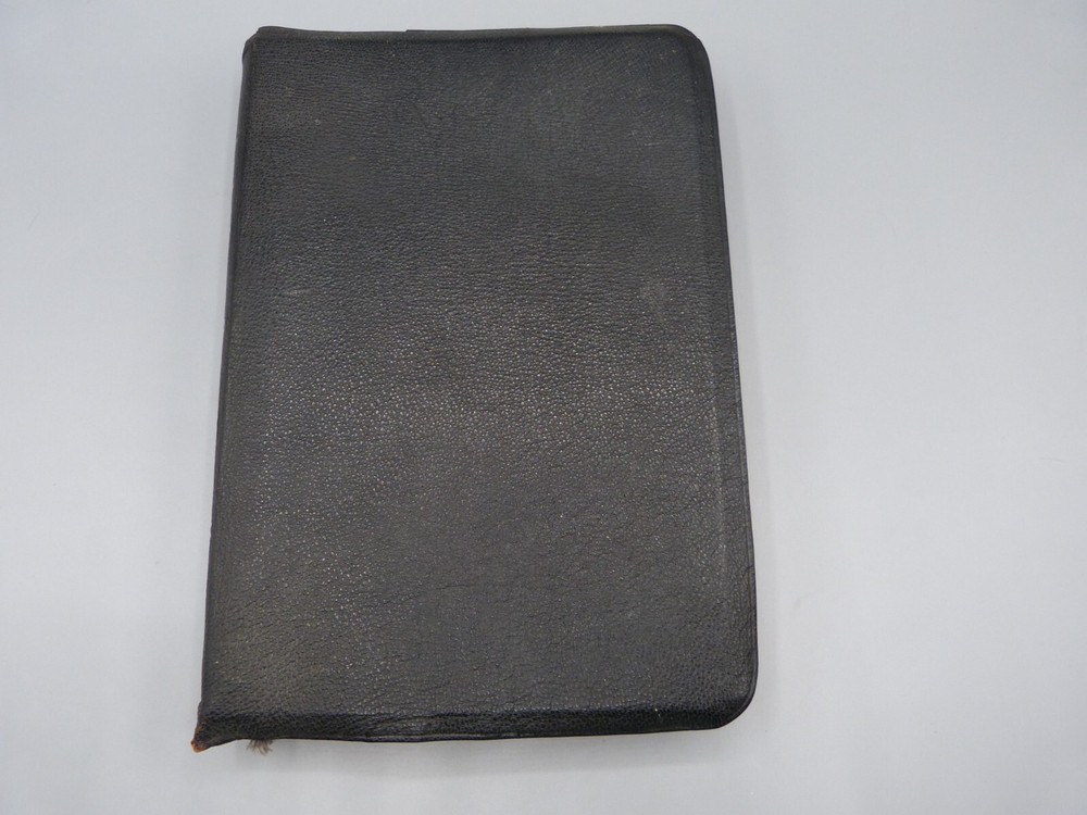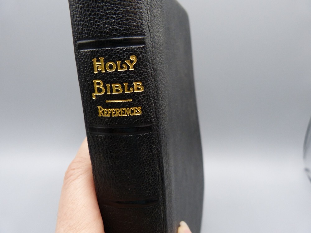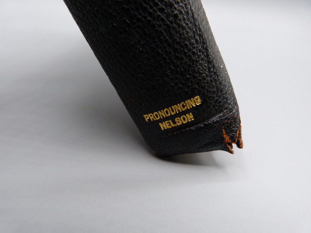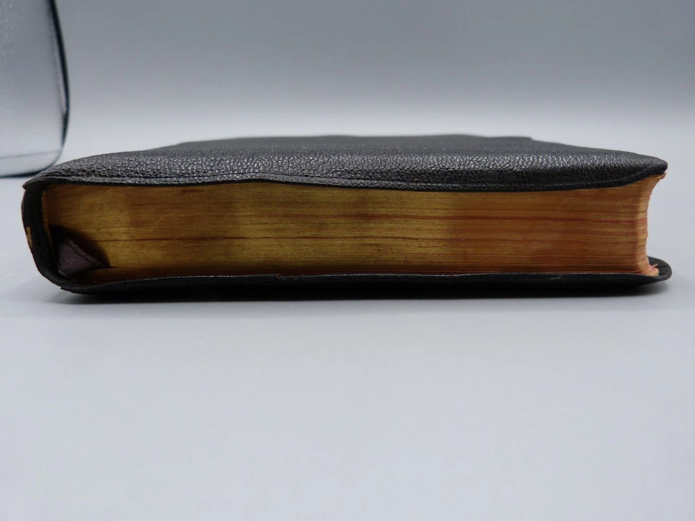 Holy Bible KJV Thomas Nelson * References* Pronouncing * Leather- Circa 1940 **Inscription on inner front blank page and other cosmetic flaws** Details: circa 1940's (the first inscription is 1949) black, looks and feels like leather (though no leather stamp is found) color maps gold-red page edge stain/gilt ribbon estimated size: 8.75 inches tall x ~6 inches wide x ~1 inch thick Condition: Acceptable inscription on one of the front inner blank pages. The leather on this Bible is stiff and shows wear at the top and bottom of the spine. A few other cover dings found along the edges and some scuffs on the cover. There are "age spots" (also called foxing), other spots that look like small stains page yellowing throughout. The ribbon is frayed. I do detect a mild woodstove/basement scent. no writing found in the Bible proper (though I cannot guarantee I didn't miss something). Please see photos for a full understanding of condition. Sold "as is". Thank you for looking.