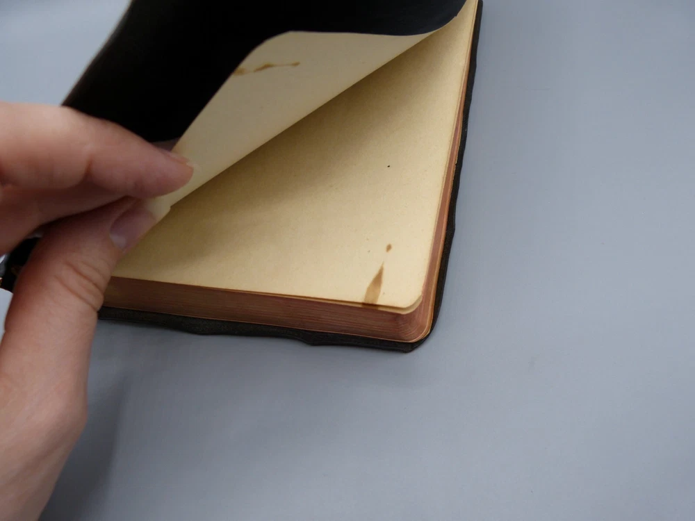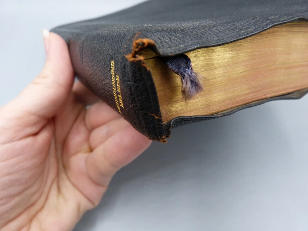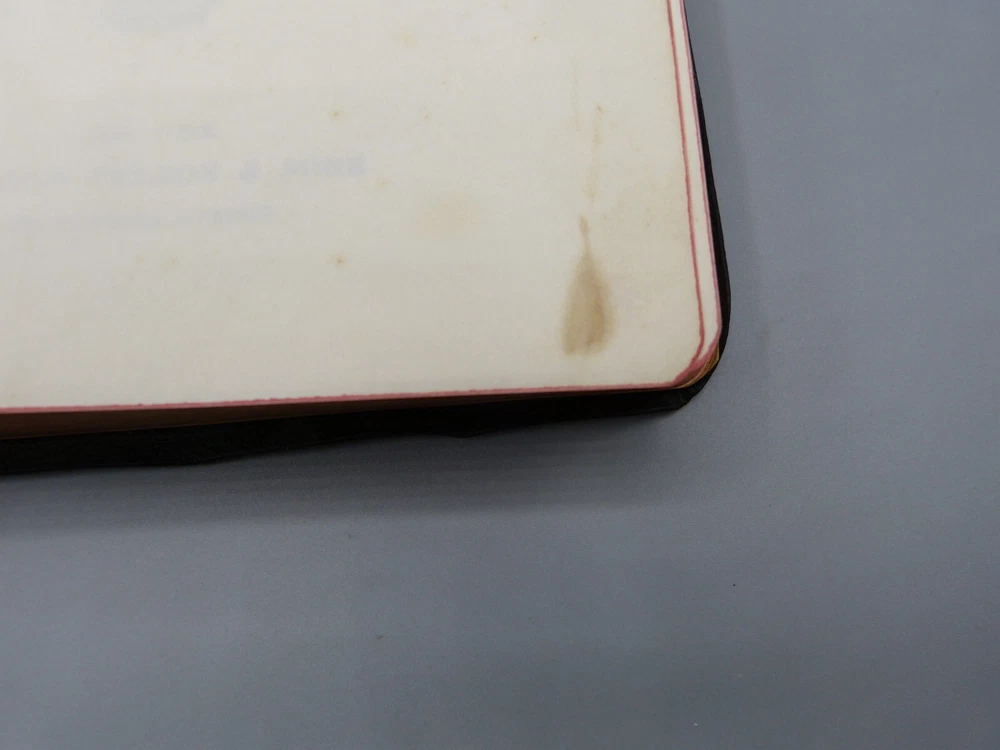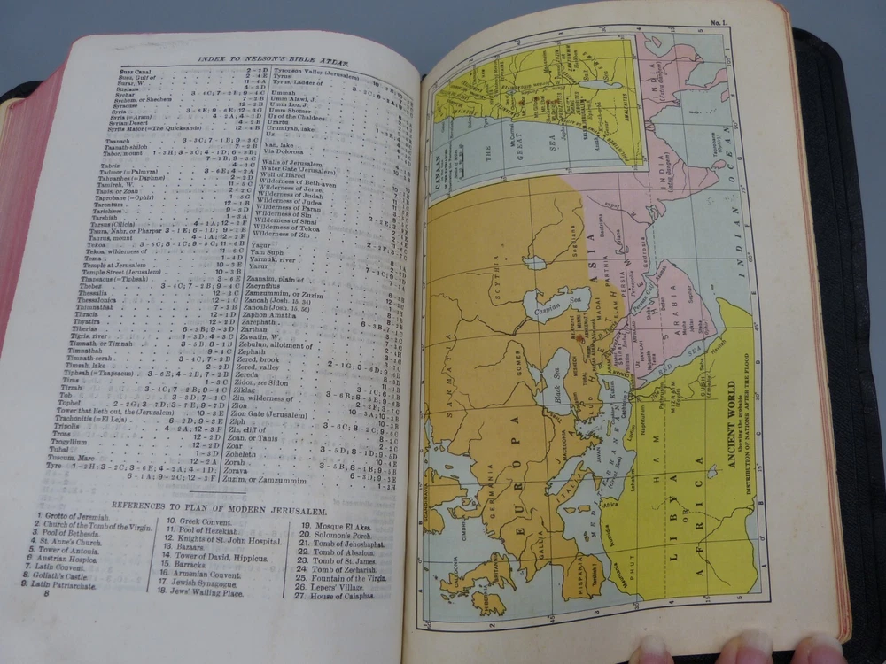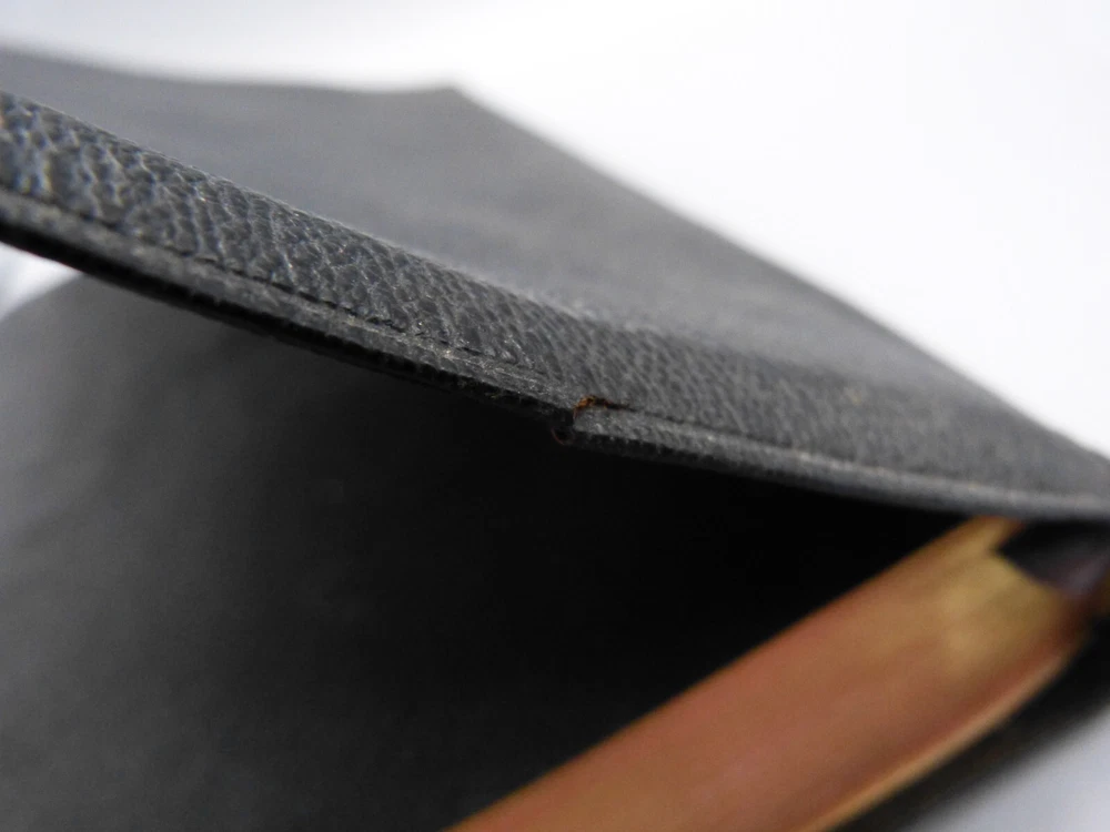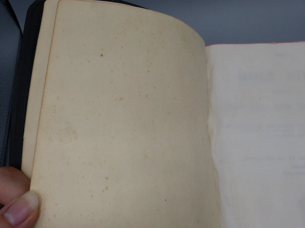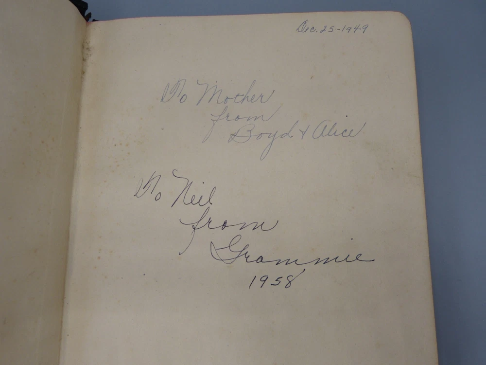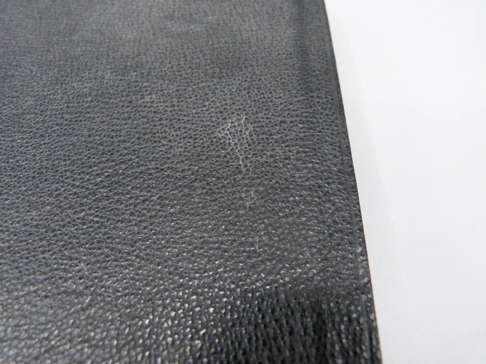 Holy Bible KJV Thomas Nelson * References* Pronouncing * Leather- Circa 1940 **Inscription on inner front blank page and other cosmetic flaws** Details: circa 1940's (the first inscription is 1949) black, looks and feels like leather (though no leather stamp is found) color maps gold-red page edge stain/gilt ribbon estimated size: 8.75 inches tall x ~6 inches wide x ~1 inch thick Condition: Acceptable inscription on one of the front inner blank pages. The leather on this Bible is stiff and shows wear at the top and bottom of the spine. A few other cover dings found along the edges and some scuffs on the cover. There are "age spots" (also called foxing), other spots that look like small stains page yellowing throughout. The ribbon is frayed. I do detect a mild woodstove/basement scent. no writing found in the Bible proper (though I cannot guarantee I didn't miss something). Please see photos for a full understanding of condition. Sold "as is". Thank you for looking.