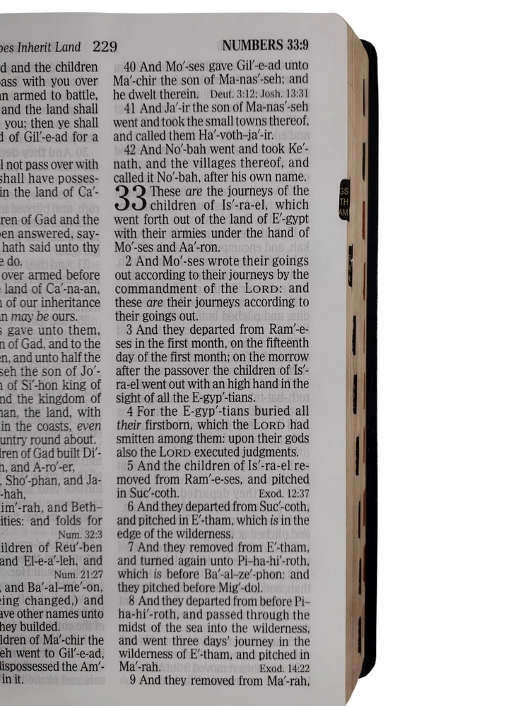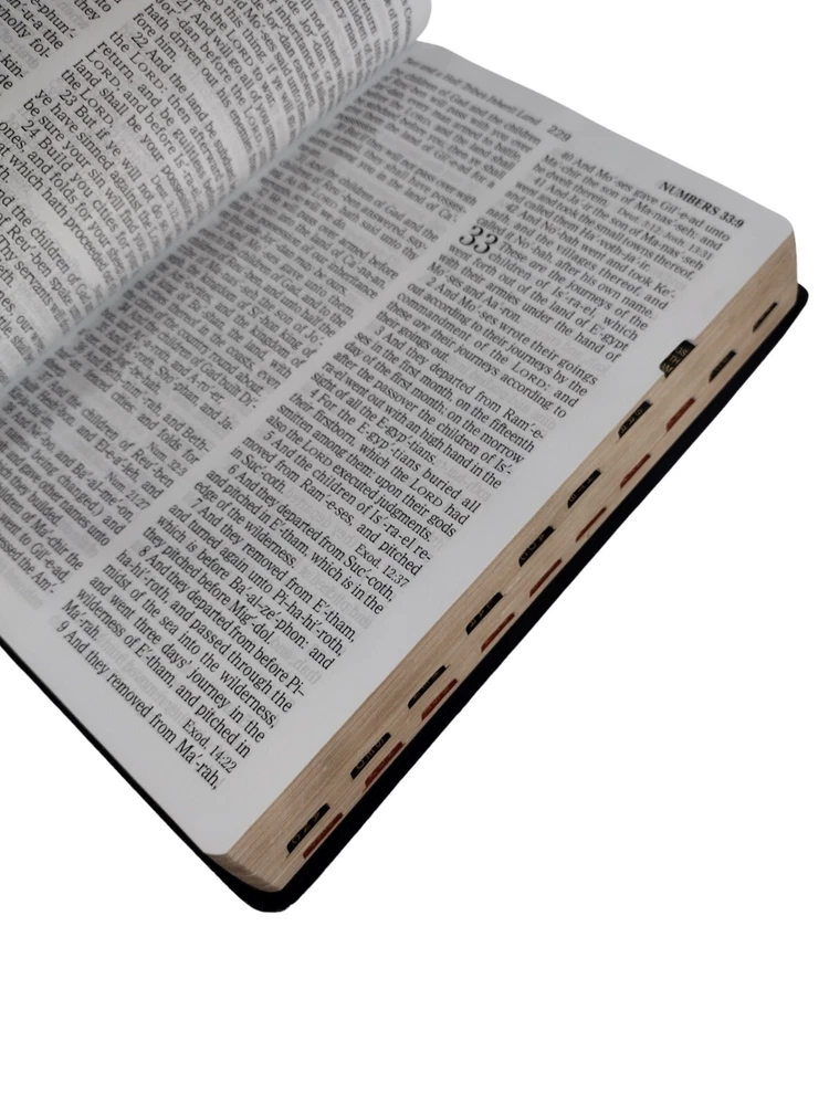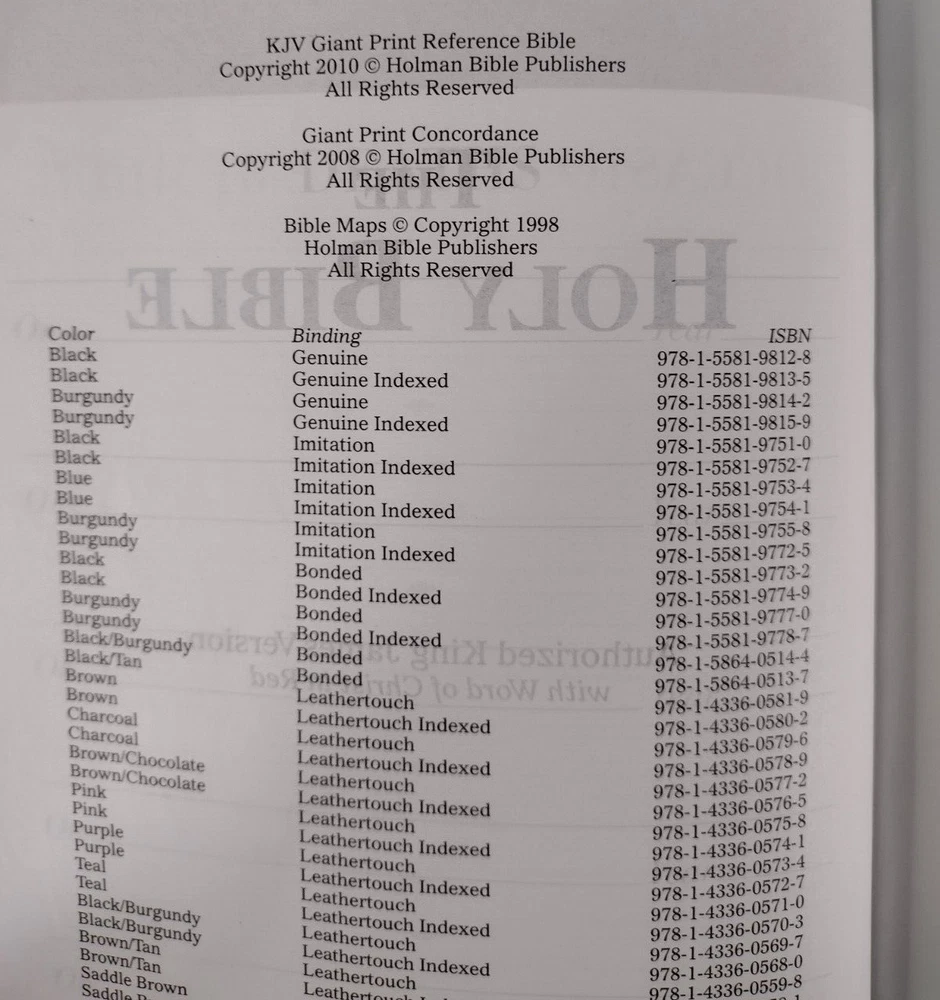 Up for sale is this beautiful copy of the KJV Thumb Index Giant Print Reference Black Leather Bound Holy Bible published by Holman in 2010. It is in like new condition, with no writing, inscriptions, or any shelf ware of damage. All pictures are of the actual item being sold. Returns are easily accepted but rarely needed. I have a great deal of experience shipping large and/or delicate items and guarantee that your item will arrive to you safely. Feel free to message me if you have any questions. Thank you.