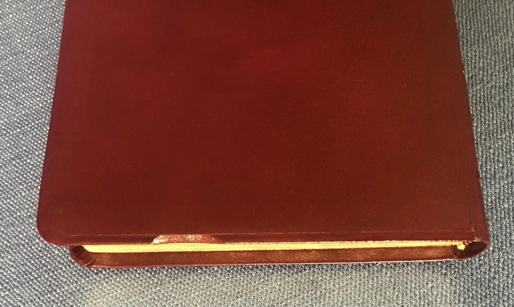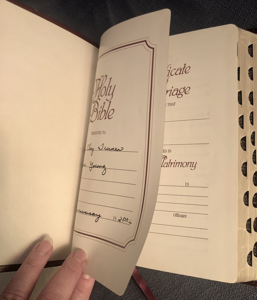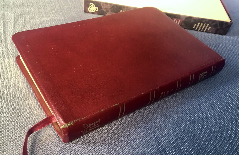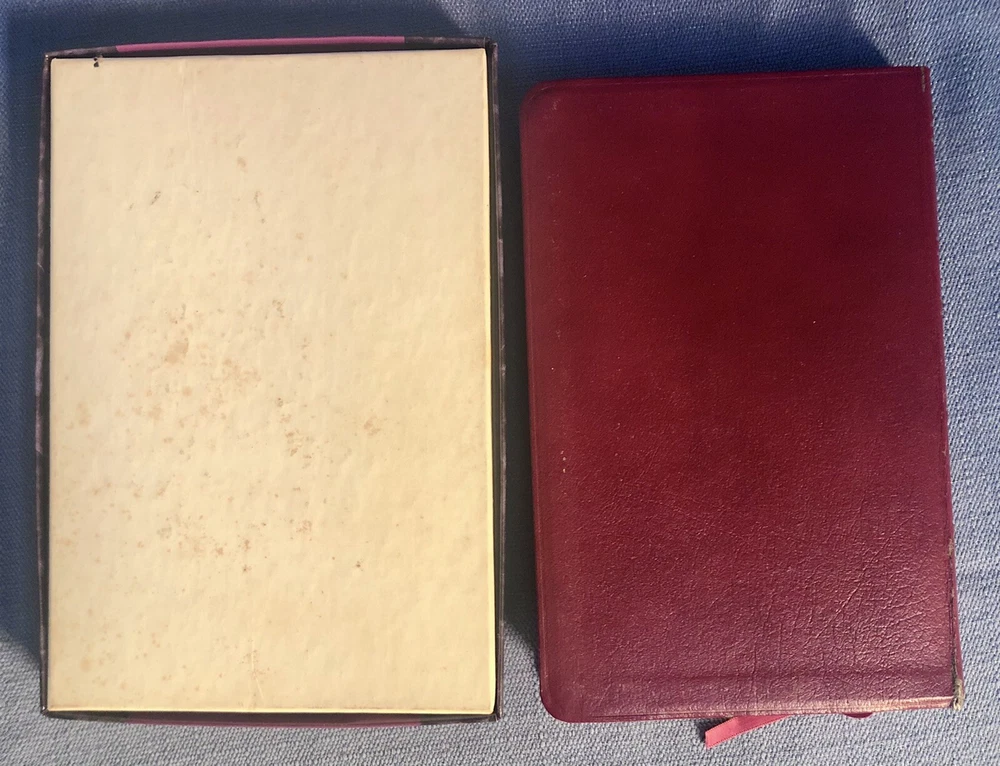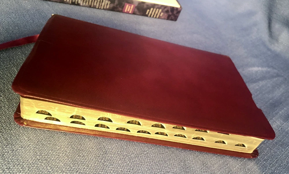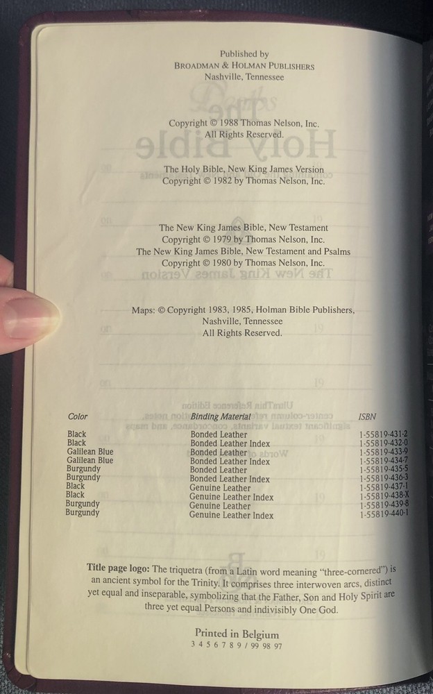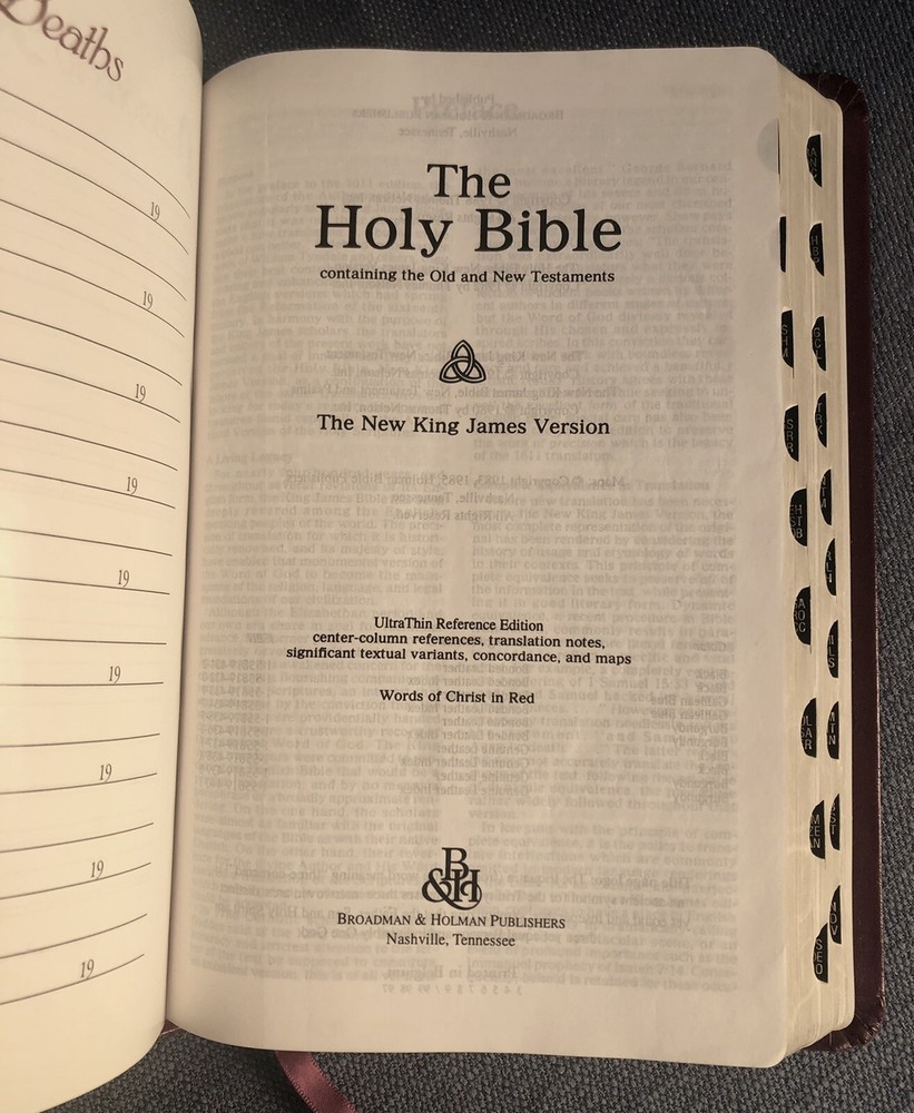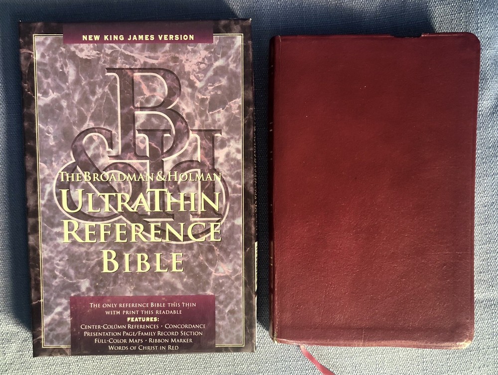 UltraThin Reference Bible King James Version Brand: Broadman & Holman *The only reference Bible this thin with print this readable.* Burgundy Bonded Leather, with box Center column references Concordance Full color maps Words of Christ in red Nice condition! One little flaw at top of front cover as shown. Light wear on spine. Some wear on bottom of box. Presentation page has been filled in. No other writing. PLEASE SEE ALL PICTURES FOR DETAILS! Smoke free pet free environment. Items ship within one business day of receiving payment.