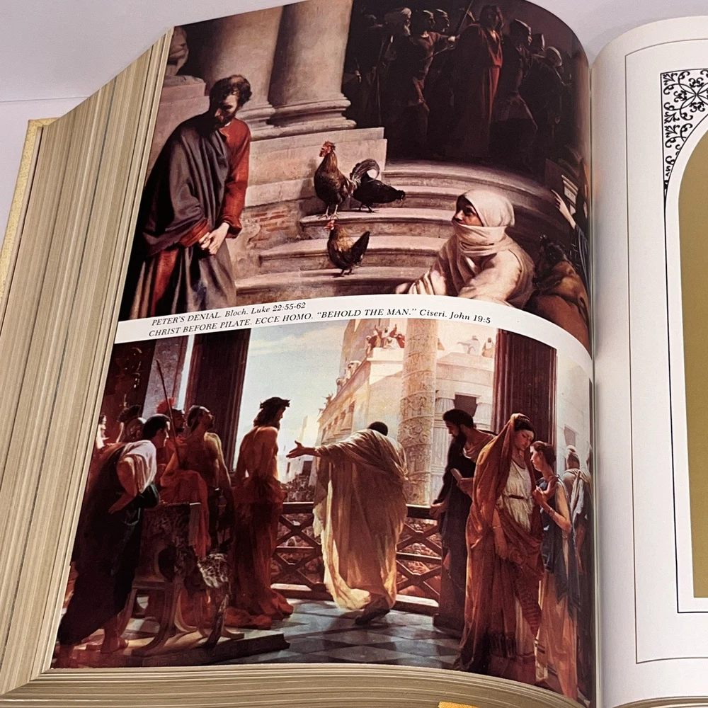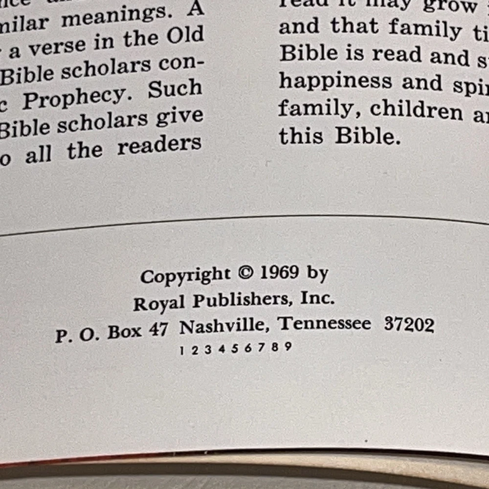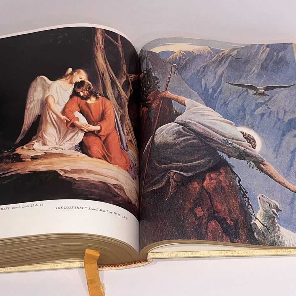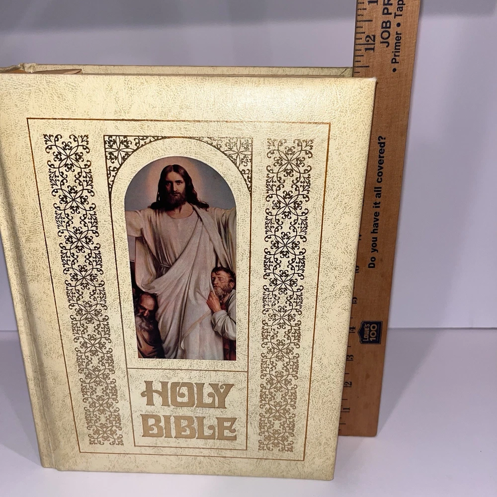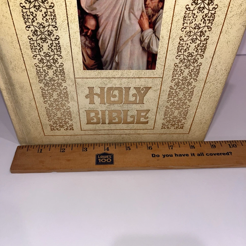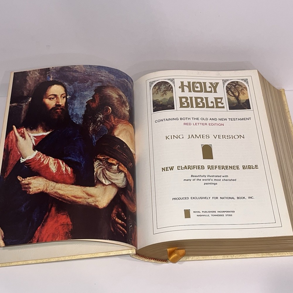 The Holy Bible King James Version, Clarified Reference, Red Letter Edition published by Royal Publishing in 1969 is a vintage hardcover Bible in English. This edition features a leather-bound cover and illustrations of famous paintings, making it a visually appealing and durable version of the Bible. With the King James Version text clarified for easier reading, this red letter edition is a valuable resource for those interested in religion, Christianity, and the Bible. Made in the United States, this Bible is a timeless piece for individuals seeking a deeper understanding of religious texts. EUC! See photos for exact condition and measurements. 8.5 x 11
