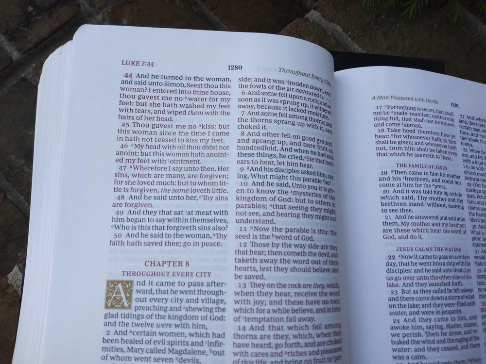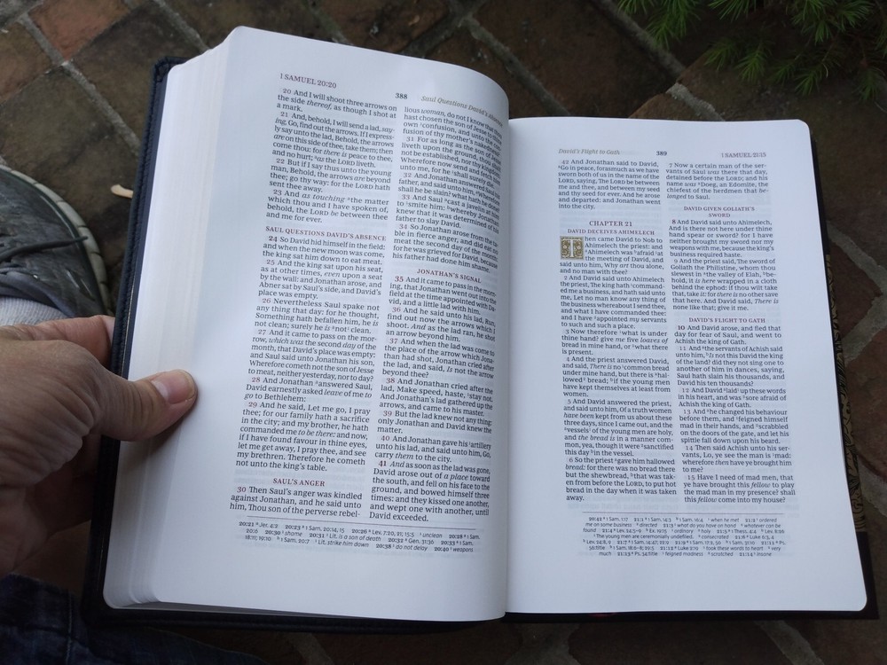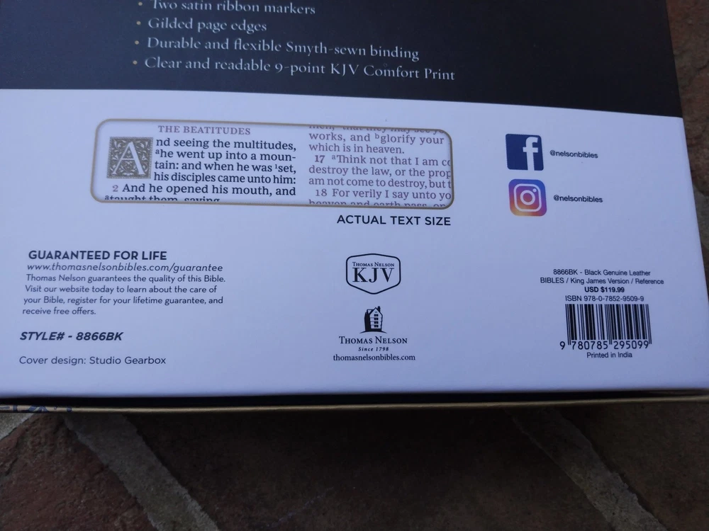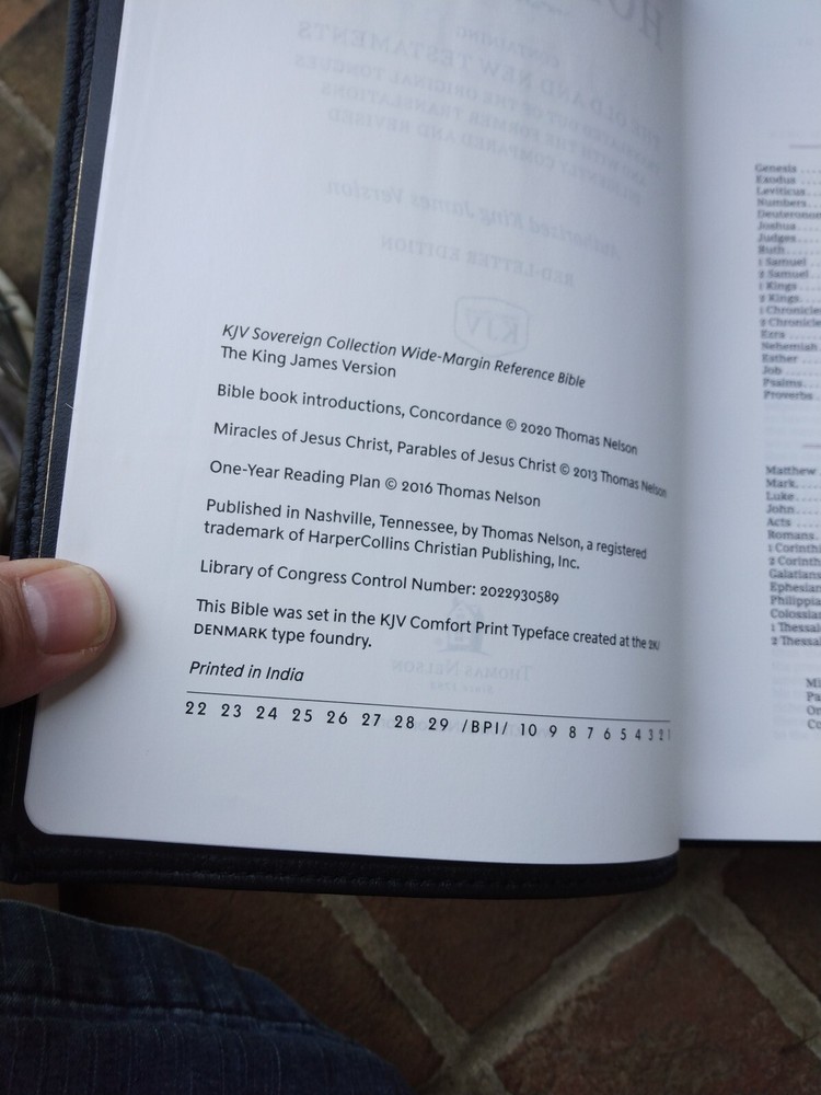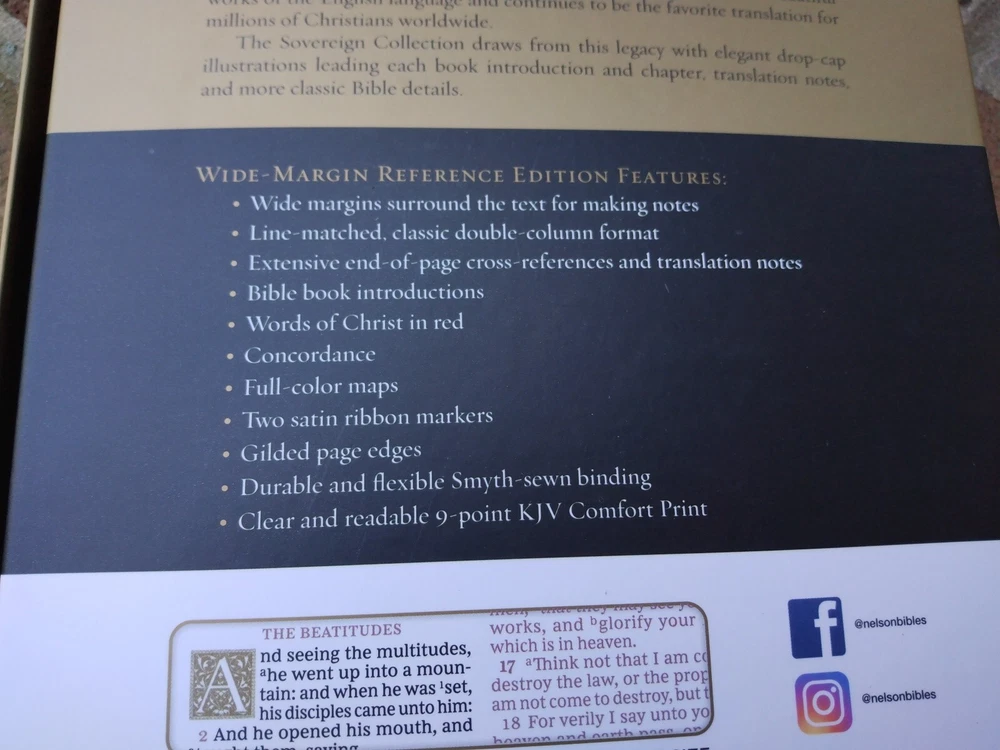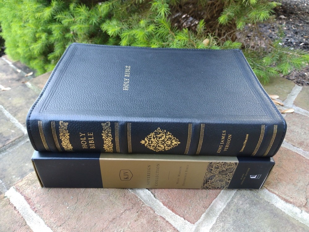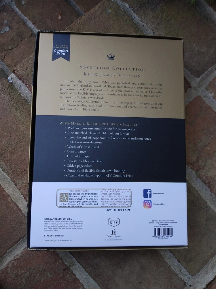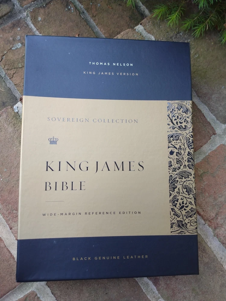 A classic wide margin KJV Bible that looks and feels like the majestic heritage it comes from, with historically rich design details including elegant drop cap illustrations, line-matched text, and traditional covers., This beautiful wide margin edition honors the legacy of the King James Version Bible in a convenient size with essential study tools and traditional red-letter text for the Words of Christ. This edition is published in large KJV Comfort Print type, which was designed exclusively for Thomas Nelson to be the most readable at any size. The Sovereign Collection continues Thomas Nelson's long history and stewardship publishing Bibles. King James Sovereign Collection editions draw from the legacy of the trustworthy and timeless KJV with elegant letter illustrations leading into each chapter, the exclusive Comfort Print typeface inspired by centuries-old Thomas Nelson editions, and more classic Bible details. In 1611, the King James Version Bible, also known as the Authorized Version, was published. Nearly 50 of the day's finest scholars, all from the Church of England, had been organized into six groups for the task. Using the Bishop's Bible of 1568 as the basis for this revision, the Old Testament was translated from Hebrew and the New Testament from Greek. The completed work was then peer-reviewed before being sent to bishops and other church leaders for their examination, and ultimately to King James, monarch of England and Scotland, for his approval. Today, more than 400 years since its initial publication, the bestselling King James Version Bible continues to inspire, encourage, and strengthen people from all walks of life. The KJV is considered one of the most influential and beautiful works of literature in the English language and continues to be the favorite translation for millions of Christians. Features include: Line-matched classic 2-column format for a comfortable reading experience Wide outer margins for notes and reflections to engage in deeper study Book introductions provide a concise overview of the background and historical context of the book about to be read Words of Christ in red help you quickly identify Jesus' teachings and statements Extensive end-of-page cross references allow you to find related passages quickly and easily Translation notes provide a look into the thinking of the translators with alternative translations that could have been used and textual notes about manuscript variations Presentation page to personalize this special gift by recording a memory or a note Parables of Christ shows where you can over 30 parables in the Gospels Reading plan guiding you through the entire Bible in a year Concordance for looking up a word's occurrences throughout the Bible Full-color maps show a visual representation of Israel and other biblical locations for better context Two satin ribbon markers for you to easily navigate and keep track of where you were reading Gilded page edges help protect the edge of the page and provide a polished look Durable and flexible Smyth-sewn binding so the Bible will lay flat in your hand or on a desk Easy-to-read 9-point KJV Comfort Print (R), This beautiful wide margin edition honors the legacy of the King James Version Bible in a convenient size with essential study tools and traditional red-letter text for the Words of Christ. This edition is published in large KJV Comfort Print type, which was designed exclusively for Thomas Nelson to be the most readable at any size. The Sovereign Collection continues Thomas Nelson's long history and stewardship publishing Bibles. King James Sovereign Collection editions draw from the legacy of the trustworthy and timeless KJV with elegant letter illustrations leading into each chapter, the exclusive Comfort Print typeface inspired by centuries-old Thomas Nelson editions, and more classic Bible details. In 1611, the King James Version Bible, also known as the Authorized Version, was published. Nearly 50 of the day's finest scholars, all from the Church of England, had been organized into six groups for the task. Using the Bishop's Bible of 1568 as the basis for this revision, the Old Testament was translated from Hebrew and the New Testament from Greek. The completed work was then peer-reviewed before being sent to bishops and other church leaders for their examination, and ultimately to King James, monarch of England and Scotland, for his approval. Today, more than 400 years since its initial publication, the bestselling King James Version Bible continues to inspire, encourage, and strengthen people from all walks of life. The KJV is considered one of the most influential and beautiful works of literature in the English language and continues to be the favorite translation for millions of Christians. Features include: Line-matched classic 2-column format for a comfortable reading experience Wide outer margins for notes and reflections to engage in deeper study Book introductions provide a concise overview of the background and historical context of the book about to be read Words of Christ in red help you quickly identify Jesus' teachings and statements Extensive end-of-page cross references allow you to find related passages quickly and easily Translation notes provide a look into the thinking of the translators with alternative translations that could have been used and textual notes about manuscript variations Presentation page to personalize this special gift by recording a memory or a note Parables of Christ shows where you can over 30 parables in the Gospels Reading plan guiding you through the entire Bible in a year Concordance for looking up a word's occurrences throughout the Bible Full-color maps show a visual representation of Israel and other biblical locations for better context Two satin ribbon markers for you to easily navigate and keep track of where you were reading Gilded page edges help protect the edge of the page and provide a polished look Durable and flexible