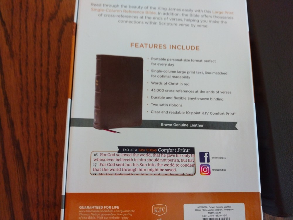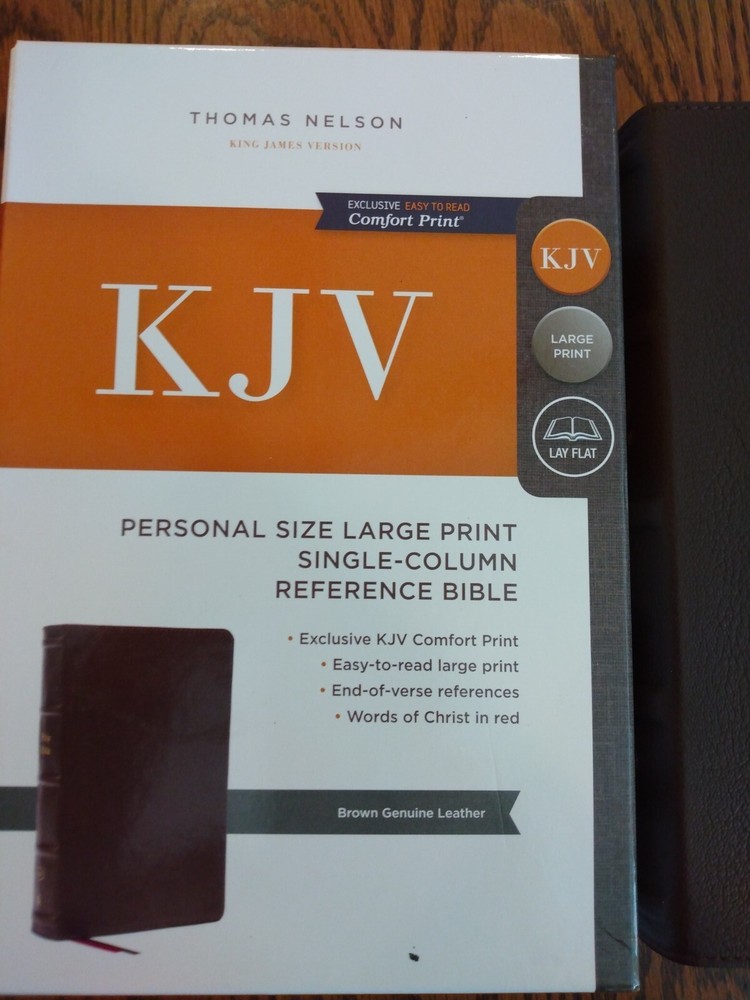 Holy Bible : King James Version, Brown, Personal Size, Genuine Leather, End-of-verse Reference Bible, Red Letter, Comfort Print, Paperback by Thomas Nelson Publishers (COR), ISBN 0785291156, ISBN-13 9780785291152, Brand New, Free shipping in the US Navigate through Scripture easily with a KJV Bible that contains a unique single-column format and thousands of cross-references located at the ends of verses.