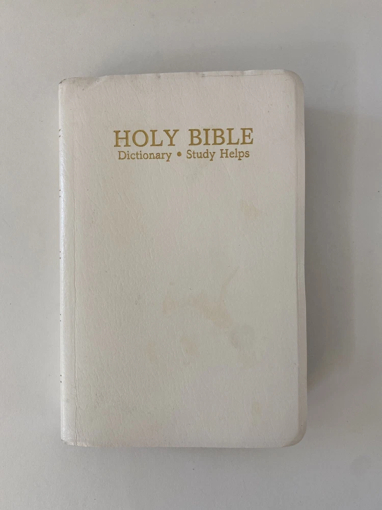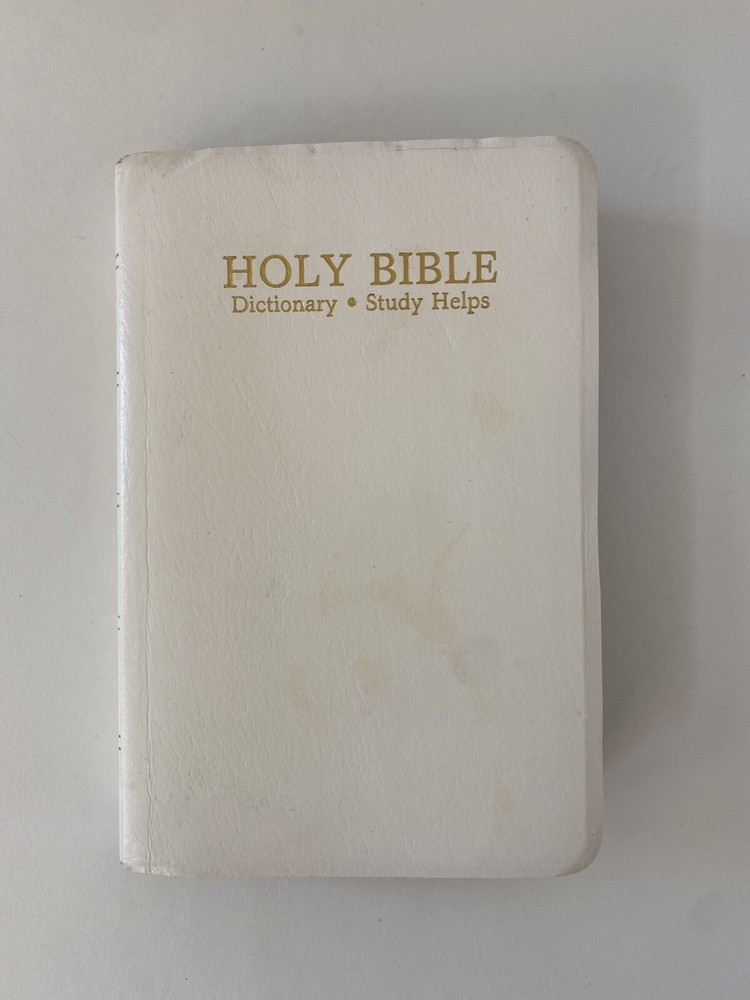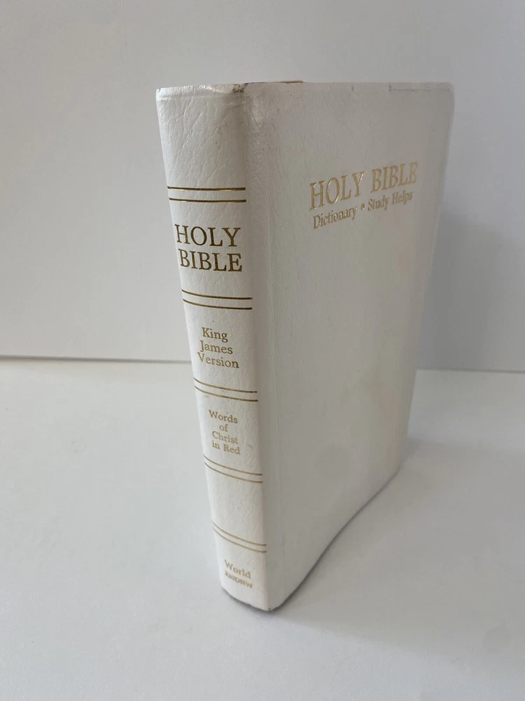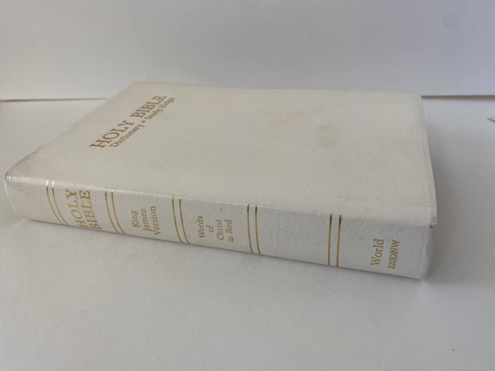 Holy Bible King James Version Red Letter Dictionary Study Helps World 220DNW Copyright 1989. No writing inside other than the inscription page, and help page. See photos. Faux leather white cover. From a smoke free home. Thanks for looking. Will ship media mail. FREE SHIPPING. H1