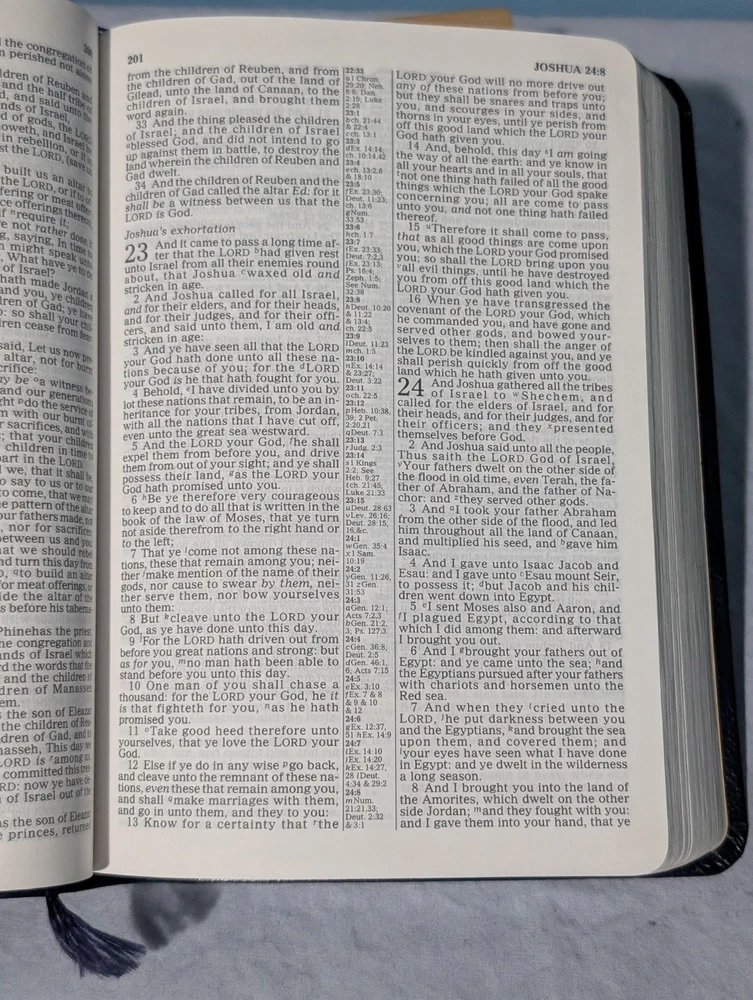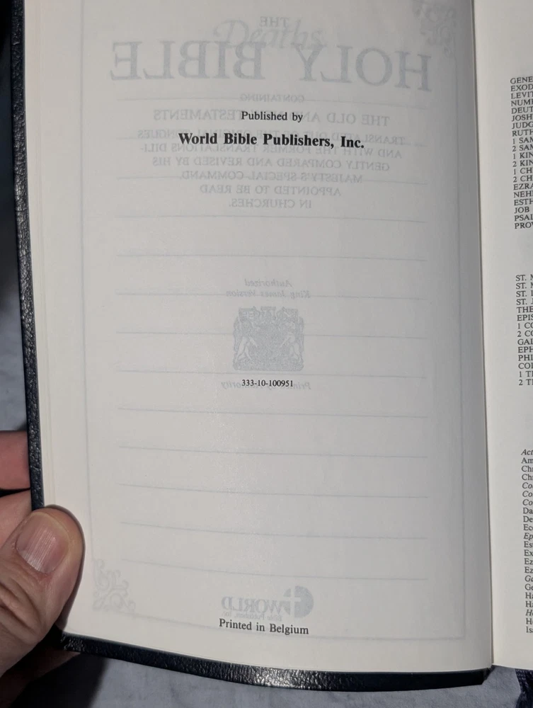 Holy Bible King James Version References World Printed in Belgium Good condition, no writing in it, leather bonded, navy blue slight fold on front cover Orders will be shipped out within 24 hours of payment Canadian & US customers orders will be sent either by Canada Post or UPS. Canadian shipping usually takes between 1 and 2 weeks, US mail may take longer due to customs. Customers outside of North America will be shipped either through Canada Post or through a courier using Post NL. Please expect 4 to 8 weeks for international delivery depending on your location.