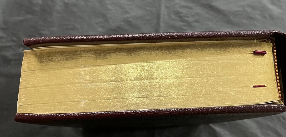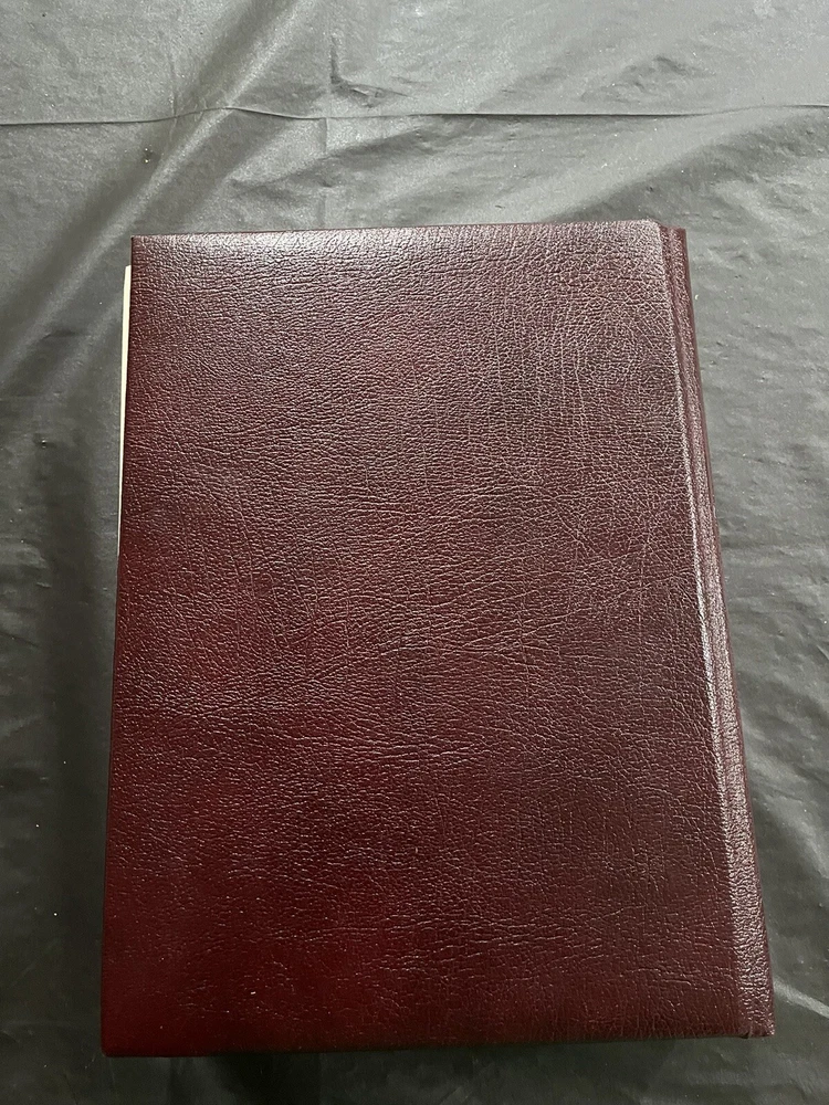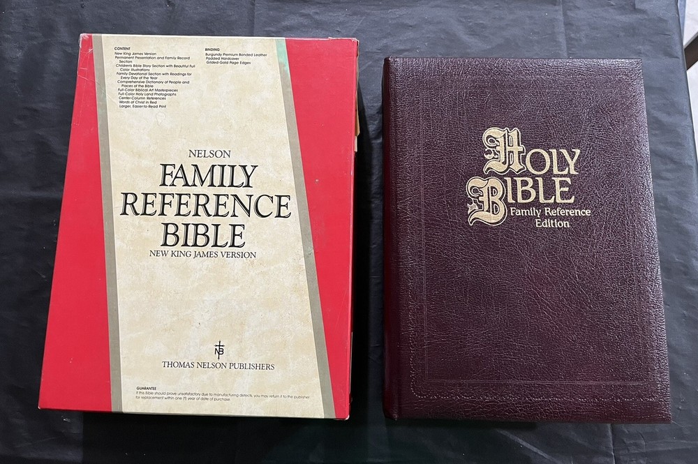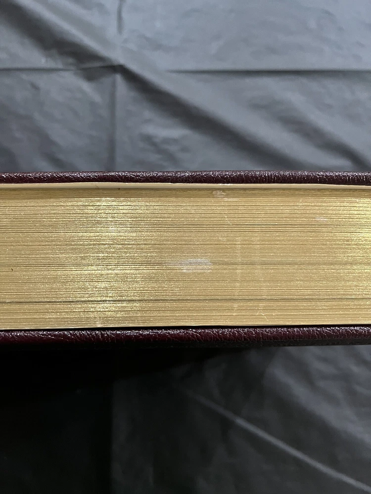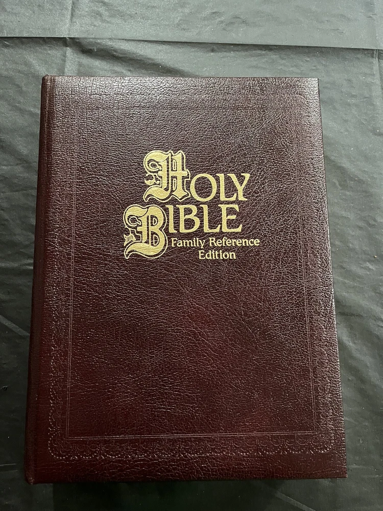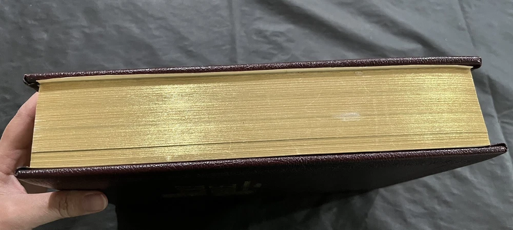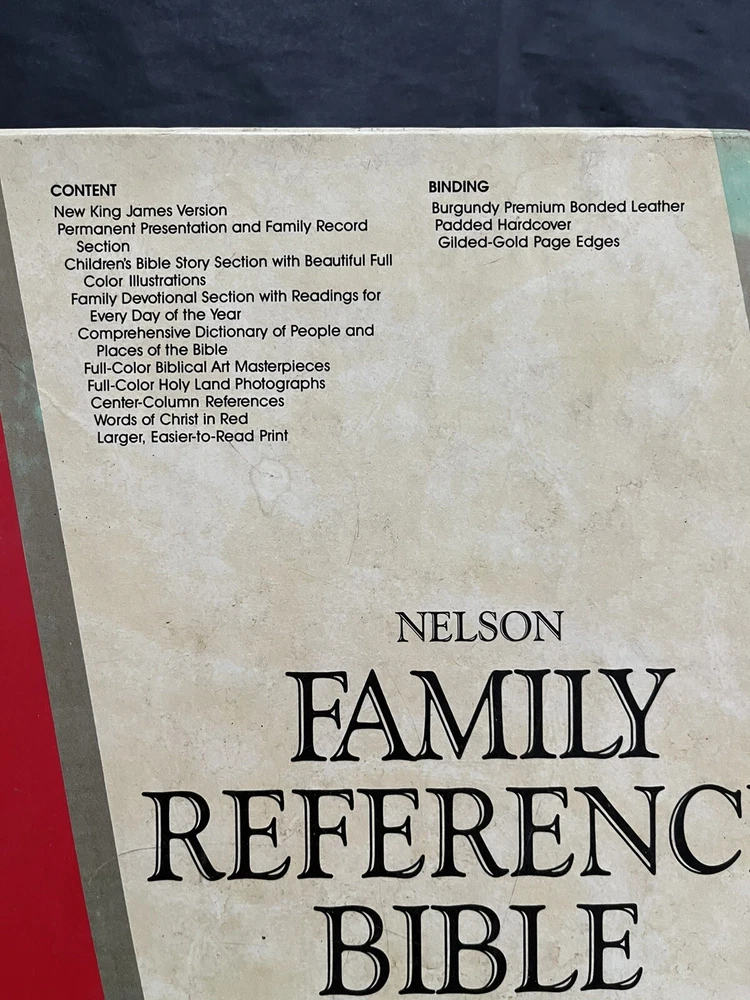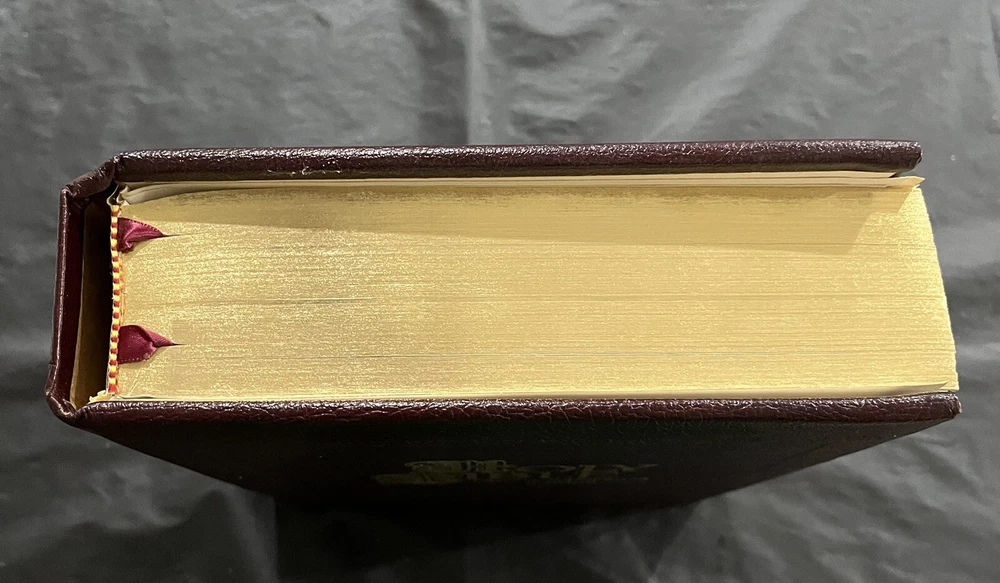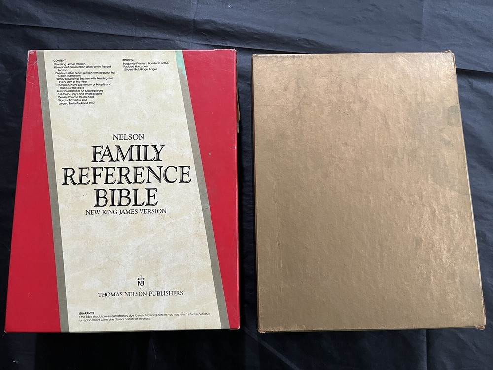 Acceptable condition. HC. Storage box has masking tape on top, peeling on bottom and bottom of storage box side flap is detached from corners. Inside hinge of Bible spine is visible (threading) with separation (front and back of Bible). Text block has mild whitish stain. No damage pages, no tears, creases, writing or highlighting throughout Bible. Please see all photos. Feel free to ask questions.