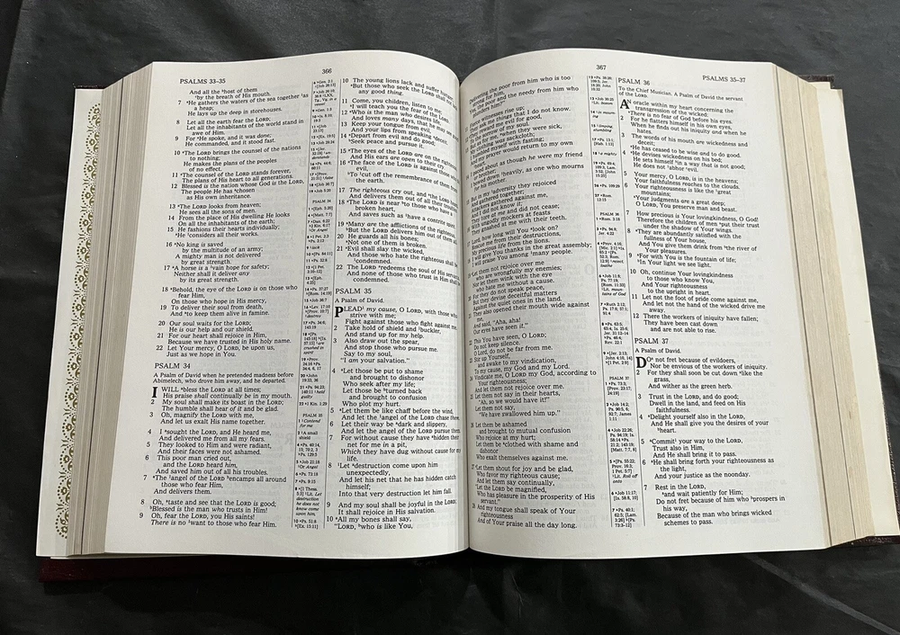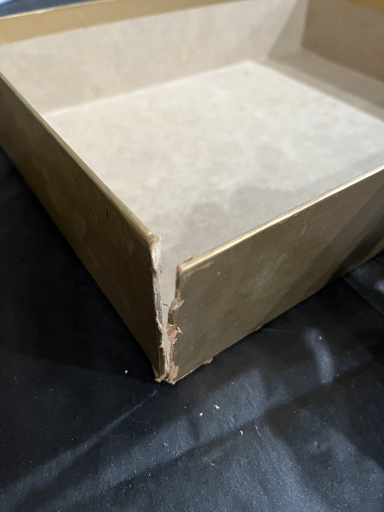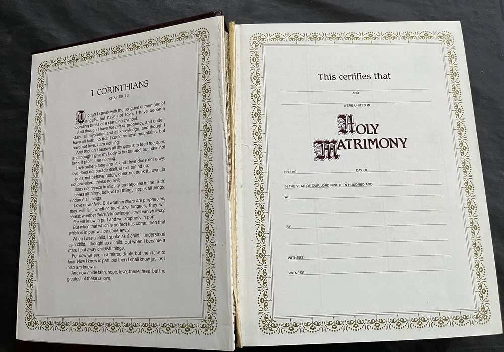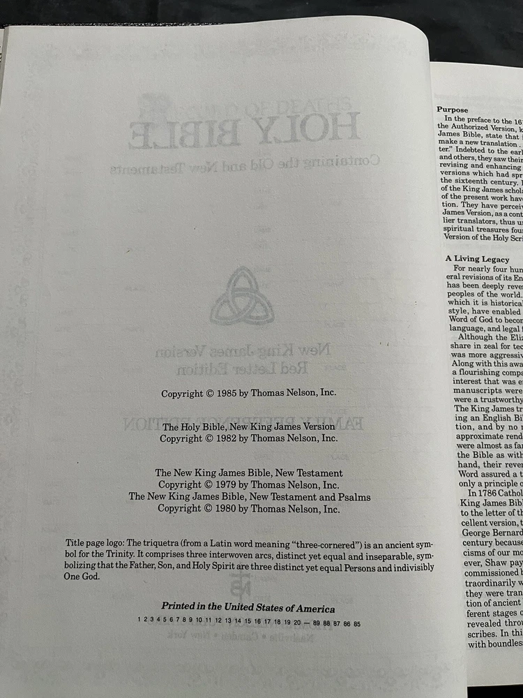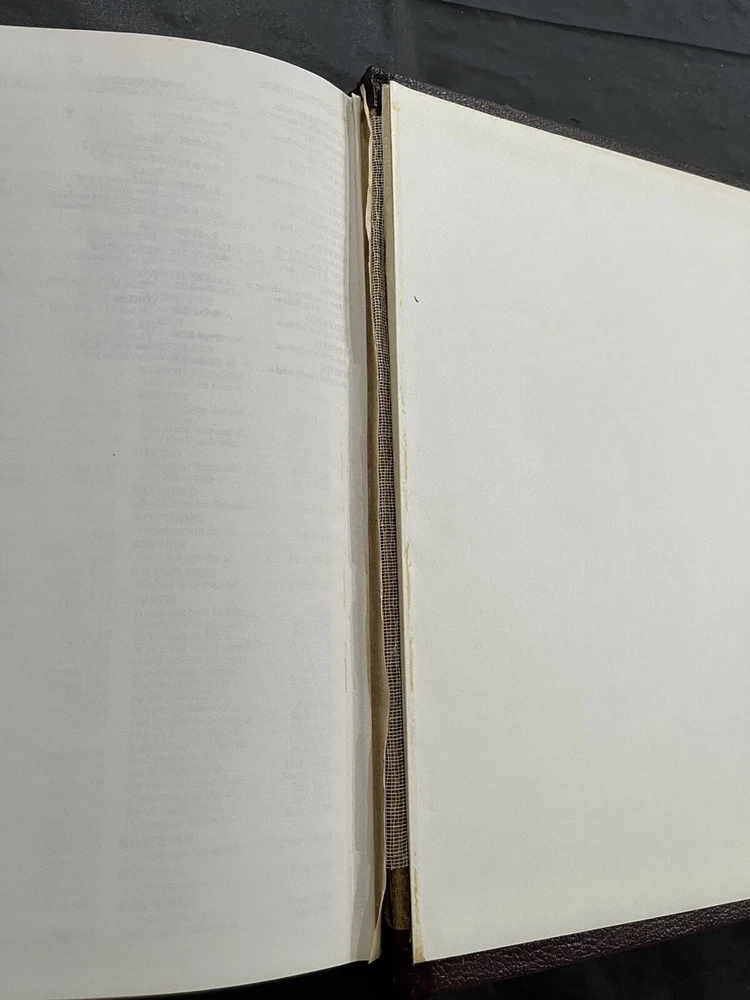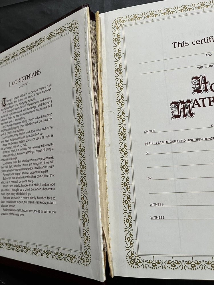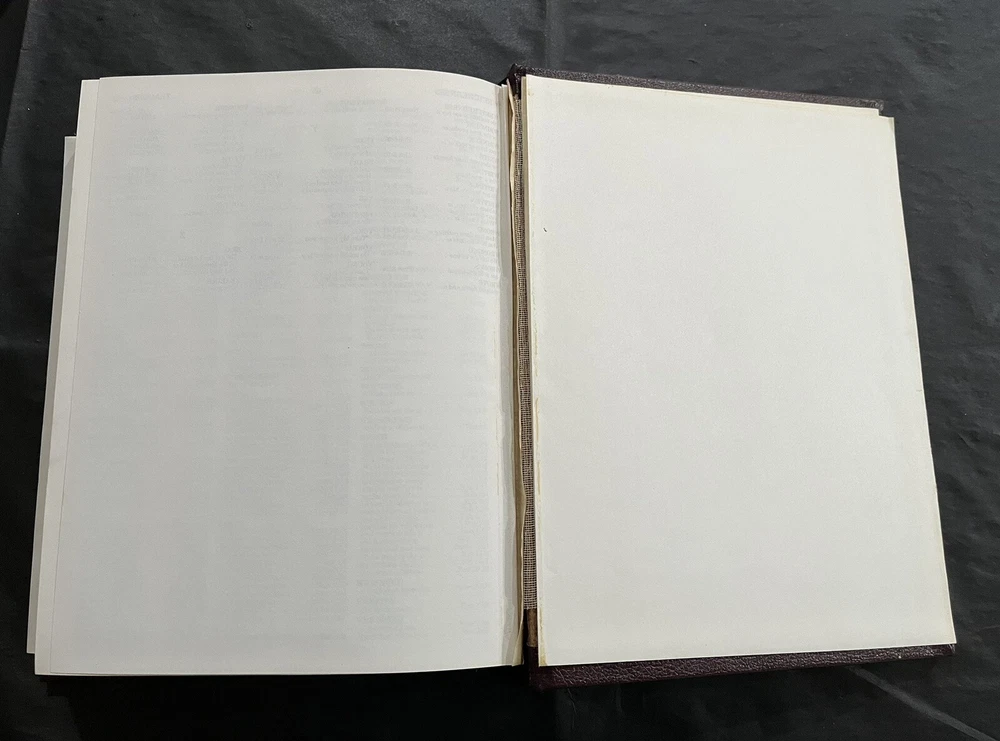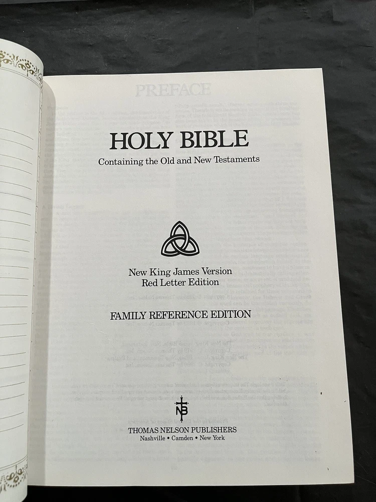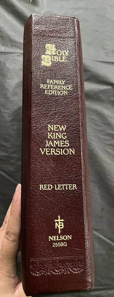 Acceptable condition. HC. Storage box has masking tape on top, peeling on bottom and bottom of storage box side flap is detached from corners. Inside hinge of Bible spine is visible (threading) with separation (front and back of Bible). Text block has mild whitish stain. No damage pages, no tears, creases, writing or highlighting throughout Bible. Please see all photos. Feel free to ask questions.
