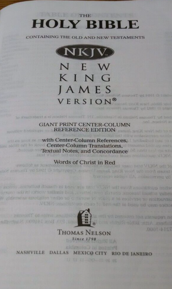 Dive into your daily readings with the Holy Bible NKJV Giant Print Center Column Reference Edition. This comprehensive Bible, bound in faux leather, features a generous 1 5/8" type size for a comfortable reading experience. The full-length text of the New King James Version with cross references for both personal reflection and scholarly study. The Bible is crafted with care in the United States and published by Thomas Nelson Incorporated, ensuring a high-quality print edition that's durable for regular use. With 1855 pages of rich, historical content, this nonfiction piece is designed for both young adults and adults seeking spiritual enlightenment and a deeper understanding of religious texts.