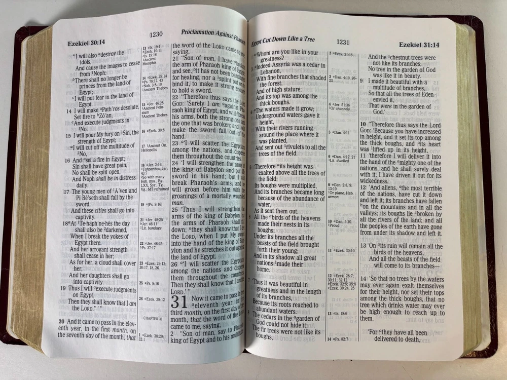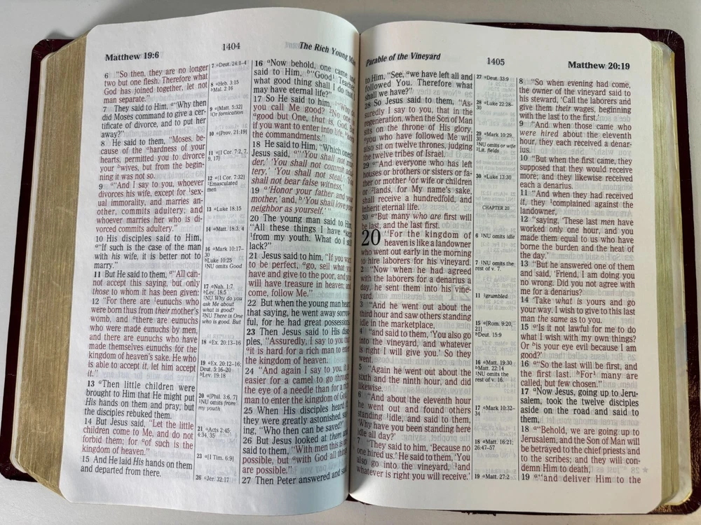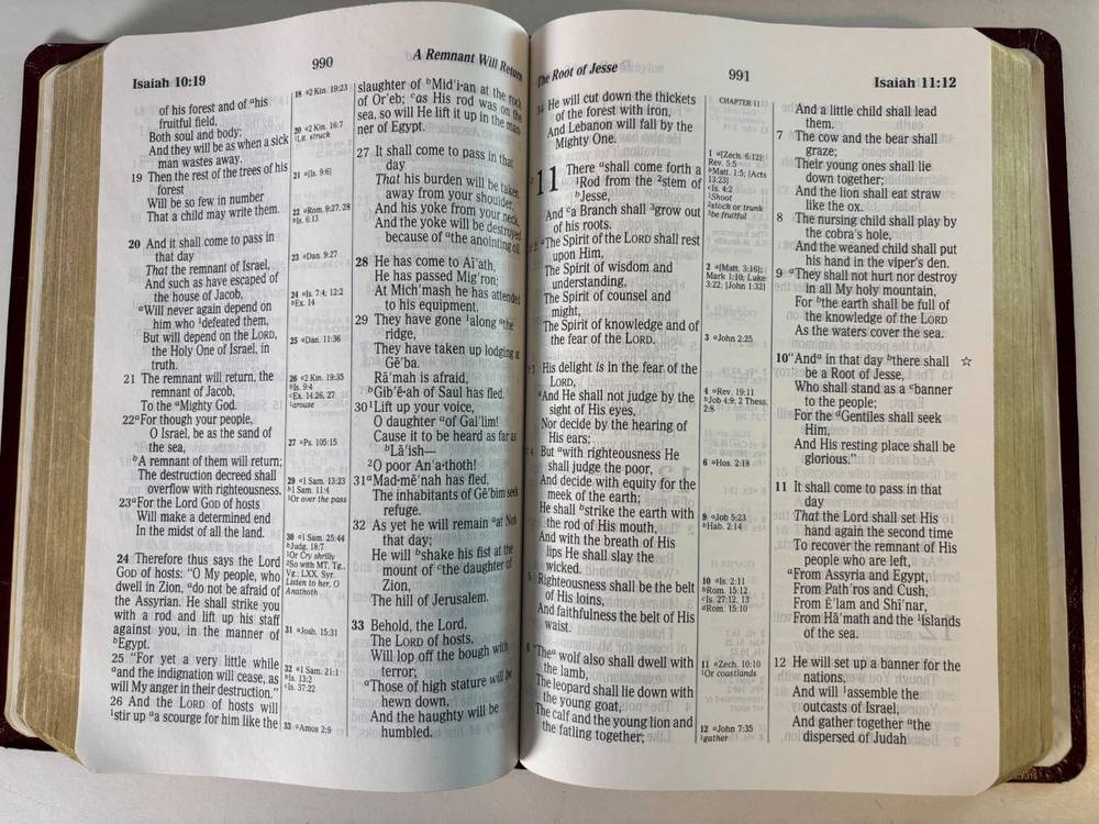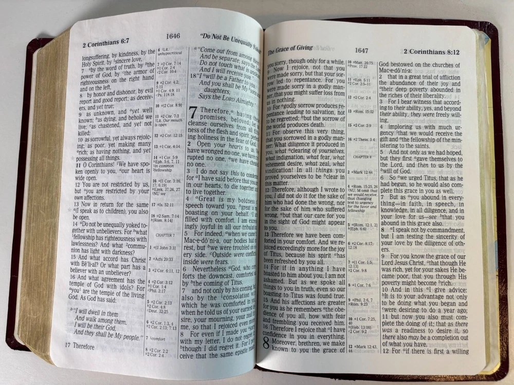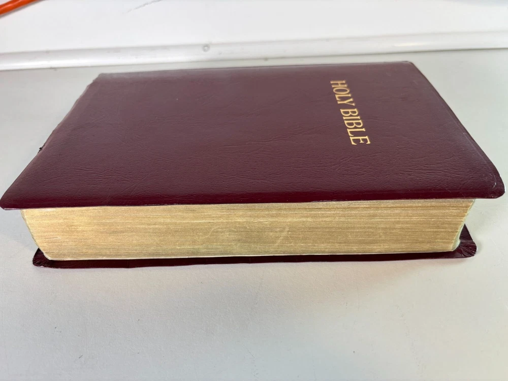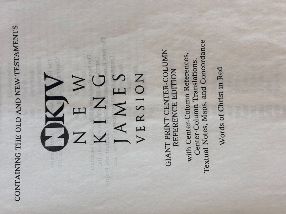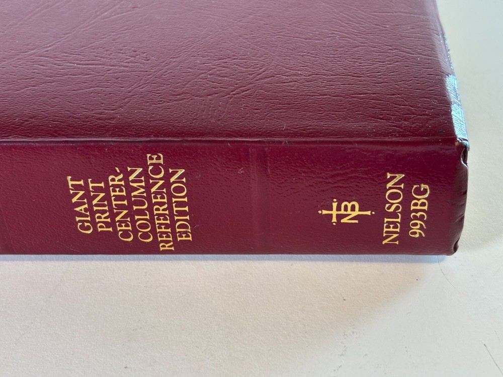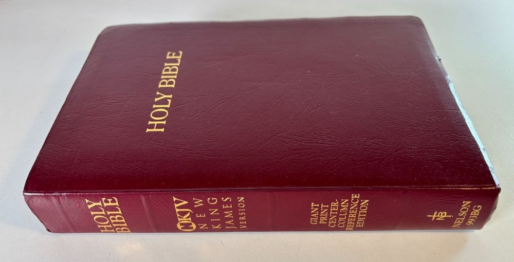 This NKJV Bible is designed with a giant print for easier readability, featuring center-column references, red words of Christ, and a durable leather cover. • Giant print for enhanced readability • Center-column references for in-depth study • Includes textual notes, maps, and concordance • Words of Christ in red • Durable leather cover for longevity Slight corner wear on the cover. Height = 9.5 inches, Width = 6.5 inches, Thickness = 2 inches.