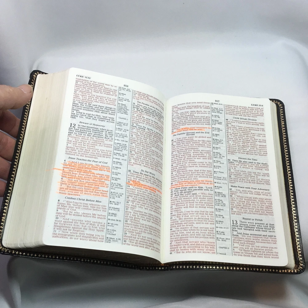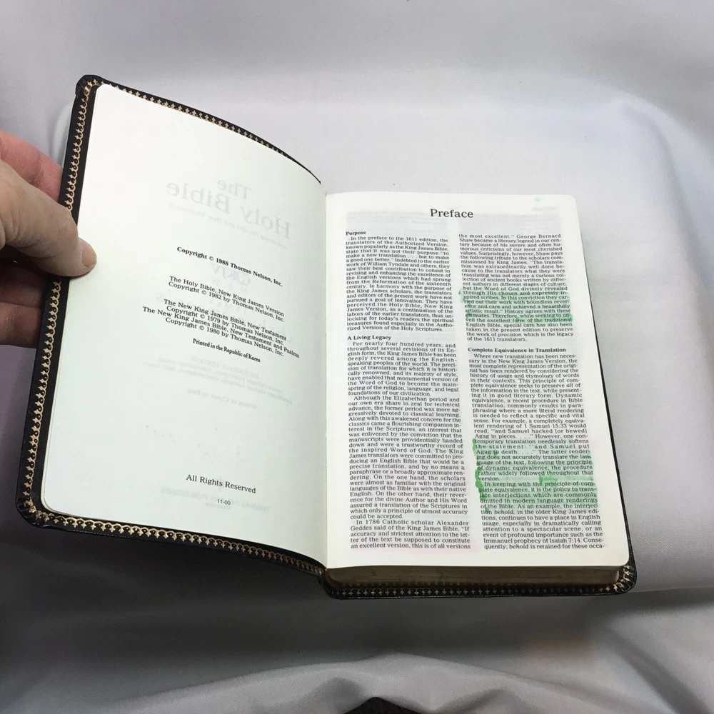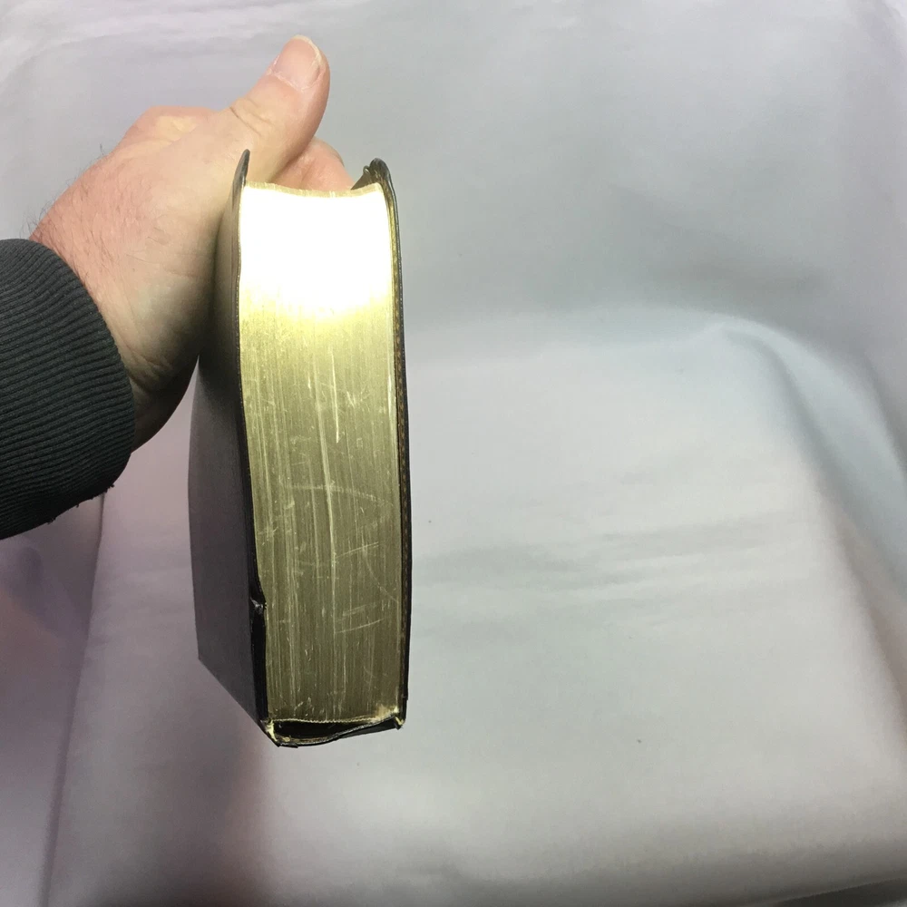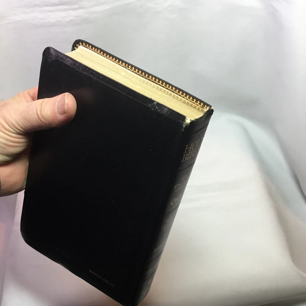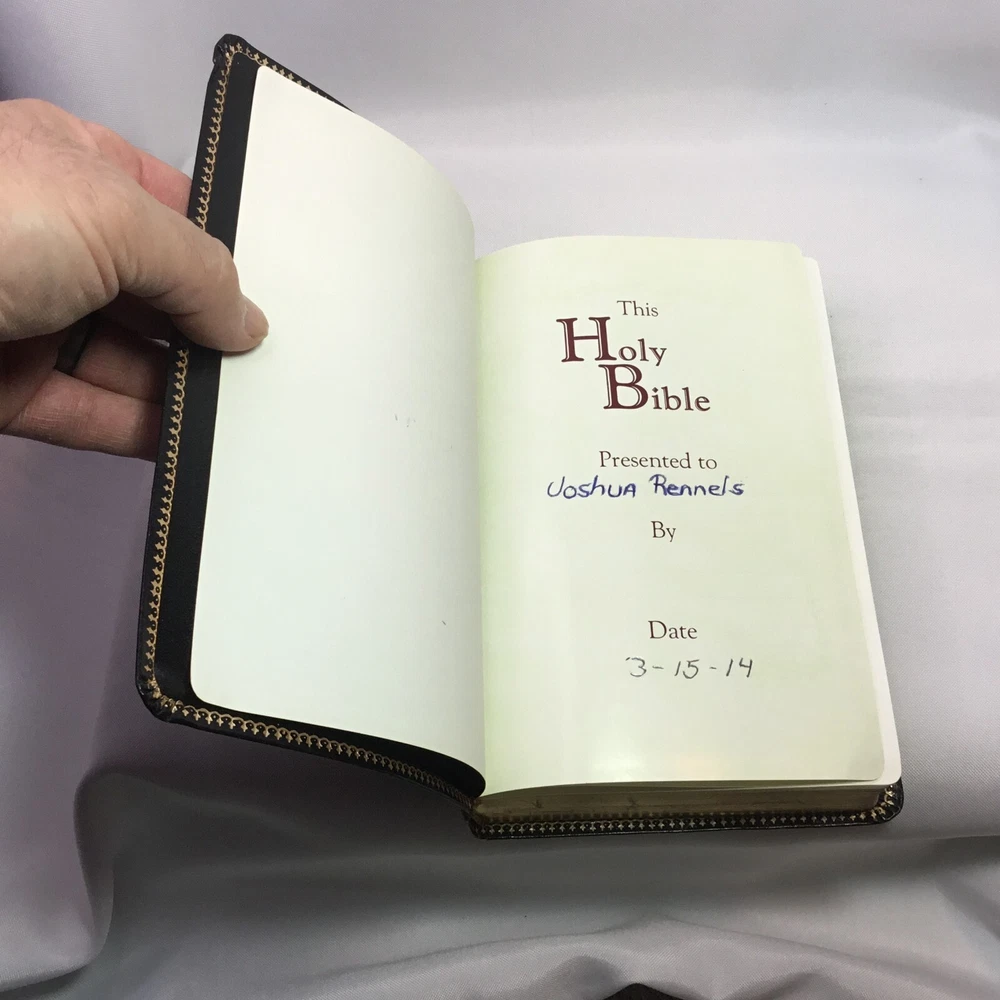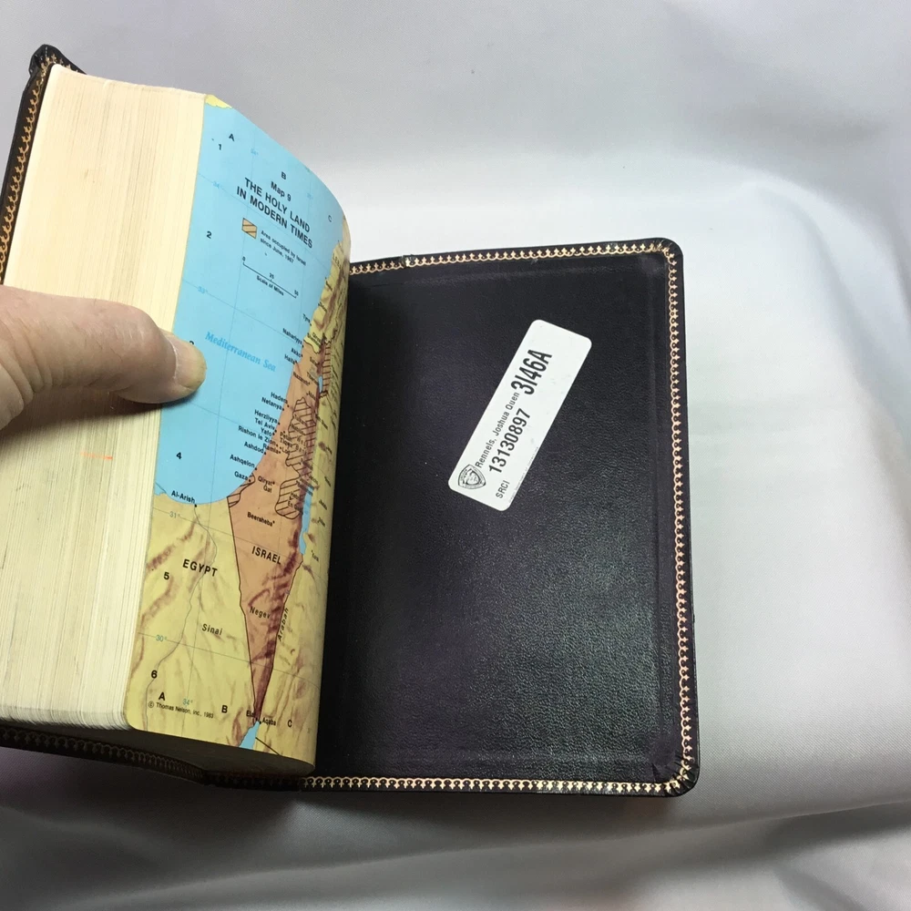 This Bible is in good used condition. There is a little damage to the leather at the top of the spine. This has been previously dedicated. This Bible is heavily highlighted. Please review all of the photos for condition. This item is cross posted.