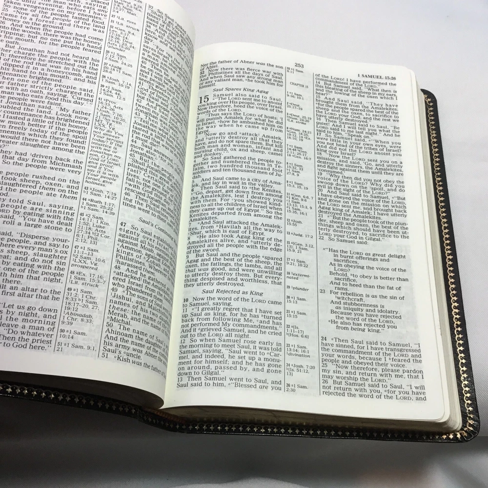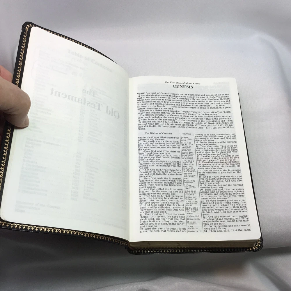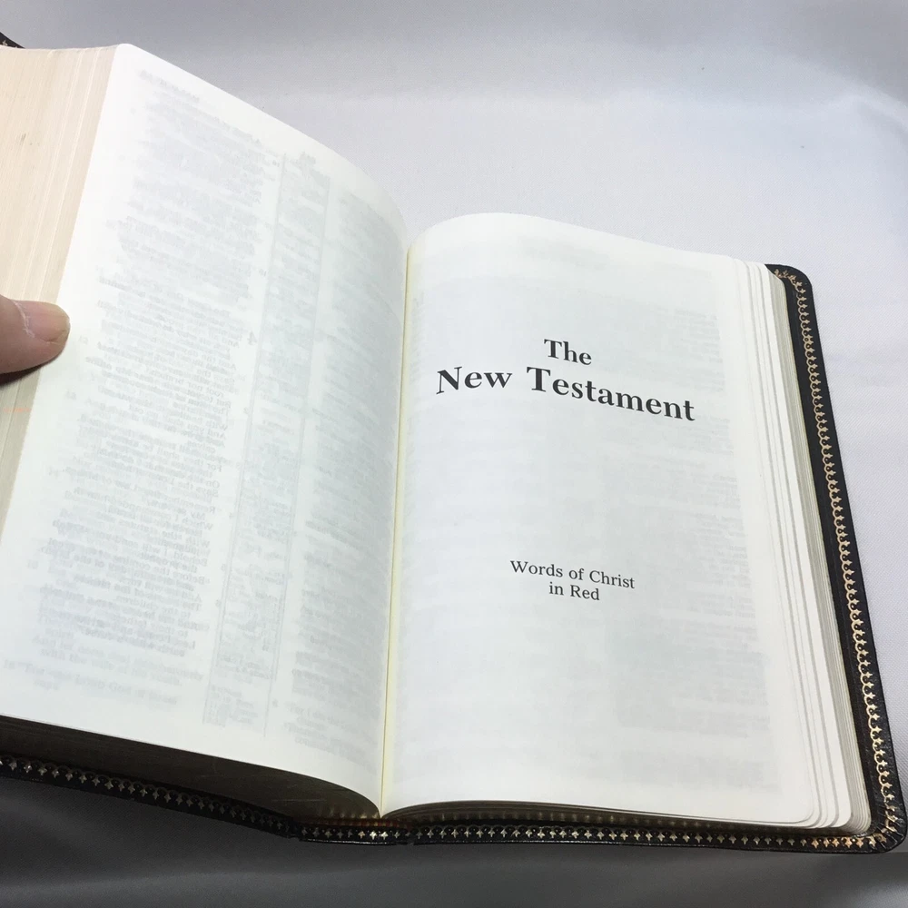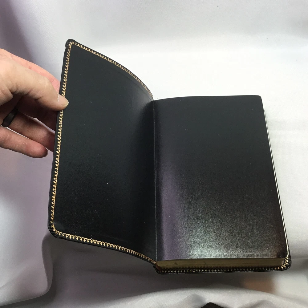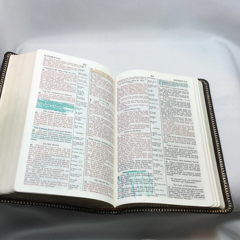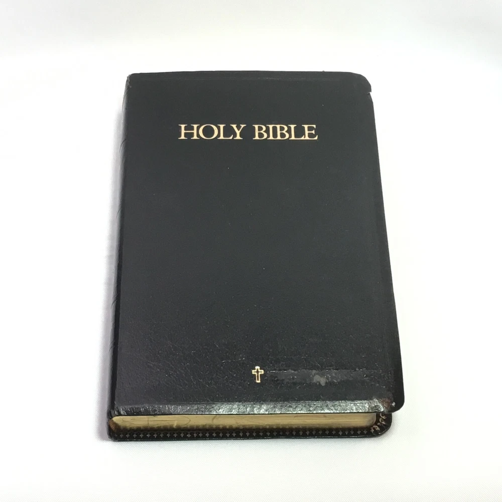This Bible is in good used condition. There is a little damage to the leather at the top of the spine. This has been previously dedicated. This Bible is heavily highlighted. Please review all of the photos for condition. This item is cross posted.