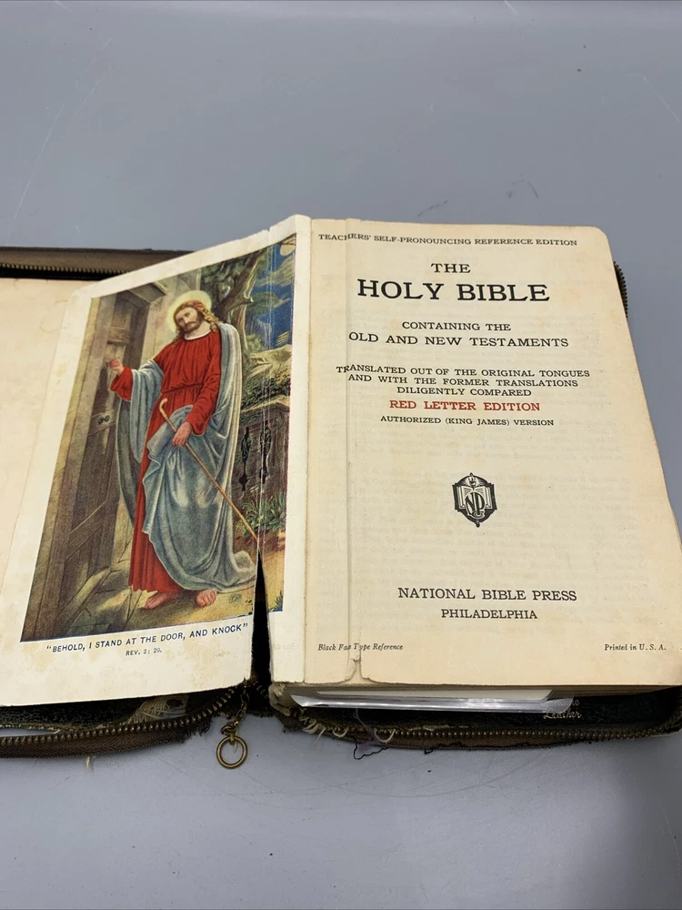 This Holy Bible is a rare and precious possession for any reader interested in religion and spirituality. It features a red letter teacher's edition with a zipper for easy navigation. The binding is made of high-quality leather, and the pages are filled with the original teachings of Christianity. The Bible was published by National Bible Press in Philadelphia, United States, and is an original edition. It is a teacher's self-pronouncing reference edition that is perfect for anyone looking to study the Bible. This item is a must-have for collectors and believers alike, and is sure to be a cherished addition to any collection.
