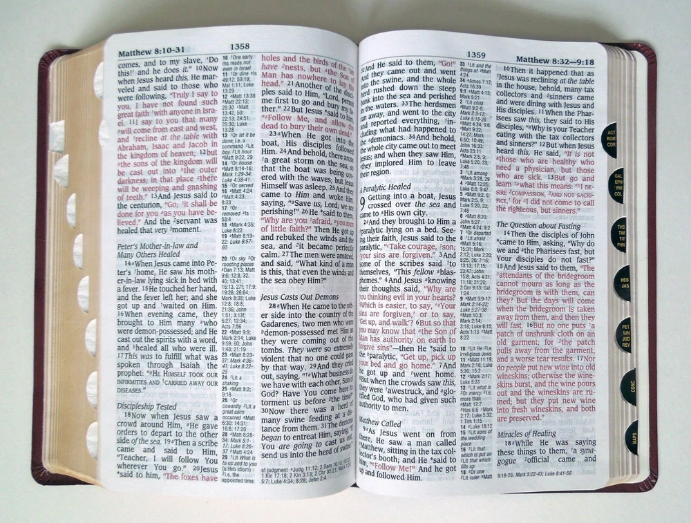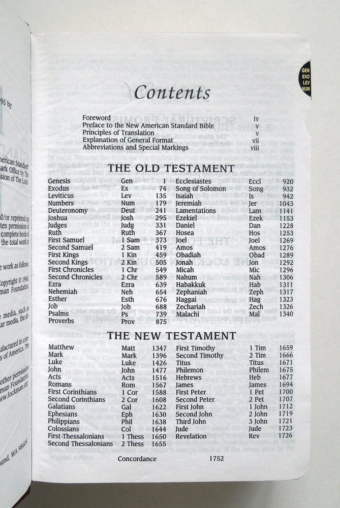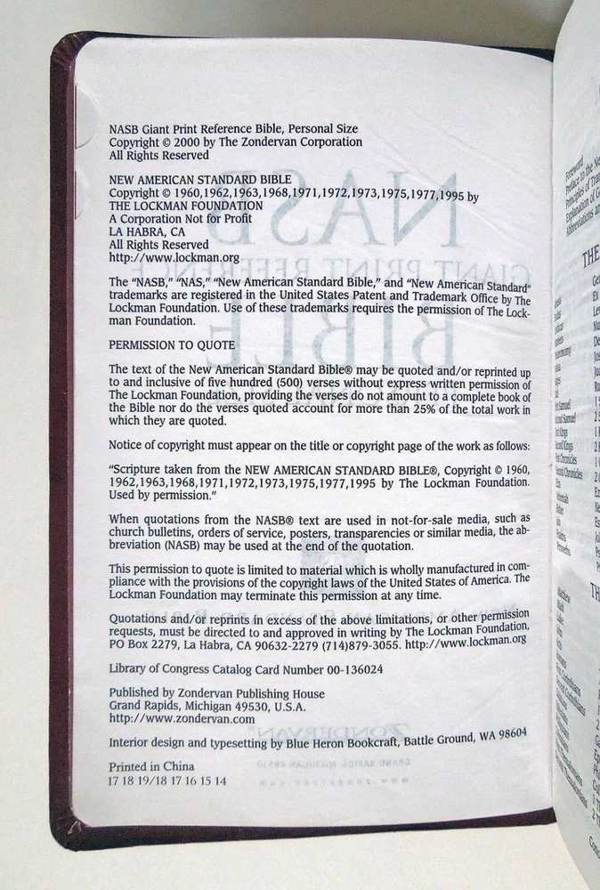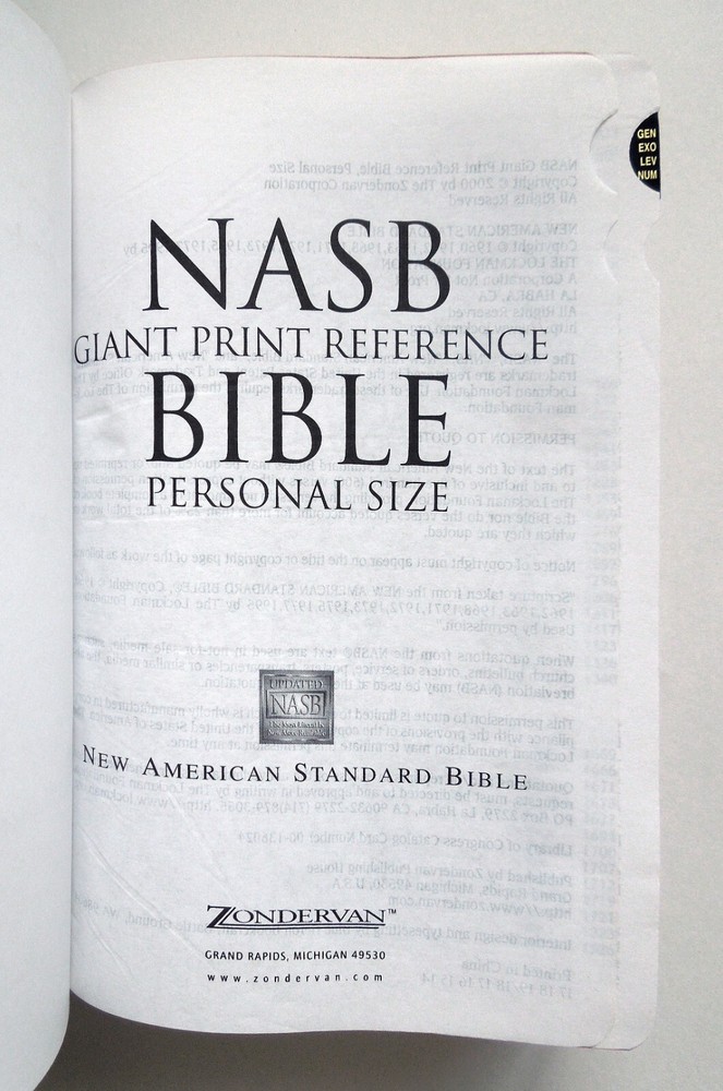 HOLY BIBLE Reference Edition 2000. 1,814pgs. ISBN: 9780310916504. Softcover edition (faux leather). Published by Zondervan. Good; some cover wear. Writing on presentation page; otherwise it appears to be free of markings. Approx: 5 1/2" x 8 7/8" x 1 1/2", 2lb. Complete and unabridged. New American Standard Bible (NASB). Features: Center reference column. Red letter edition (words of Christ in red ink). Thumb tabs. Book introductions. Concordance. Maps. I do not use stock photos. Please read entire listing and look at photos provided before purchasing. All items sold "as is." All sales final. SHIPPING METHOD: Media Mail. Shipping total is calculated by Ebay. I will ship your item as fast as I can after purchase. INFORMATION: I ship only to addresses in the United States. Please make sure that your mailing address is correct before you buy. I cannot ship on weekends (Saturdays and Sundays) or federal holidays. Handling time is (5) business days, though often less. ( Please note that Ebay considers the first day following purchase to be day one of the potential five, and does not include either weekends or federal holidays ). I try my best to describe each item, though please bear in mind that I am not a professional appraiser. Thank you very much for looking at my item! I invite you to look at all of the many other items that I am currently selling on Ebay. Have a great day! :)