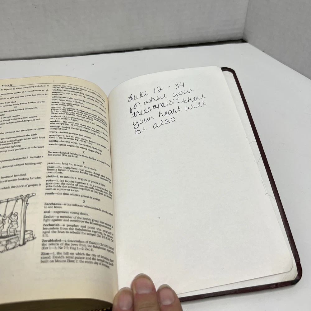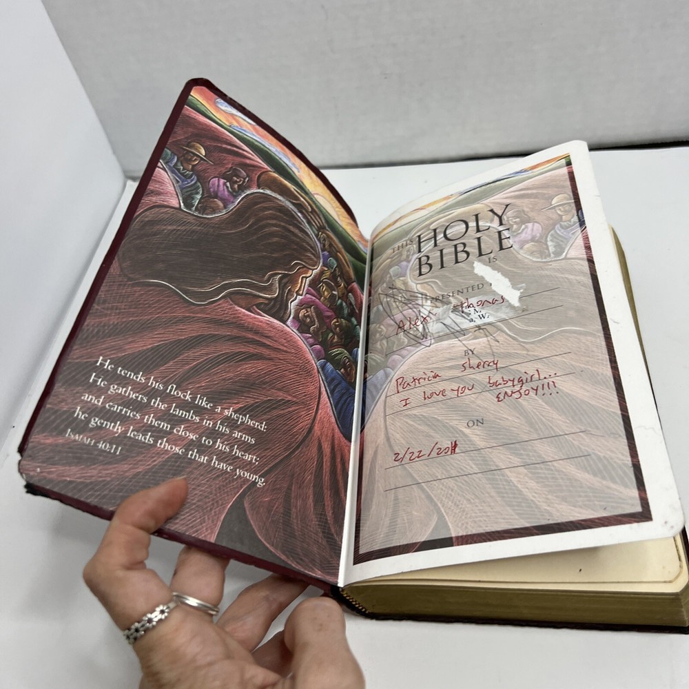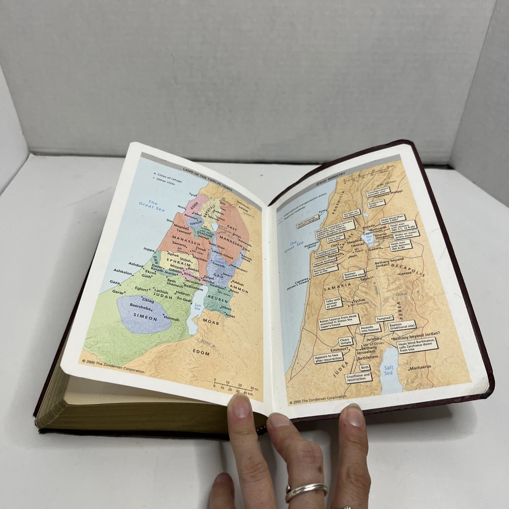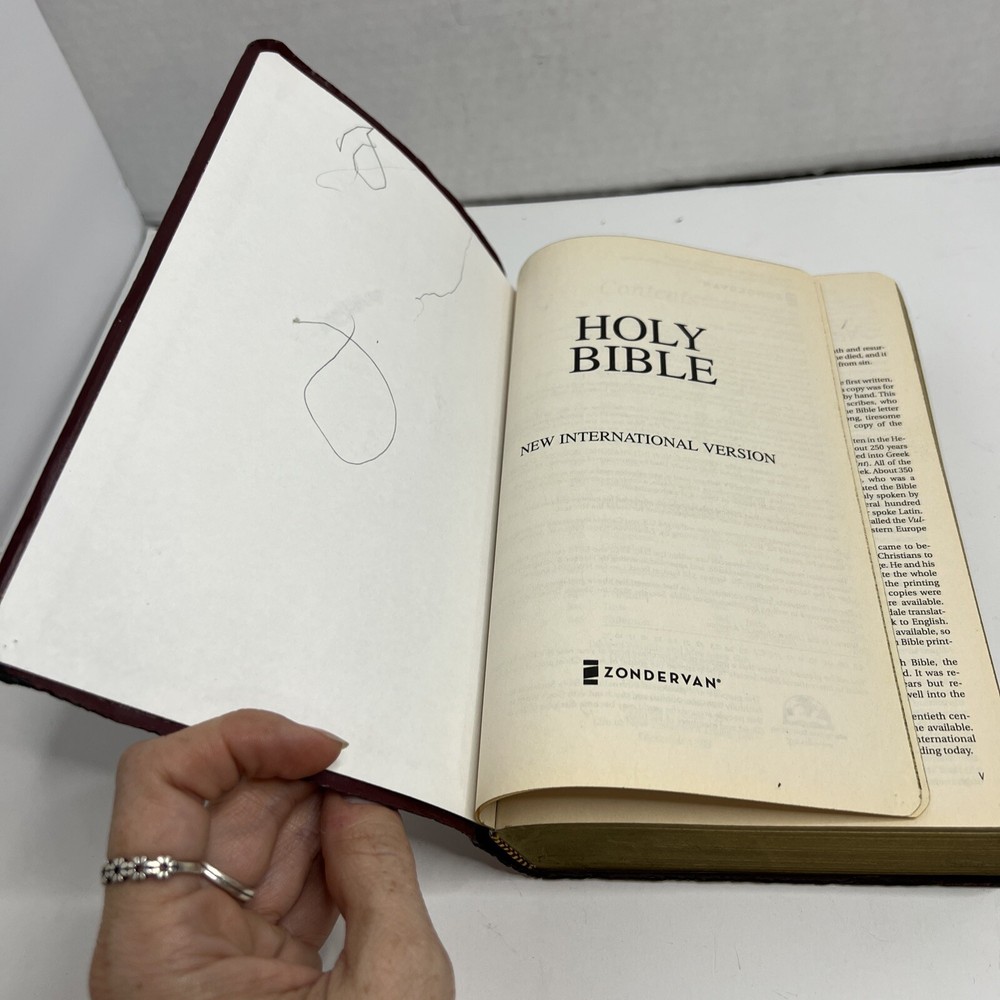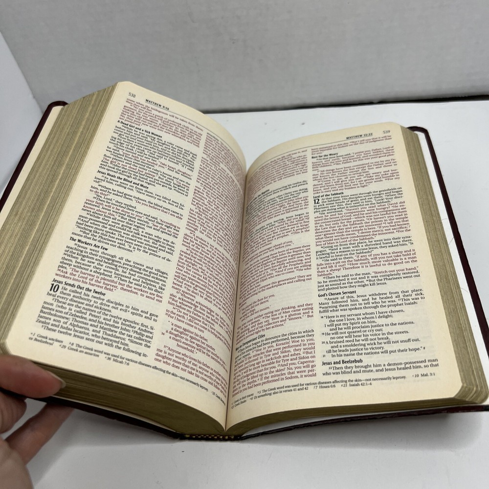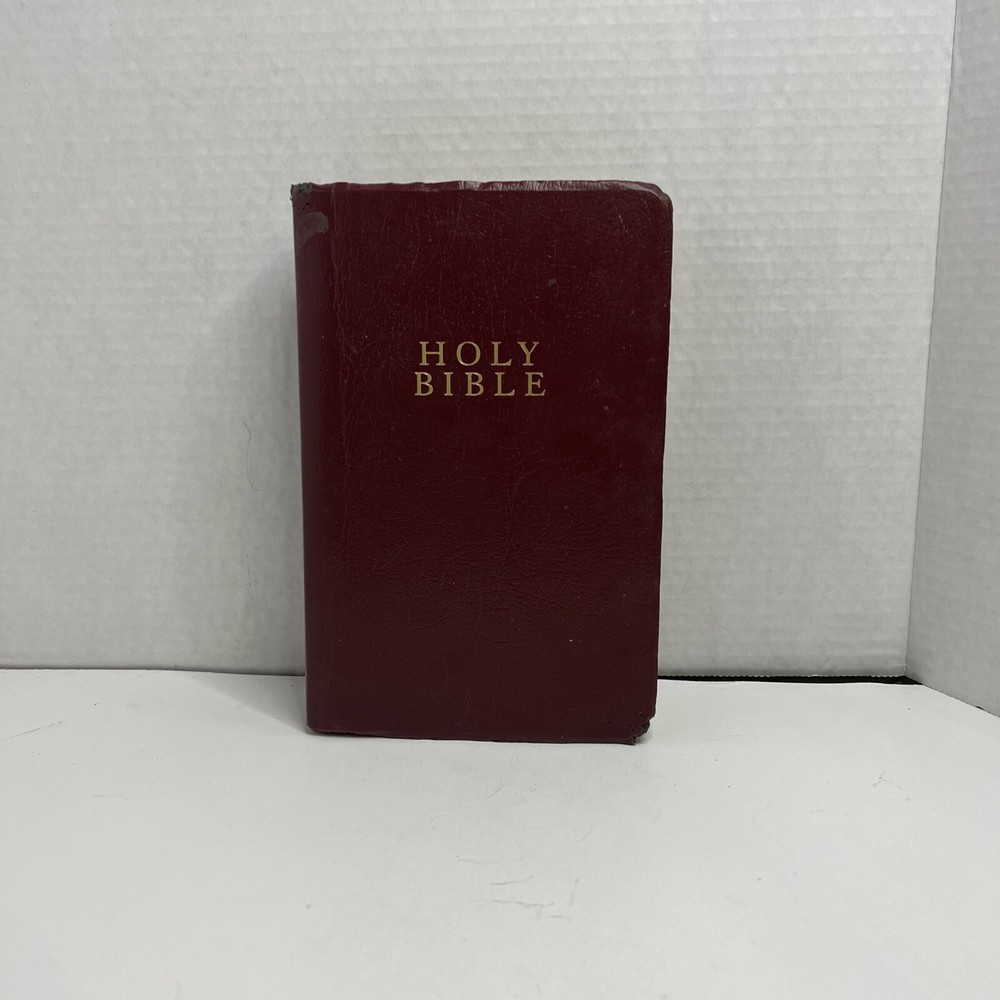 Holy Bible New International Version NIV Red Leather Bound Reference Red Letter, reference pages in the back including weight and measurements, overviews of both Testaments, Bible verses locations of Jesus teachings, Dictionary of Bible terms. and 2 maps. Listing is for a preowned item in great condition, some pages have writing on them including the "presented by" page, scribbling on a few pages in the back. leather cover has wear and tear on corners, please use all pictures for additional description. No returns