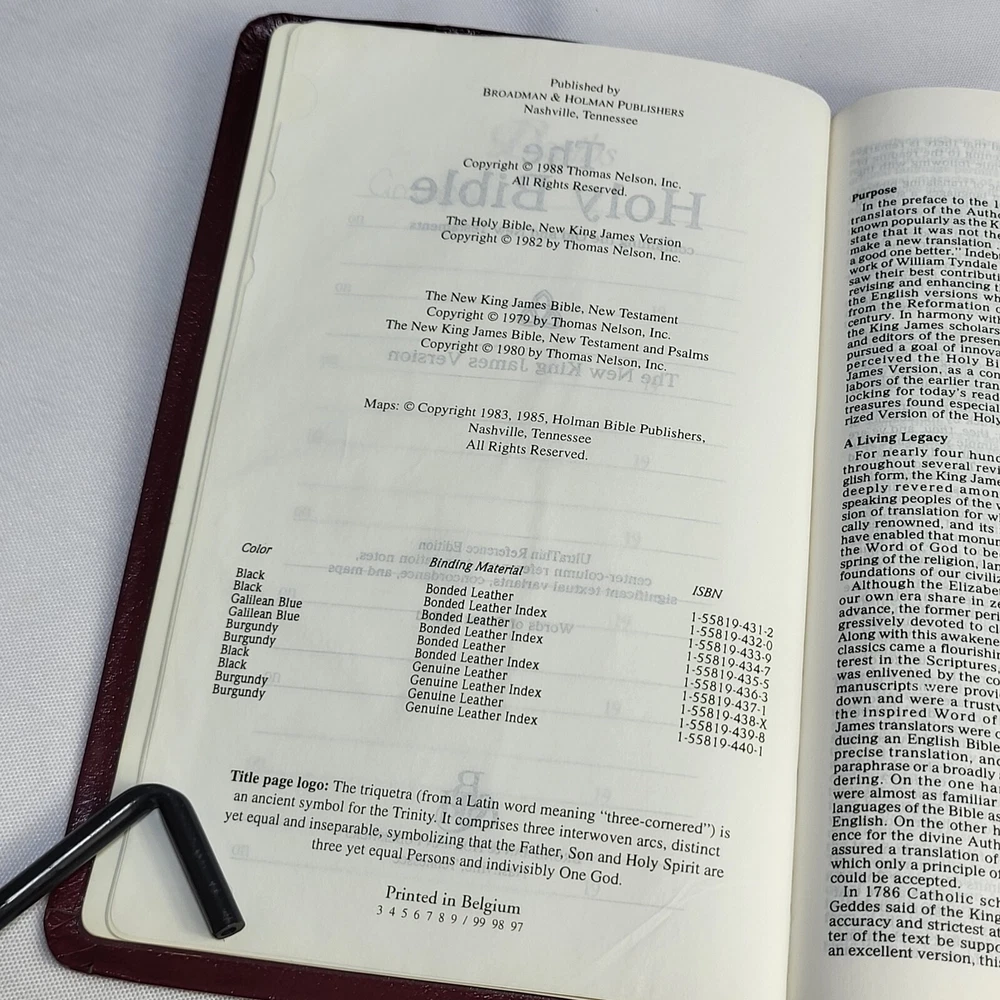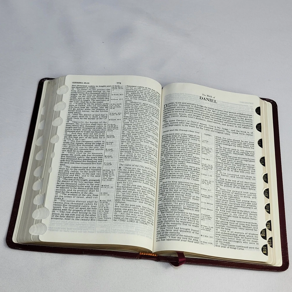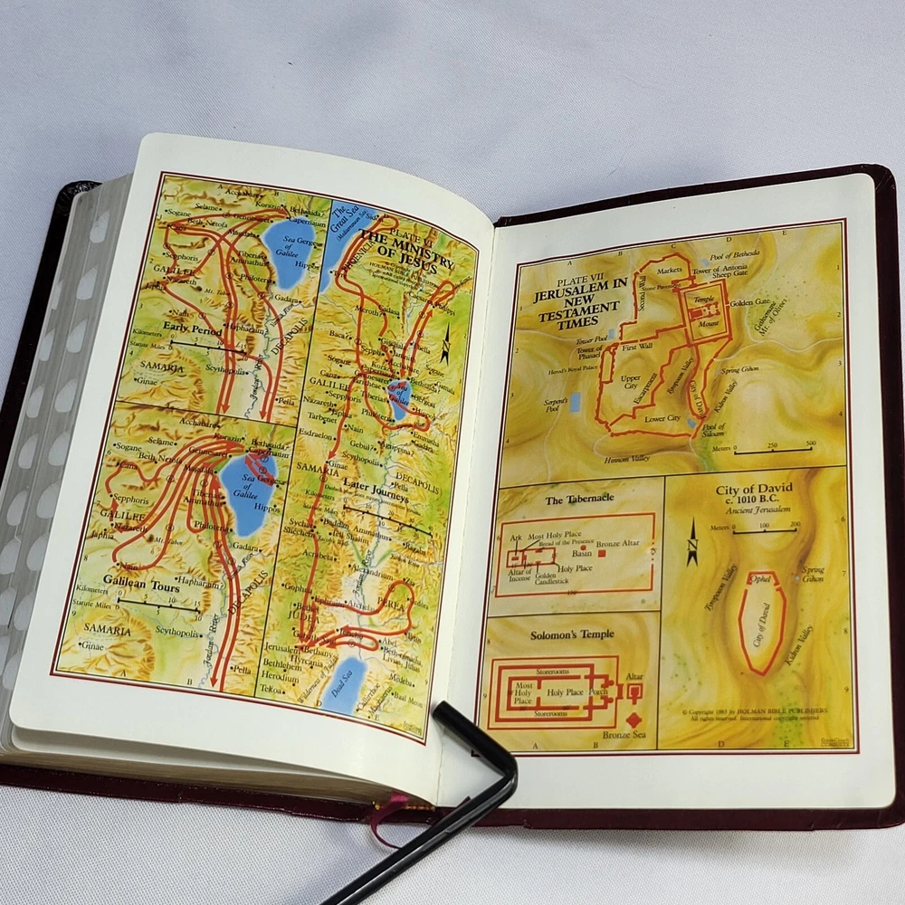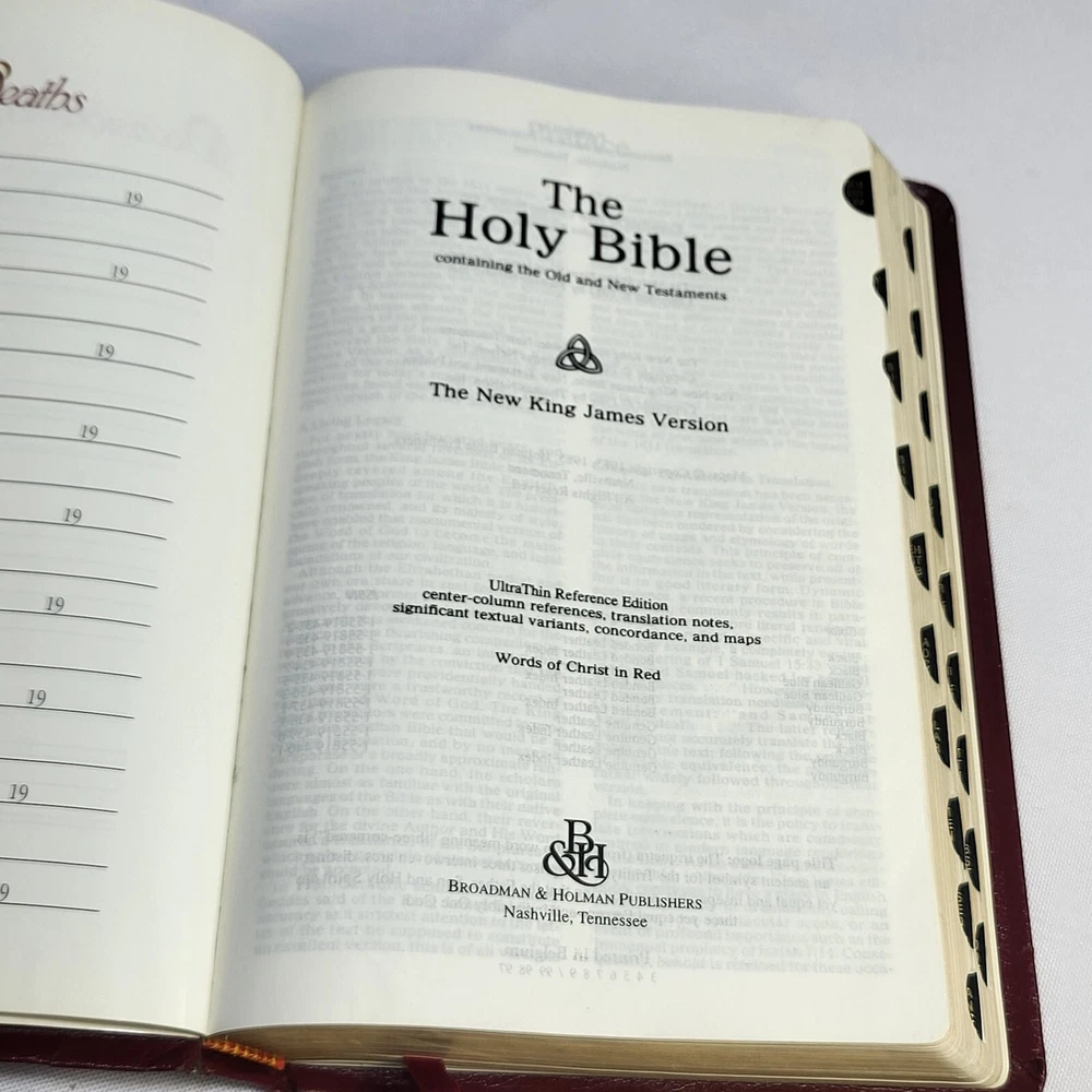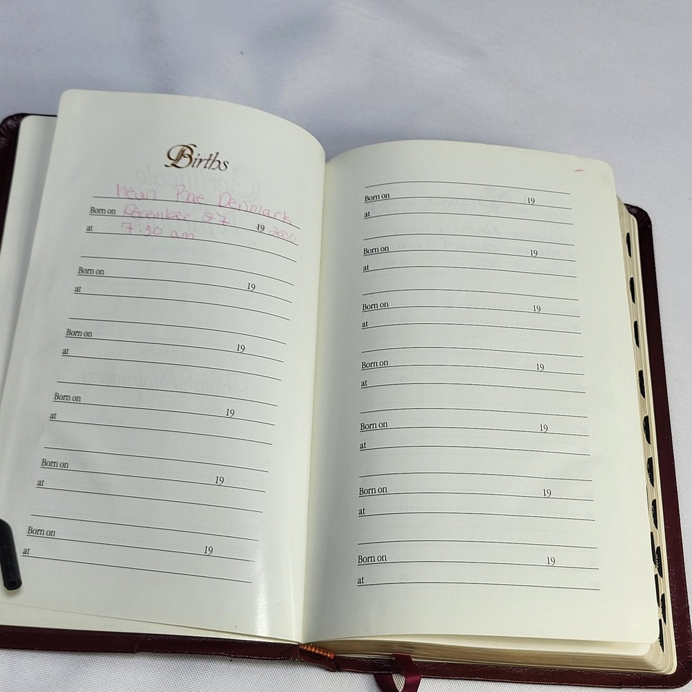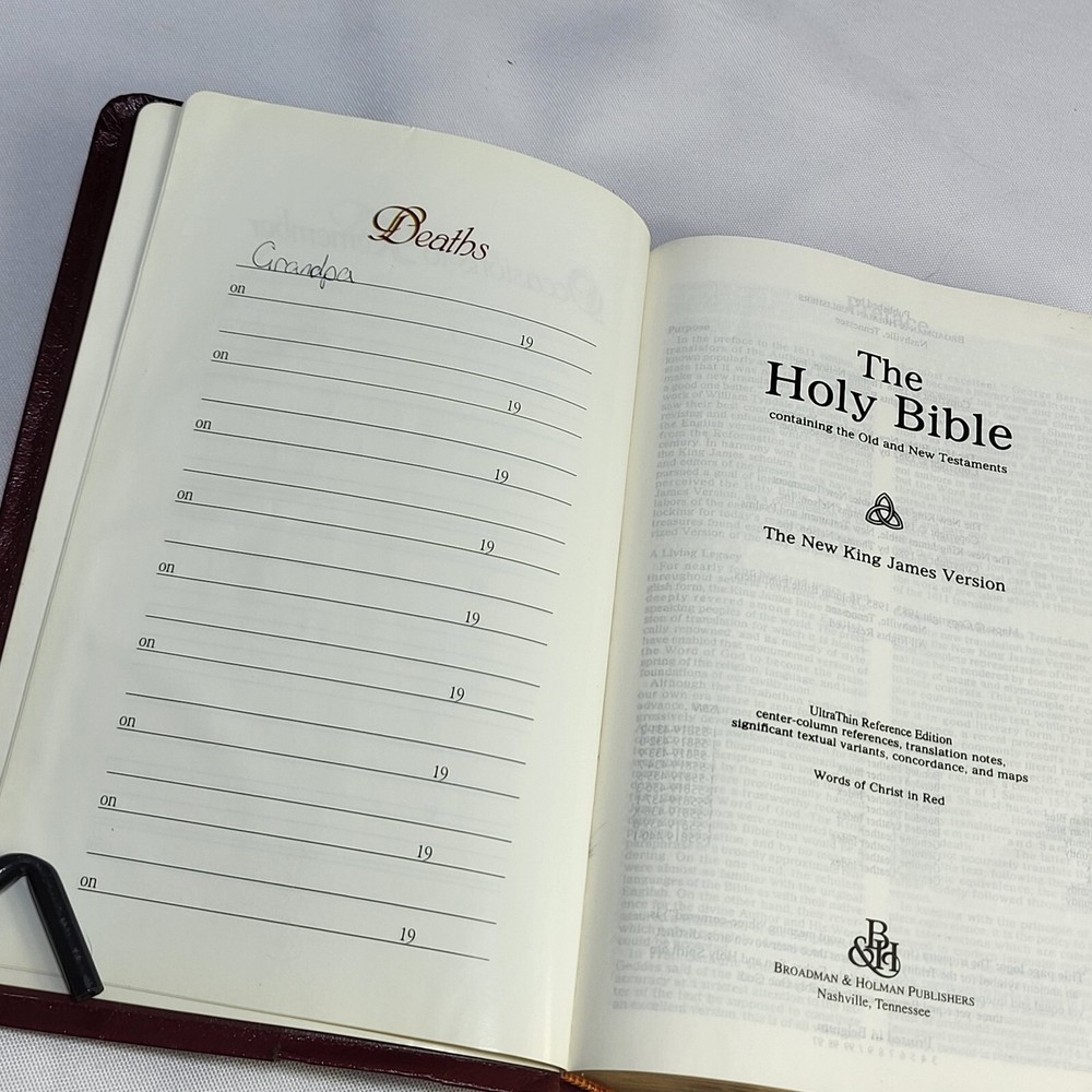 This Bible is in great condition for its age—no rips or tears, just some normal wear on the cover and spine. The red-letter text is clear, and the bonded leather feels sturdy. The previous owner’s name is embossed, and there are a few notes inside, but it doesn’t distract from reading. Perfect for daily use or study!
