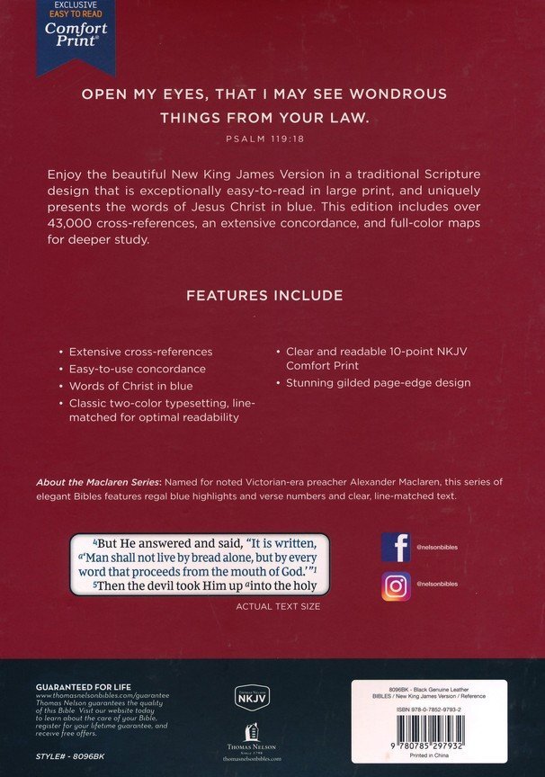 Holy Bible : New King James Version, Black, Genuine Leather, Blue Letter, Comfort Print, Paperback by Thomas Nelson Publishers (COR), ISBN 0785297936, ISBN-13 9780785297932, Like New Used, Free shipping in the US This NKJV Large Print Thinline Bible is inviting to pick up and hard to put down. Unique to this edition, the words of Christ are highlighted in a restful blue ink that’s easy to read and colorblind friendly. The slim design of the NKJV Large Print Thinline Reference Bible means you can bring it along, wherever your day takes you. This large print edition features Thomas Nelson’s NKJV Comfort Print ® , designed to provide a smooth reading experience of the accurate and beautiful New King James Version. And with features including extensive cross-references, a concordance, and full-color maps, you’ll still have the tools to get more out of God’s Word. Features include: Presentation page to personalize this special gift by recording a memory or a note Words of Christ in blue quickly identify verses spoken by Jesus Double column provides a nice readable flow of the text End-of-page cross-references and translator notes allow you to find related passages quickly and easily Concordance for finding a word’s occurrences throughout the Bible Full-color maps show a visual representation of Israel and other biblical locations for better context Durable Smyth-sewn binding lies flat in your hand or on your desk Two satin ribbon markers for you to easily navigate and keep track of where you were reading Elegant, gilded page-edge design Clear and readable 10-point NKJV Comfort Print About the Maclaren Series: Named for noted Victorian-era preacher Alexander Maclaren, this series of elegant Bibles features regal blue highlights and verse numbers and clear, line-matched text. Trusted by millions of believers around the world, the NKJV remains a bestselling modern “word-for-word” translation. It balances the literary beauty and familiarity of the King James tradition with an extraordinary commitment to preserving the grammar and structure of the underlying biblical languages. And while the translator’s relied on the traditional Greek, Hebrew, and Aramaic text used by the translators of the 1611 KJV, the comprehensive translator notes offer important insights about the latest developments in biblical manuscript studies. The result is a Bible translation that is both beautiful and uncompromising—perfect for serious study, devotional use, and reading aloud.