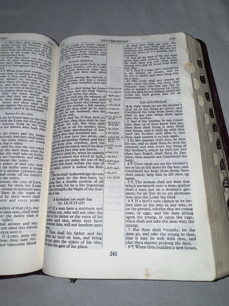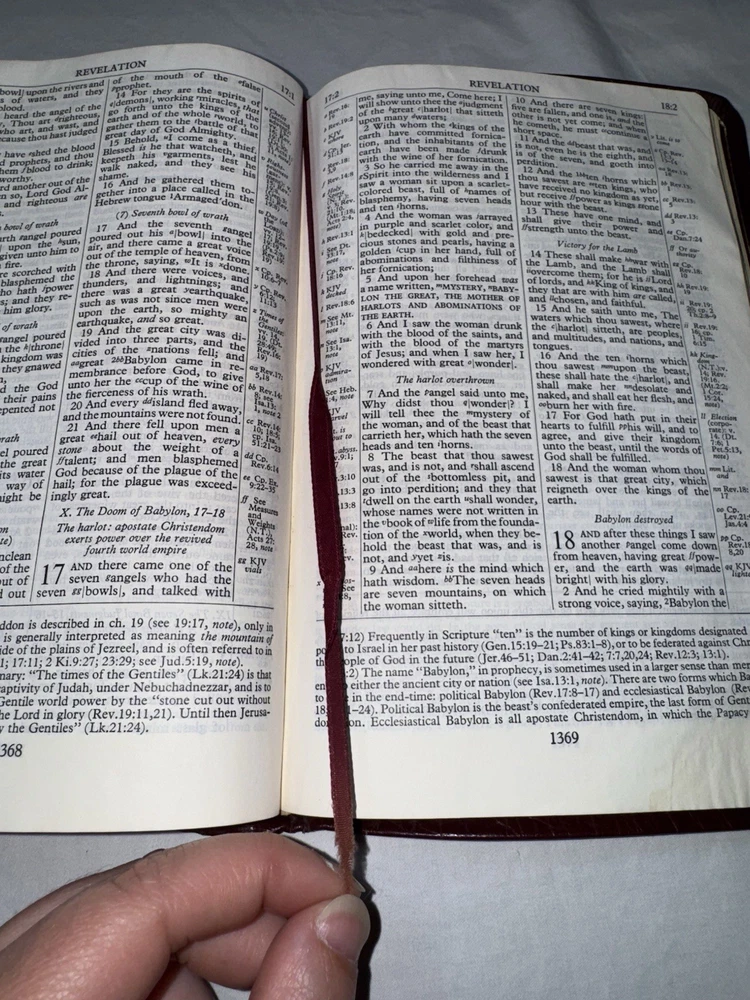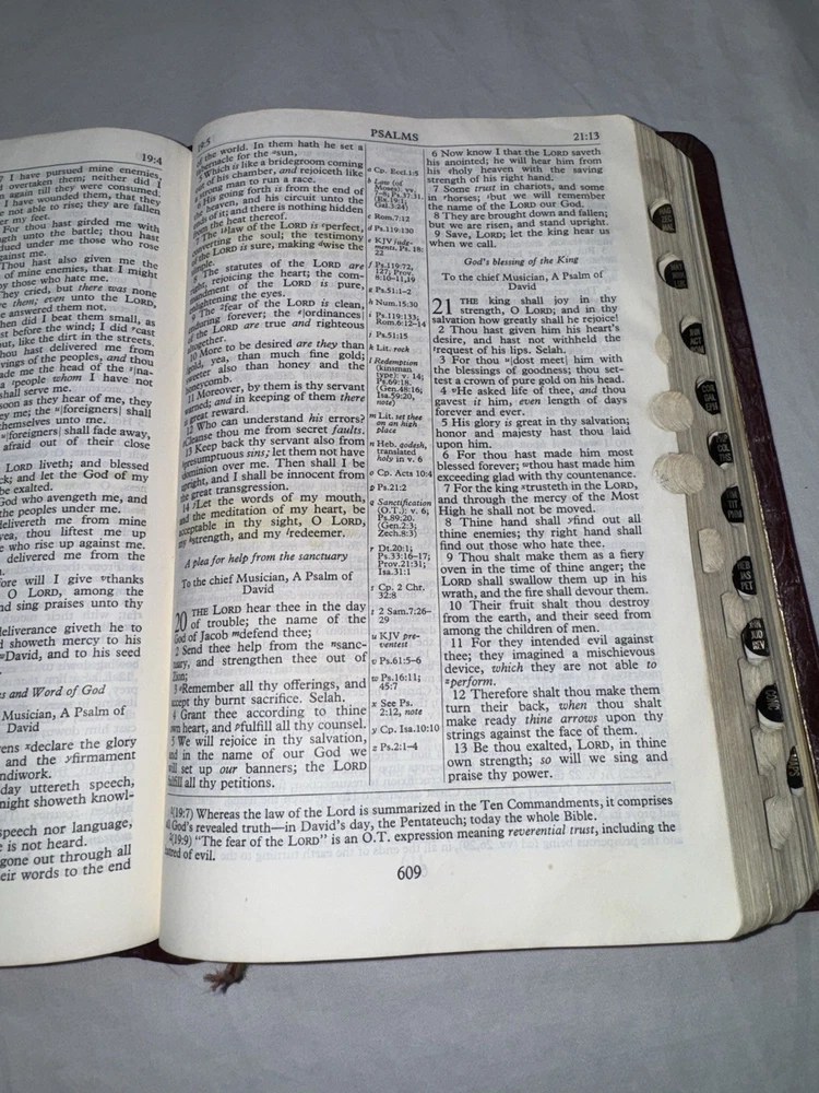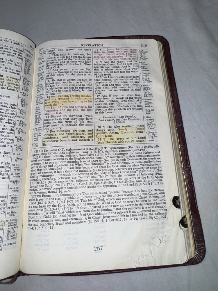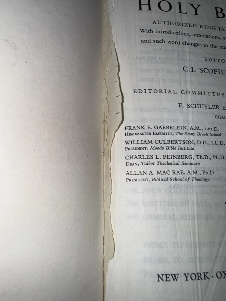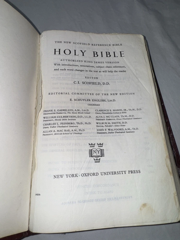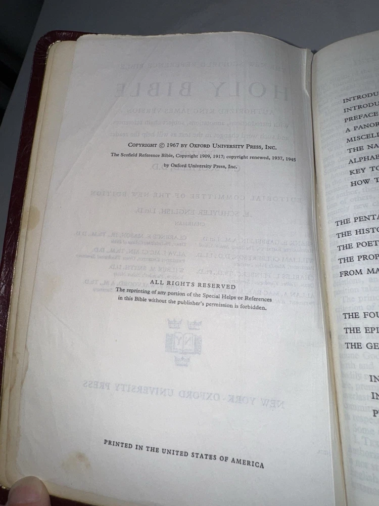This is a 1967 The New Scofield Reference Bible. This Bible is in rough condition. It has several front pages ripped out (this doesn’t affect the reading). Bible does have wear, marks, stains, scratches, torn pages, the binding is pulled up in several spots, writing on the inside of the back covers, etc. There is some yellowing to pages & a slight musty smell. There is a lot of highlighting/ underlining and small notes in this Bible. Please see all photos. While this Bible is heavily used it still has life left in it. Please see all photos. PLEASE READ: Payment is due within 4 days of end of auction. If you have any questions please ask PRIOR to purchase. I ship Monday- Friday, excluding holidays.