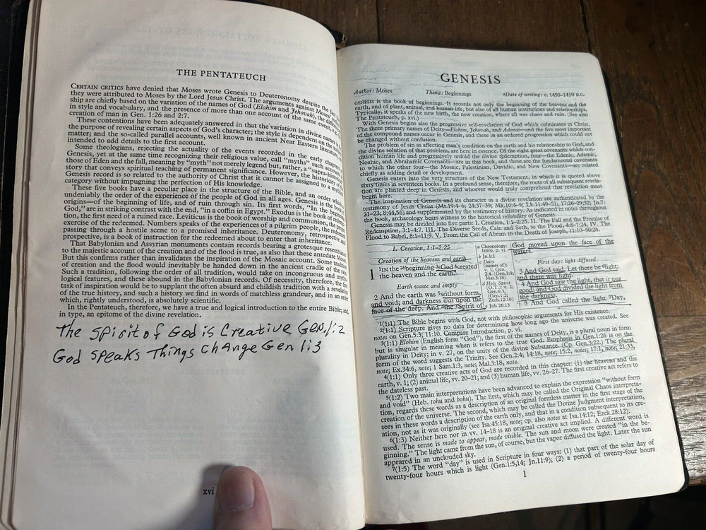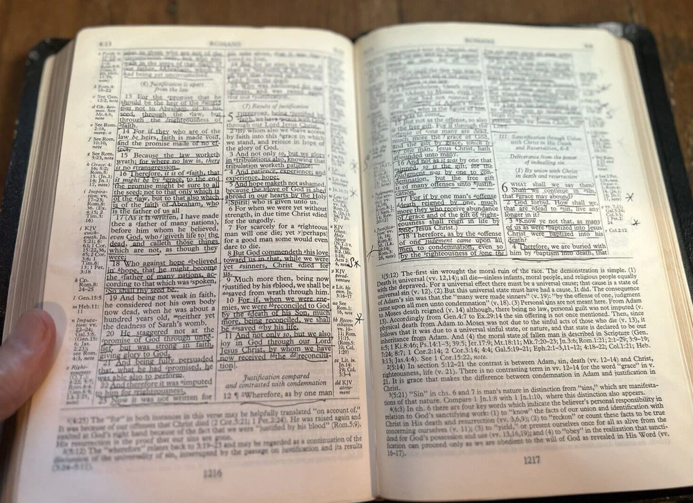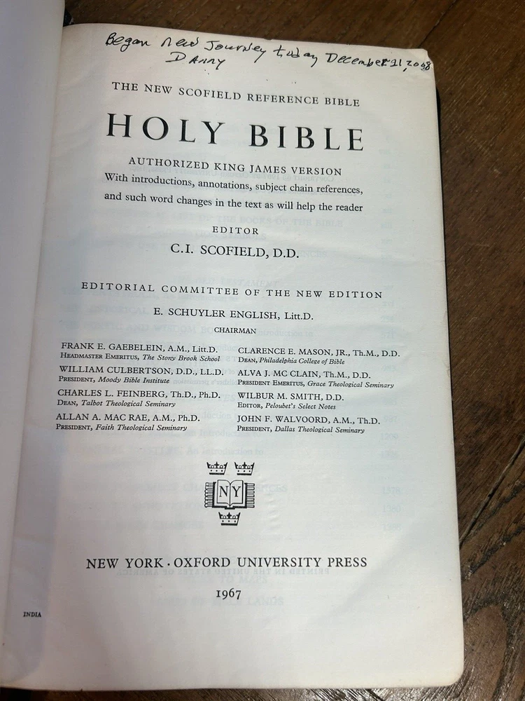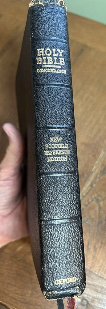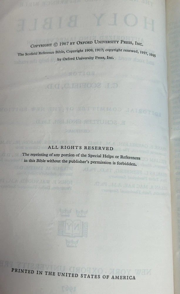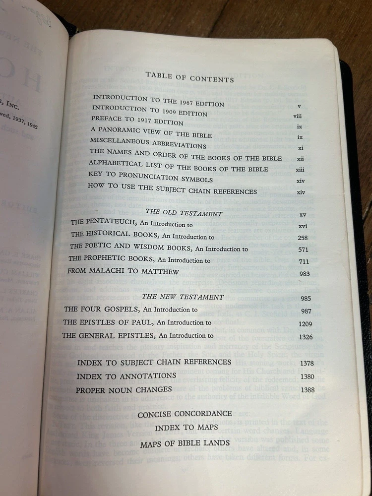 See pictures for best description. Bible is complete and well-bound. Scofield annotations. KJV. Prior owner has penned in underlined verses and handwritten notes in some books. These are mainly confined to Genesis (first 5 chapters), Psalms & Proverbs (only about 30 pages), Luke (5 or 6 pgs), Romans & First Corinthians (extensive). The other books have no or very few markings. I did not do a page by page inventory of this Bible but I think the above description is a very good idea of the extraneous markings. Book measures about 9 by 6 inches. The 9th pictures is of the table of contents. Thanks for viewing my item!