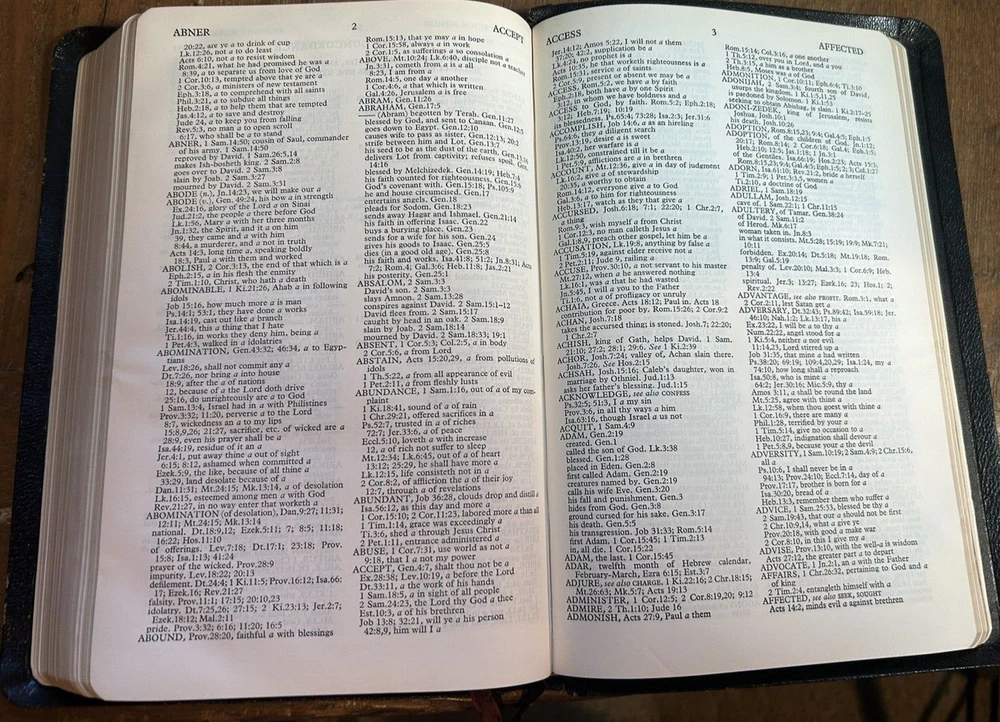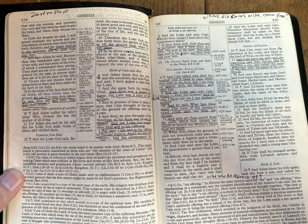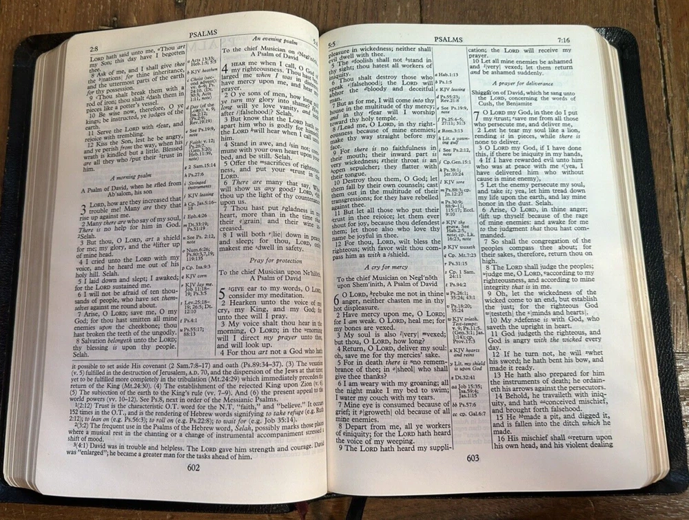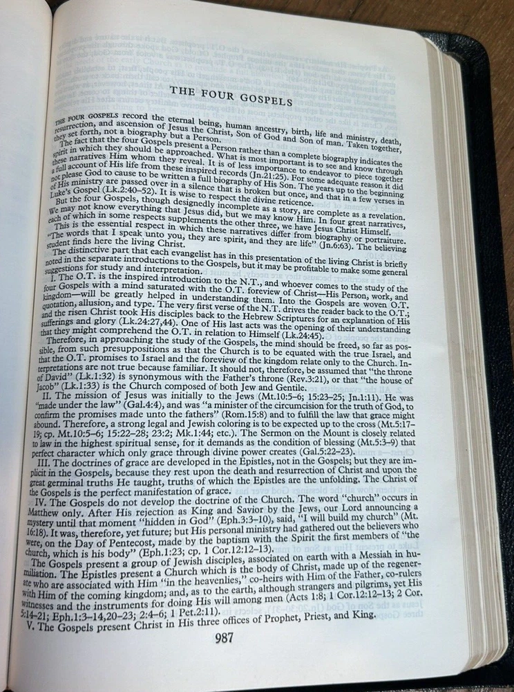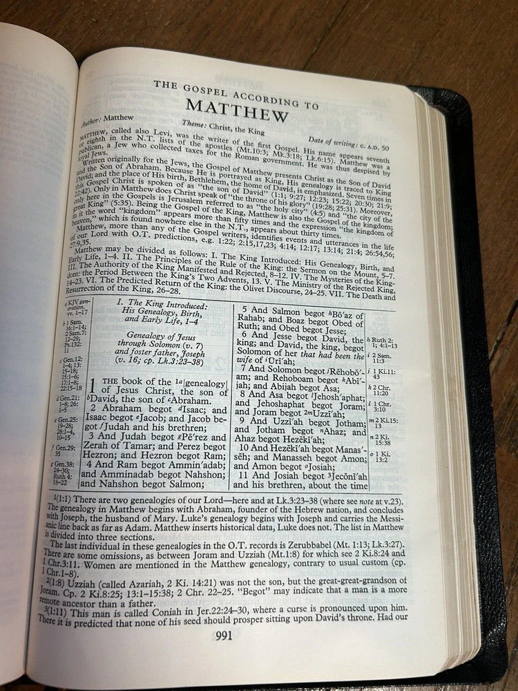 See pictures for best description. Bible is complete and well-bound. Scofield annotations. KJV. Prior owner has penned in underlined verses and handwritten notes in some books. These are mainly confined to Genesis (first 5 chapters), Psalms & Proverbs (only about 30 pages), Luke (5 or 6 pgs), Romans & First Corinthians (extensive). The other books have no or very few markings. I did not do a page by page inventory of this Bible but I think the above description is a very good idea of the extraneous markings. Book measures about 9 by 6 inches. The 9th pictures is of the table of contents. Thanks for viewing my item!