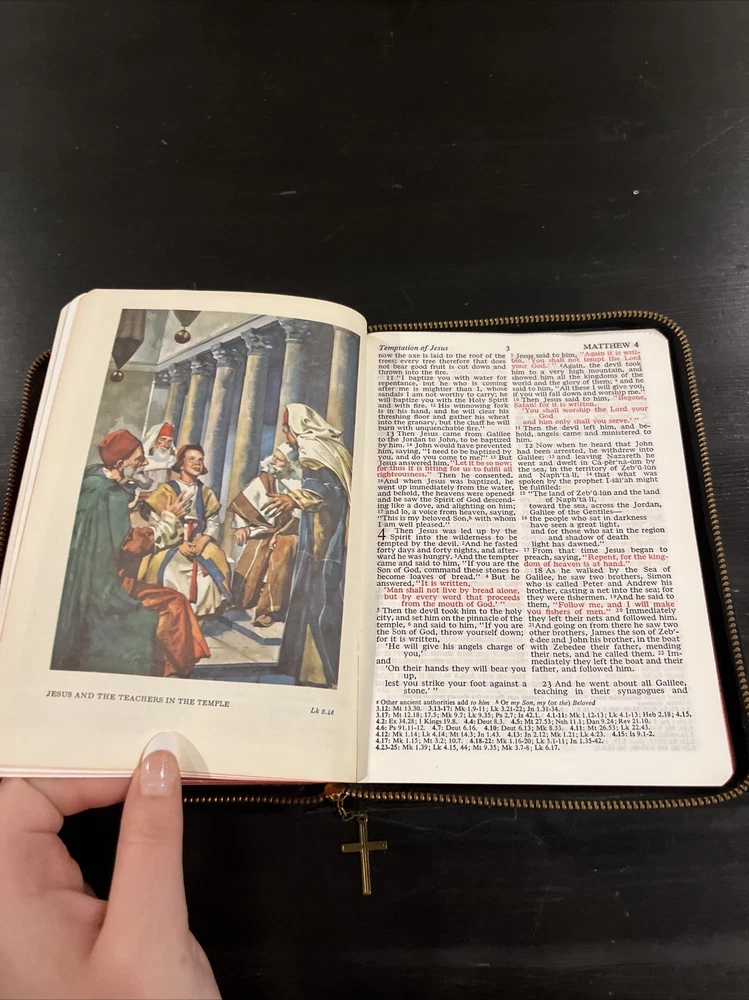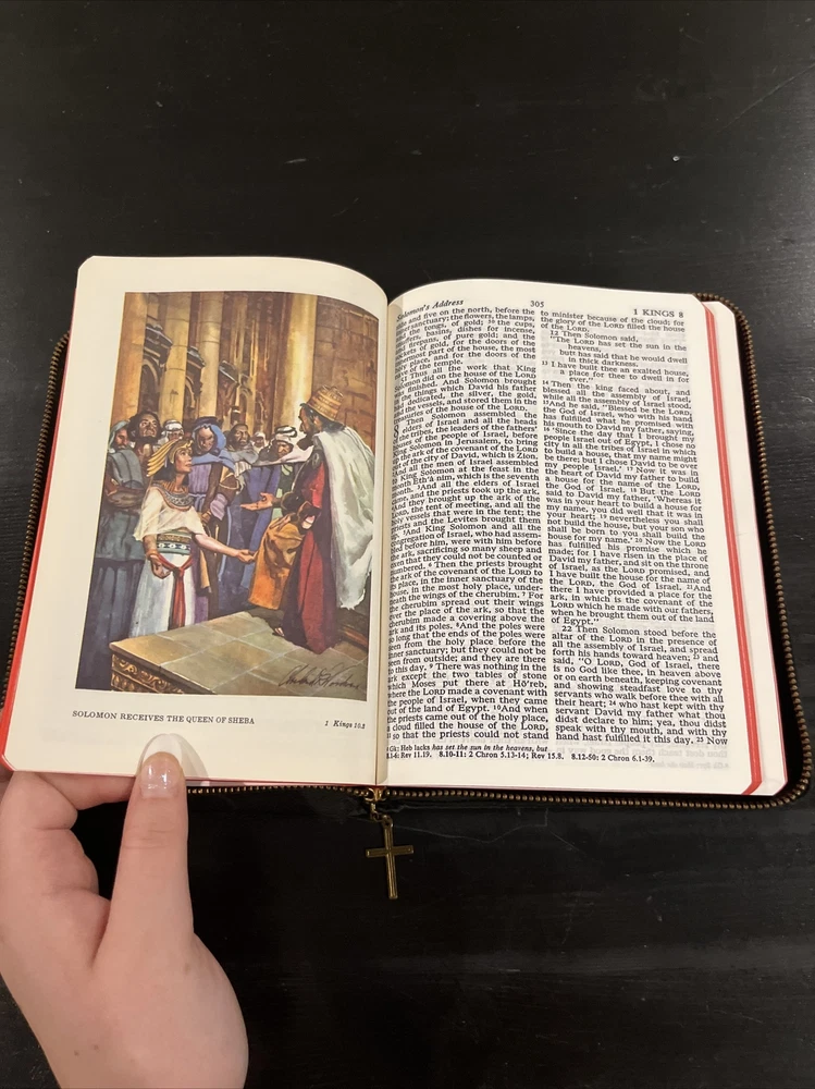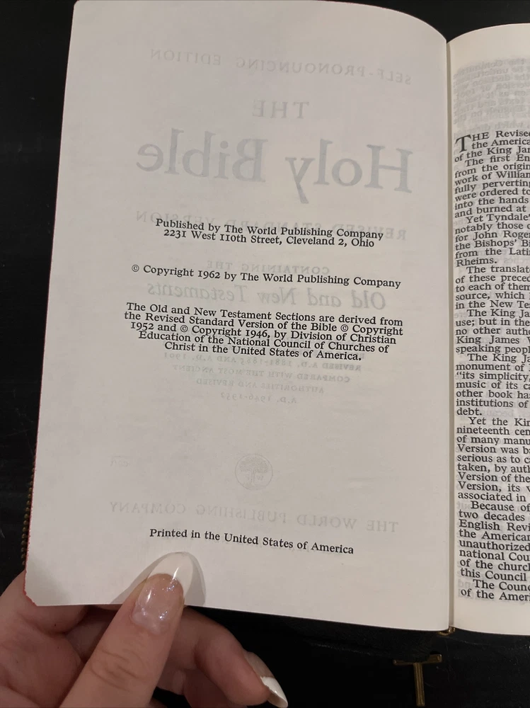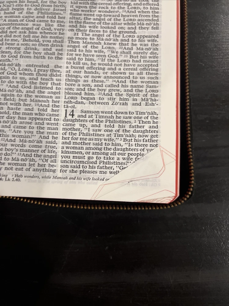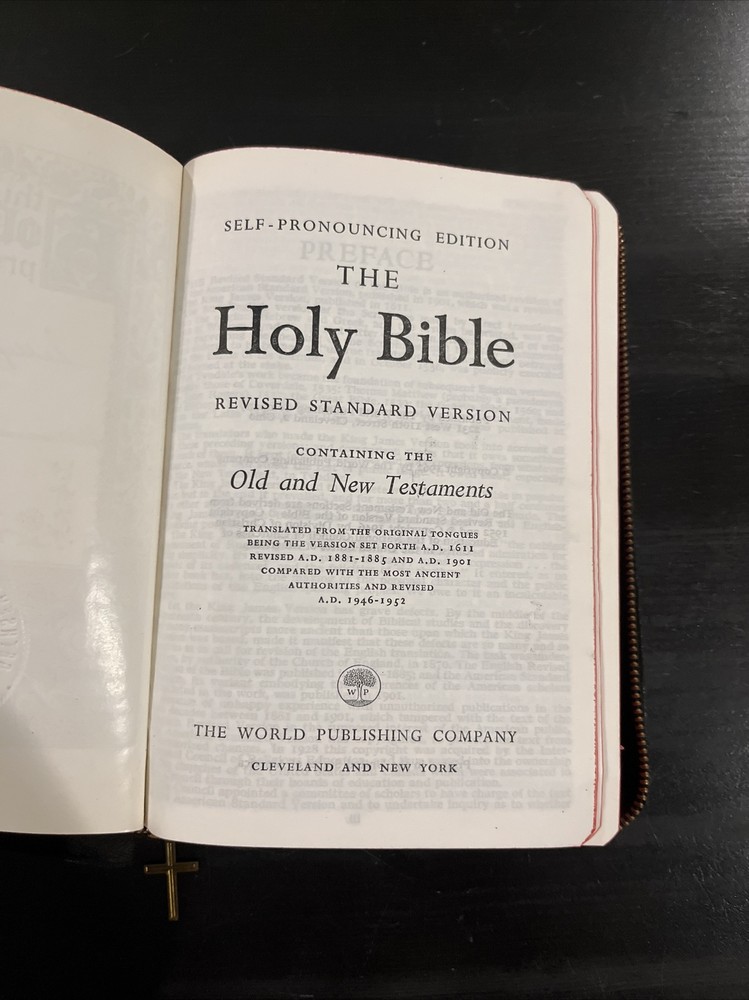 Holy Bible Red Letter Concordance Revised Standard Version ZIP BINDER World. Book is in excellent condition. There are some pages folded but doesn’t affect the overall book. No major rips, tears, or writing visible. See pictures for more details.