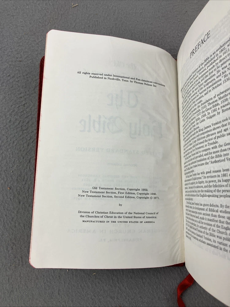 Holy Bible Red Letter Reference Concordance 1972 Nelson 4807 RSV 2nd Ed. 1801R GOOD CONDITION -- CLEAN COPY/NO MARKINGS ON THE INSIDE (see pics) *Item will be protected well for shipping and comes with a tracking number for confirmation.* I ship out items every day so expect a quick delivery!
