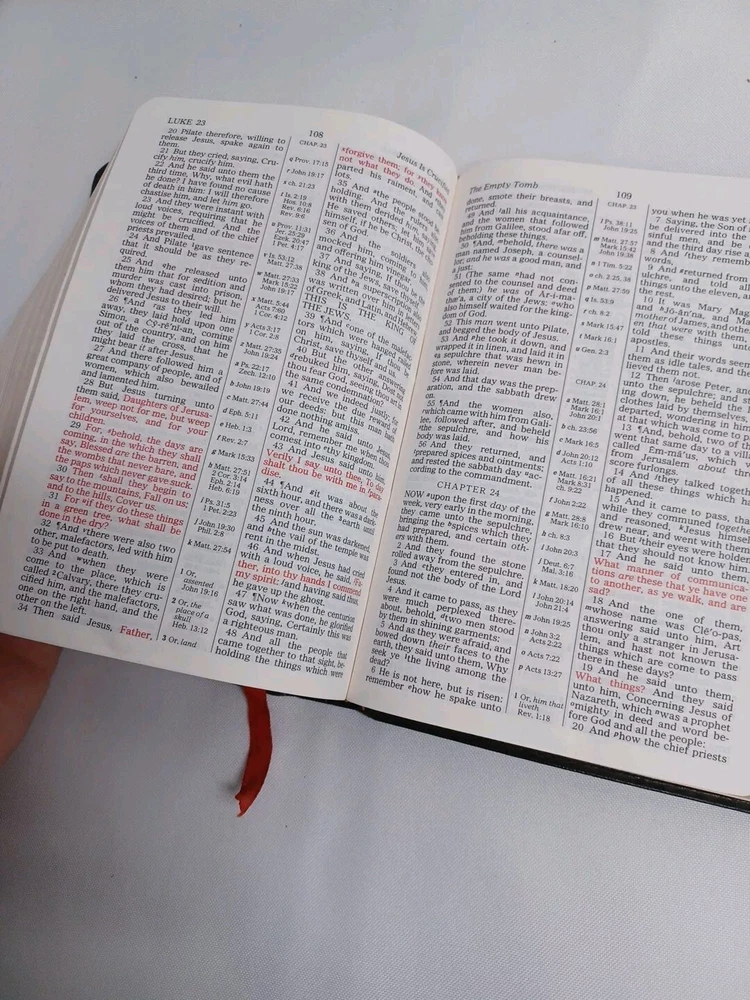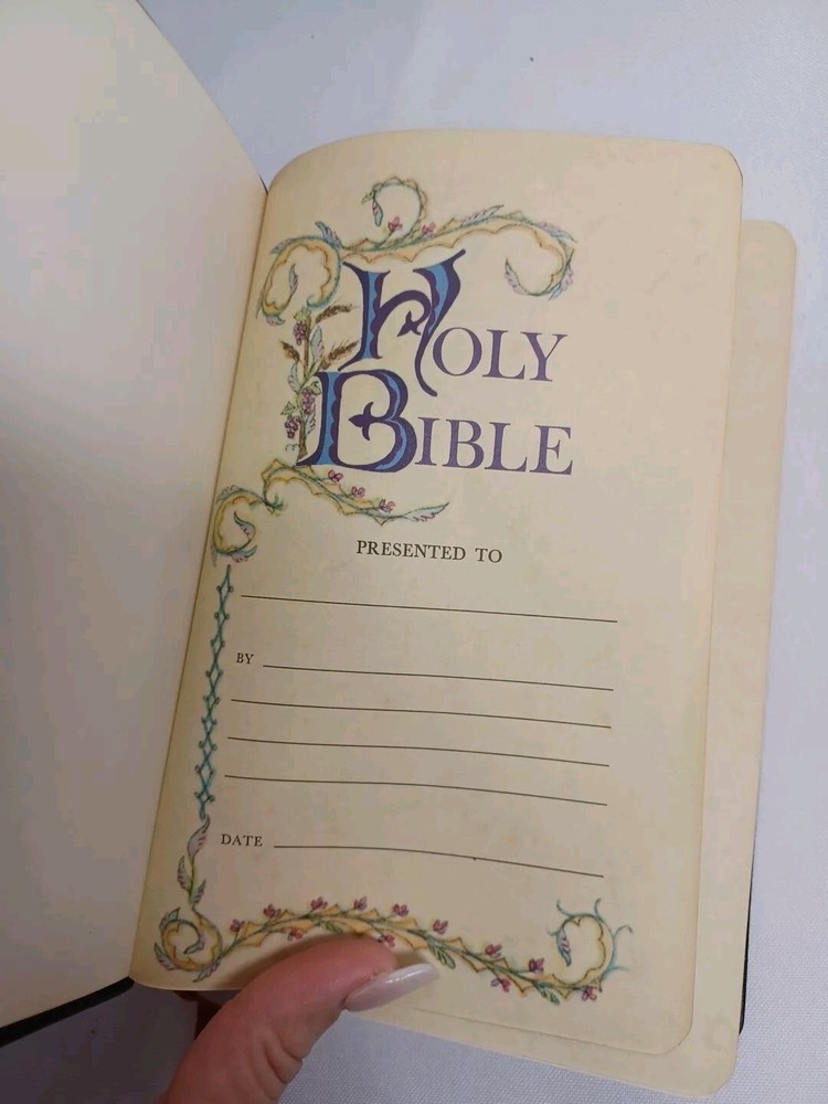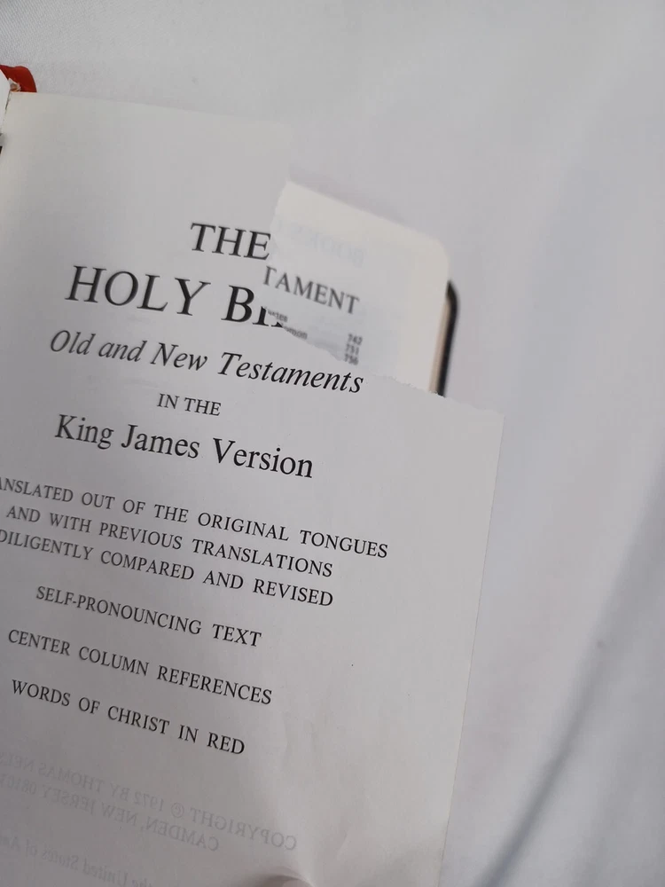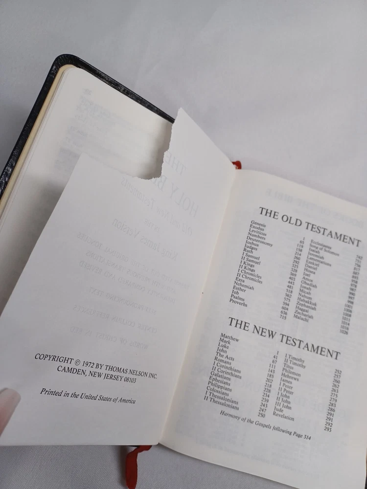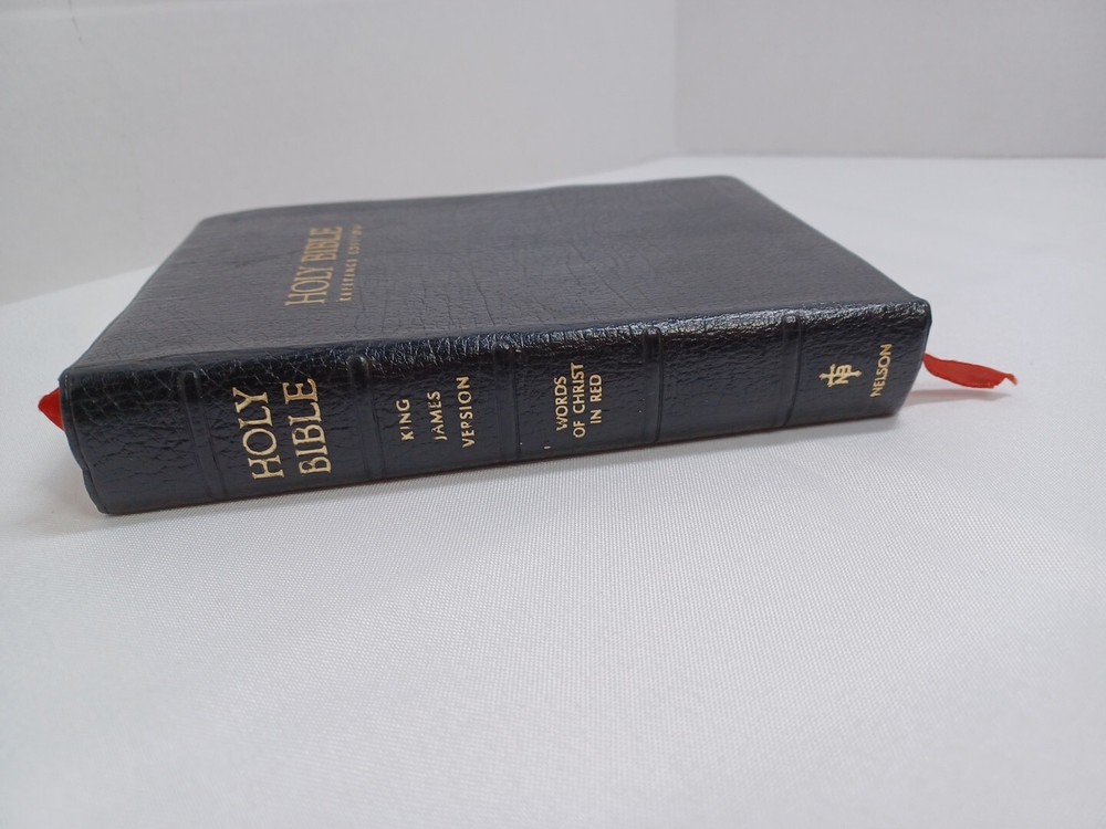 Holy Bible Reference Edition KJV Nelson Black Leather Words Of Christ In Red" ****Please note the title page has a torn corner. And some pages also torn out from the back concordance. Please see the pictures**** price has been adjusted accordingly for this.