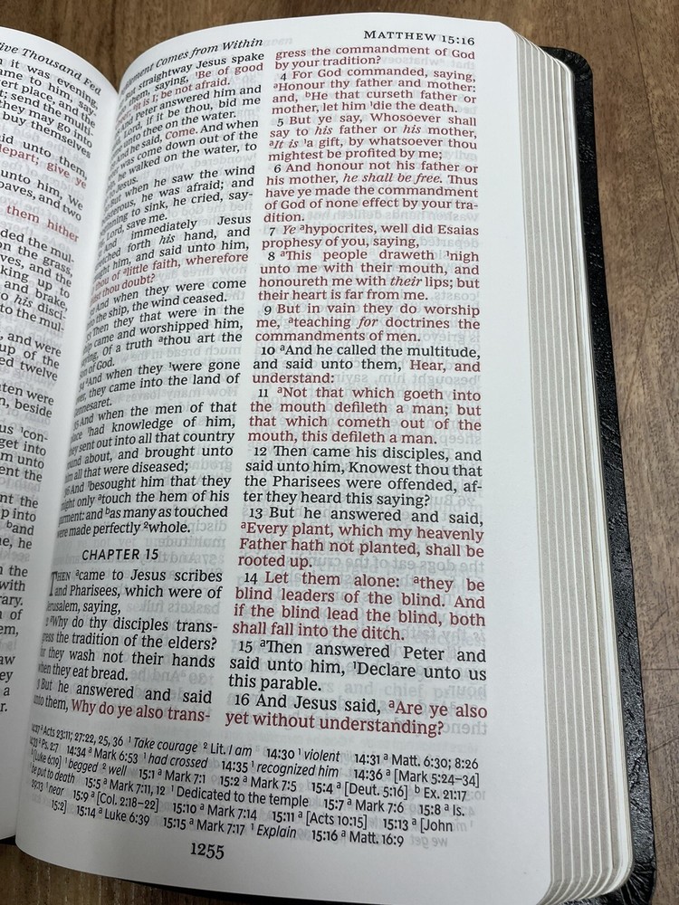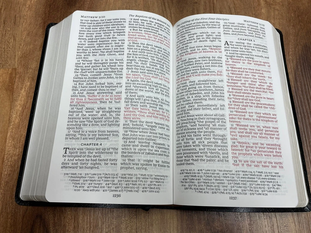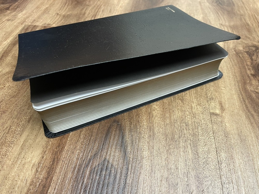 My new Bible is beautiful!!! Despite its clearly described cover damage the text block inside is in new condition! Couldn’t have been described more accurately, and I got an amazing deal. Highly trust worthy seller. Seller was also super fast to ship and to answer my question. Extremely well packaged and was never in any shipping danger. Highly recommend this great seller!