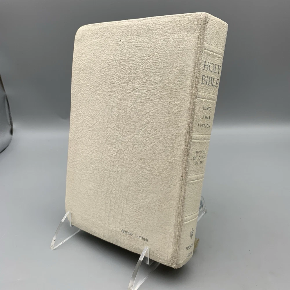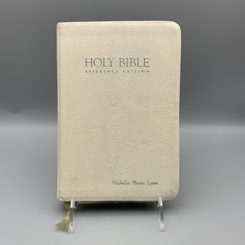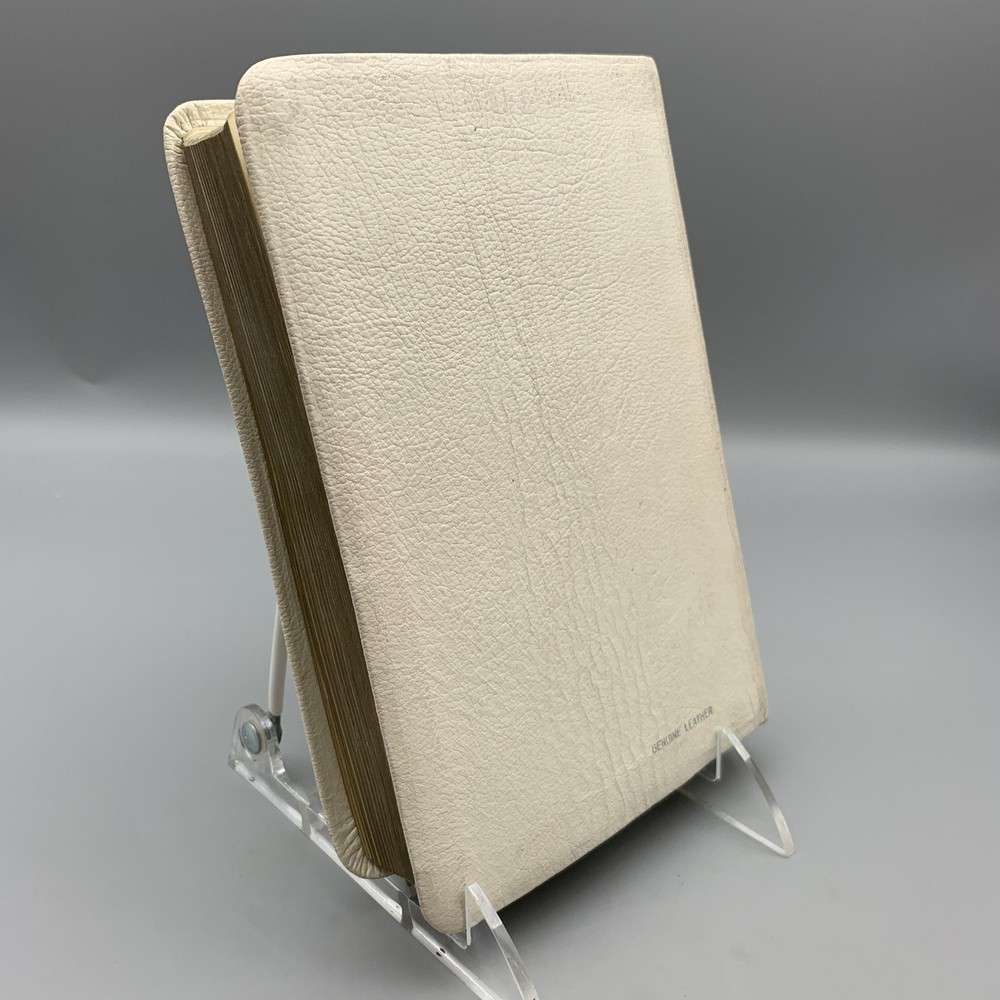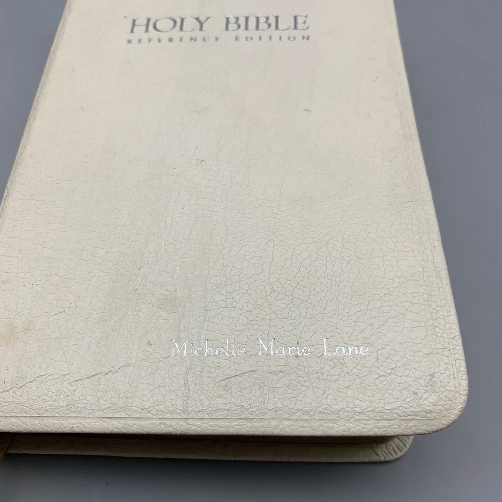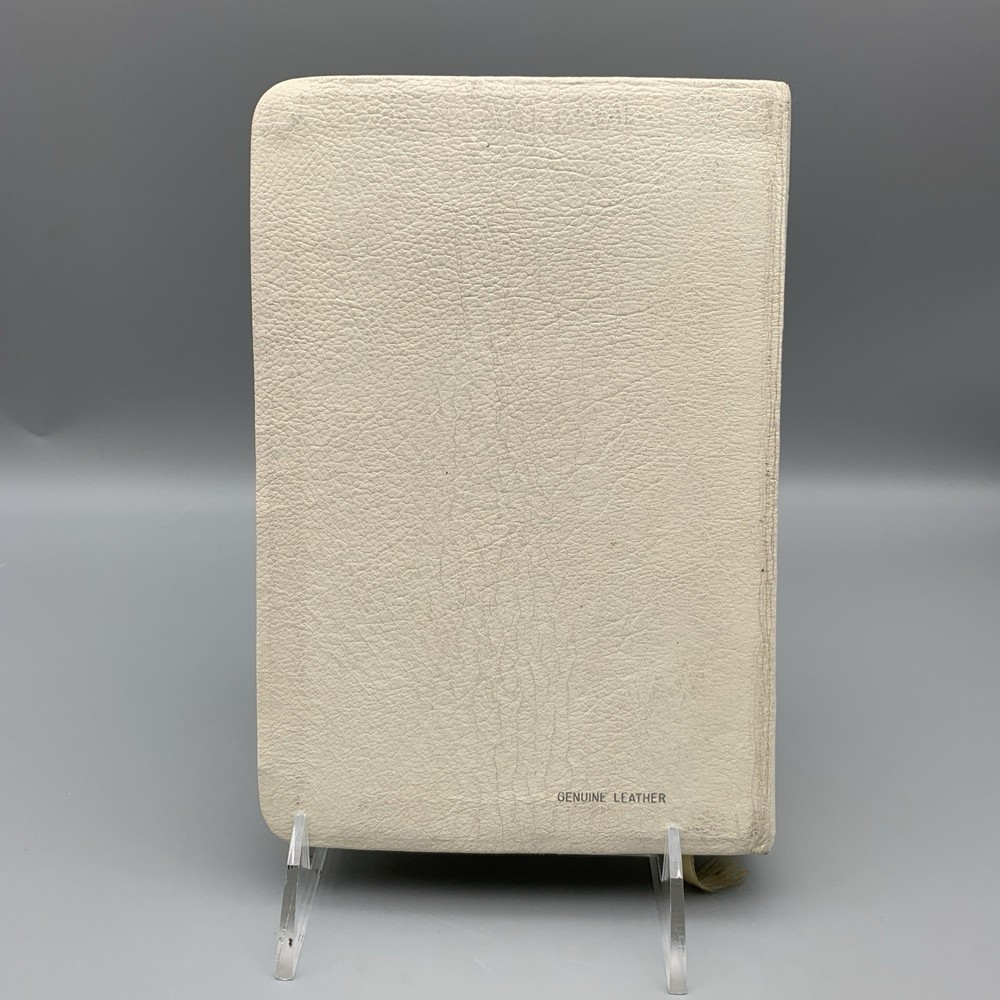 This beautiful white leather Bible is in excellent condition with no damage. I love the classic red letter text and the personalization gives it such a warm, cherished feel. A truly special find!