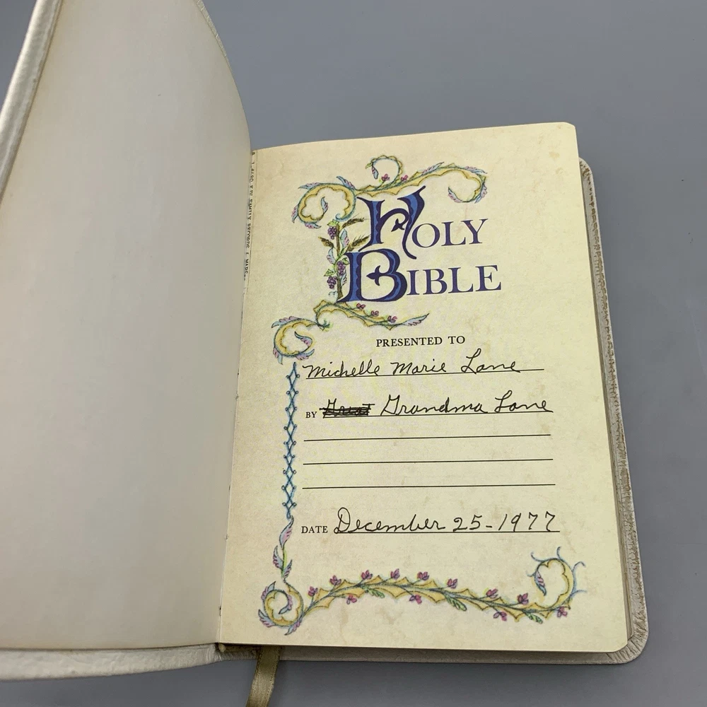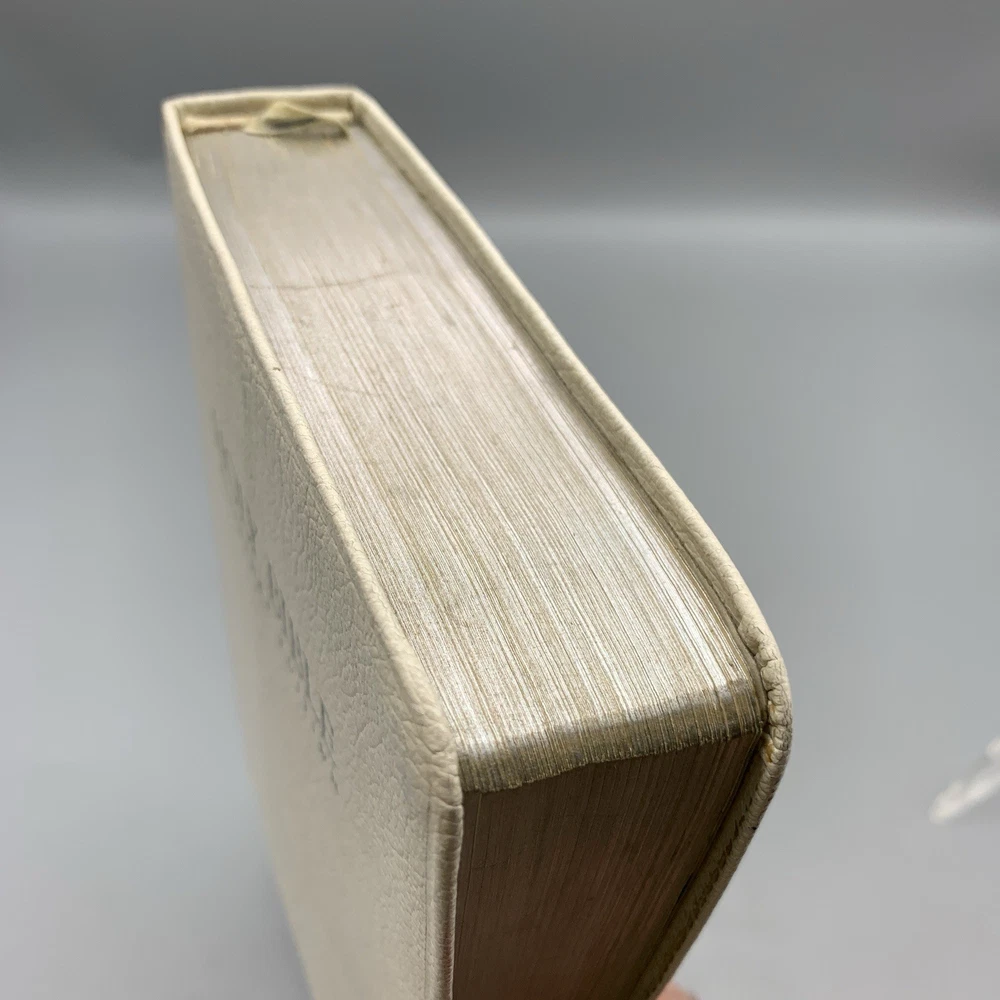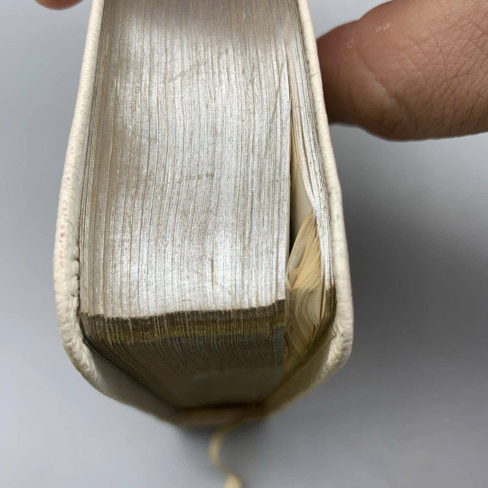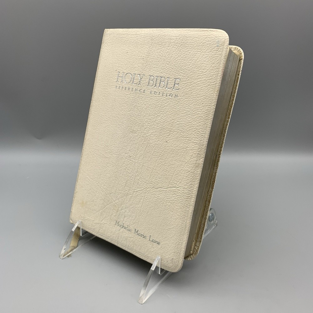 This beautiful white leather Bible is in excellent condition with no damage. I love the classic red letter text and the personalization gives it such a warm, cherished feel. A truly special find!