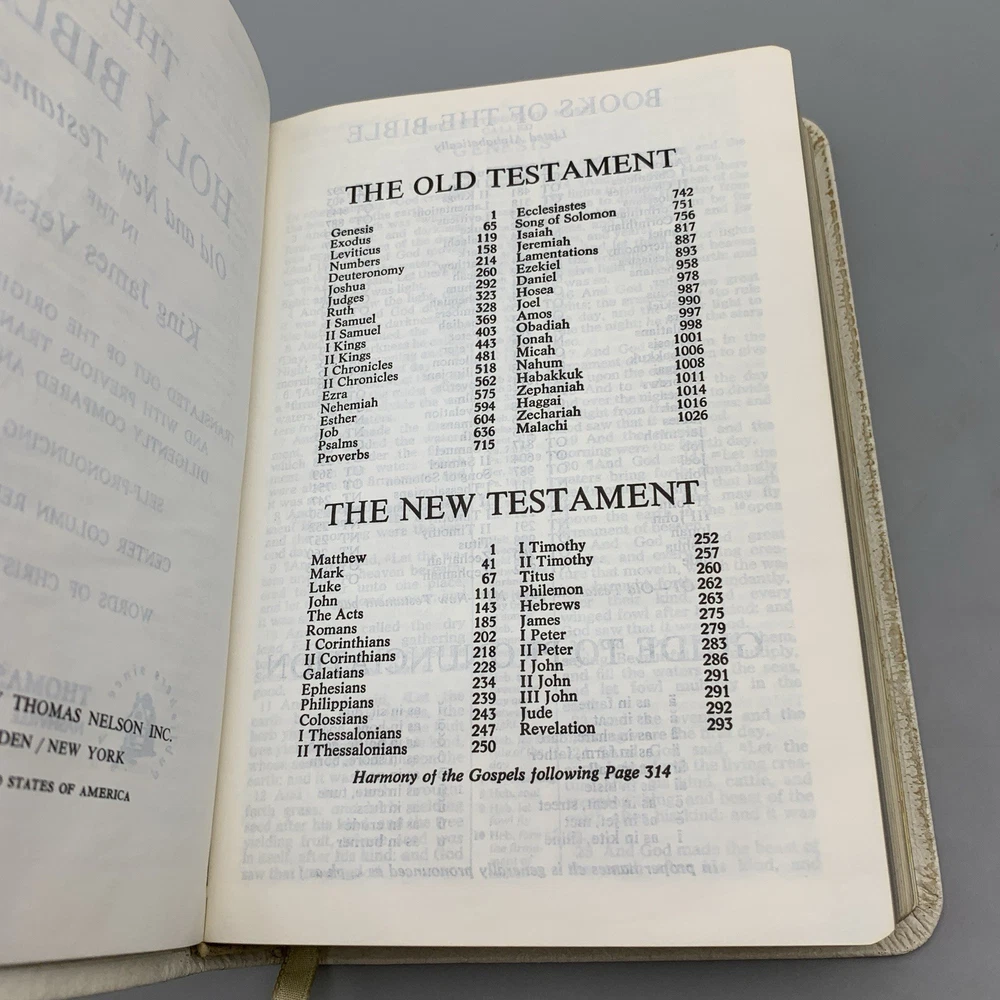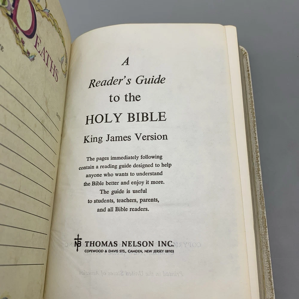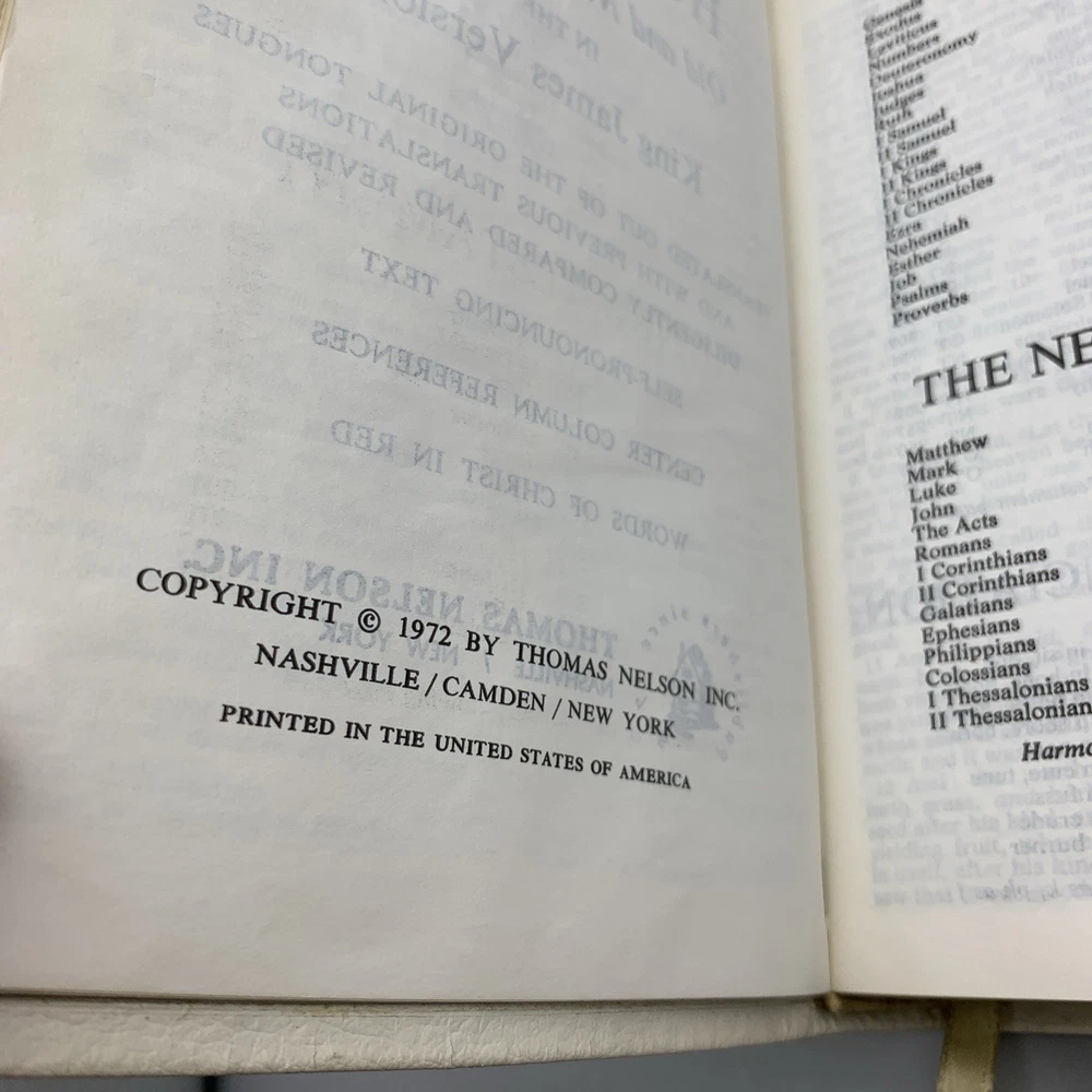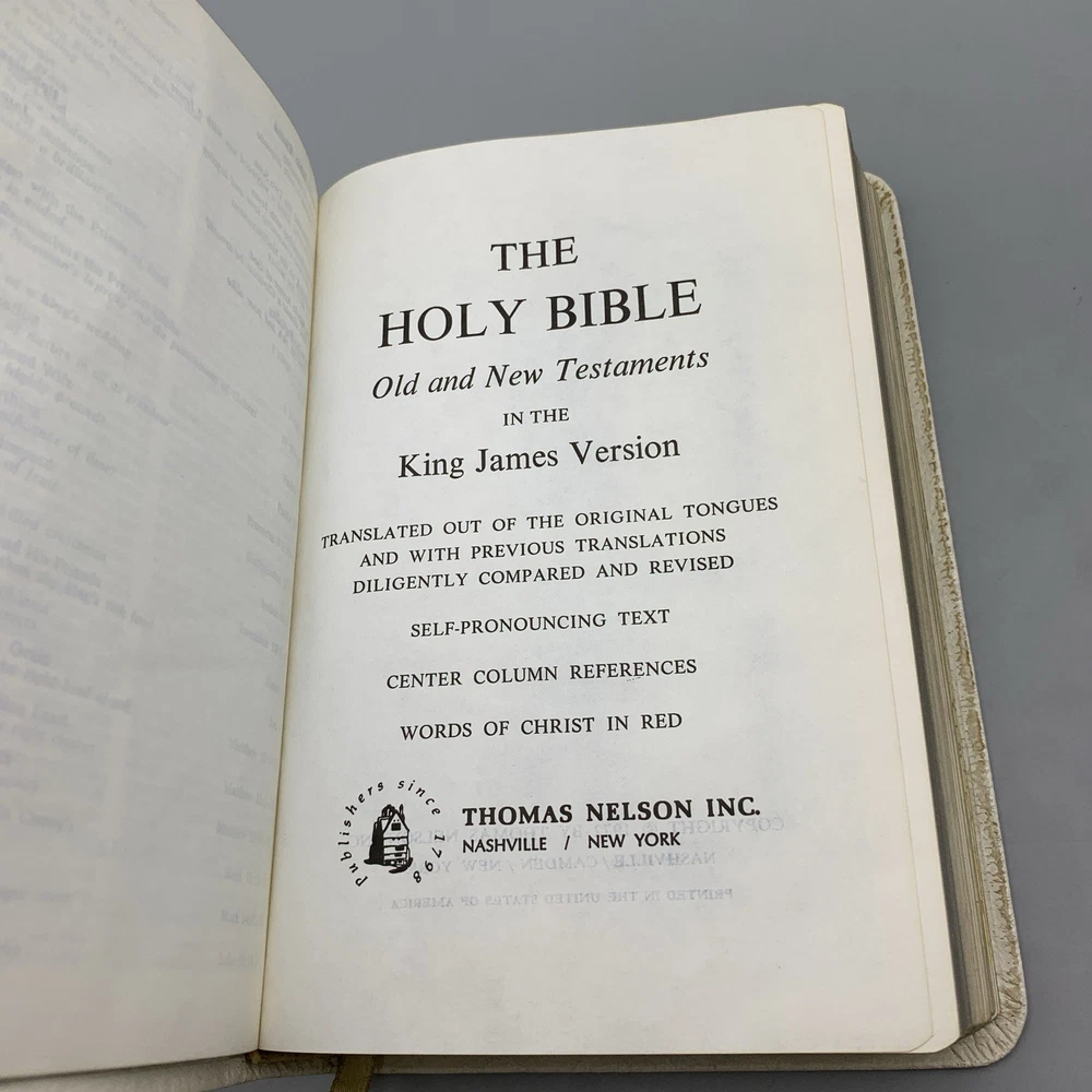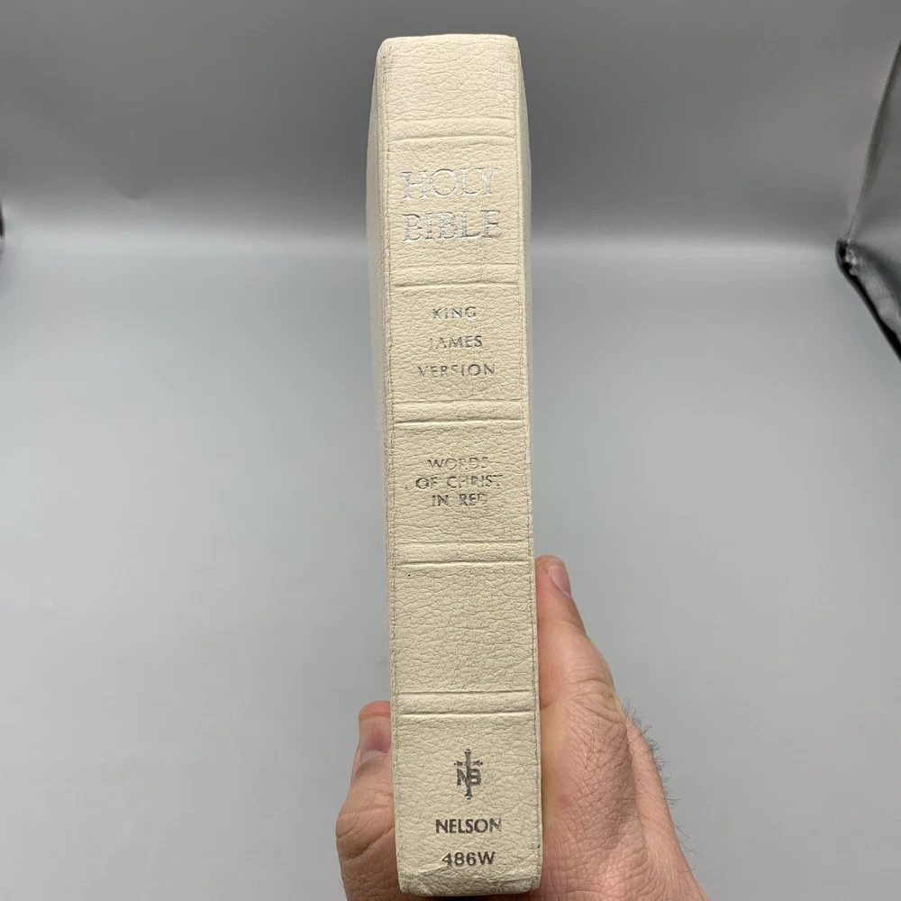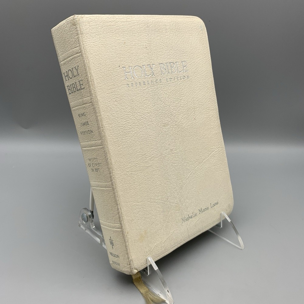 Up for sale is this Holy Bible Reference Edition KJV Thomas Nelson (486W) 1972 White Genuine Leather. This bible is a Red Letter, King James Version, printed in 1972. This bible is in good overall condition witn no rips, stains or missing pages. The cover is personalized with a name, typed in a color that matches the book cover font. The "presentation" page inside the front has been filled out and dated for 1977. Please see photos for exact condition of the item. If you have any questions, or would like additional pictures, please feel free to contact me. Comes from a smoke-free home. Thank you for supporting our small business.