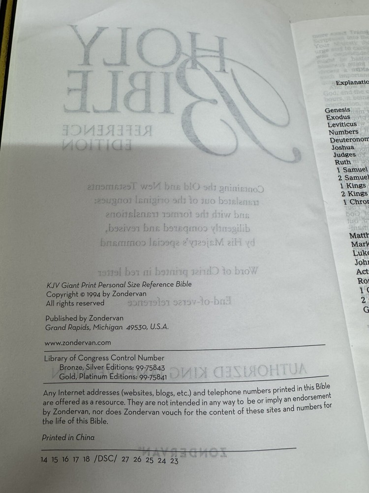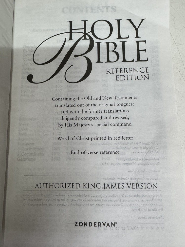 The Holy Bible (Containing the Old and the New Testaments. Translated Out of the Original Tongues: and With the Former Translations Diligently Compared and Revised, By His Majesty's Special Command Word of Christ printed in red letter End of Verse reference Authorzed King James Version Published by Zondervan 1994