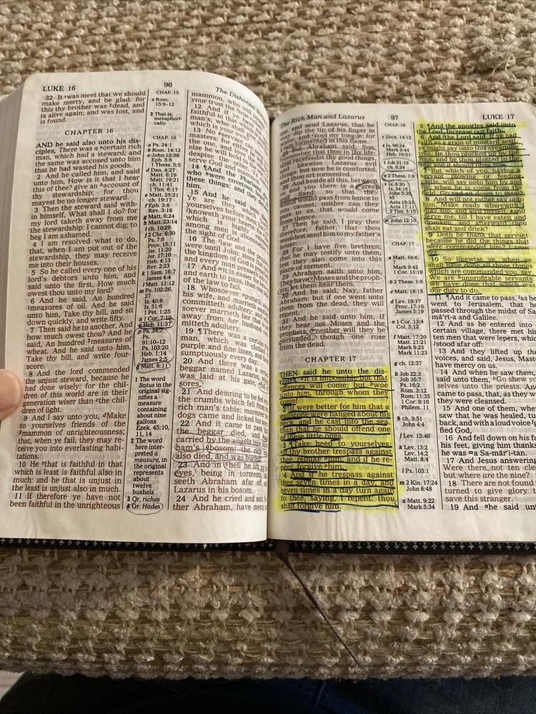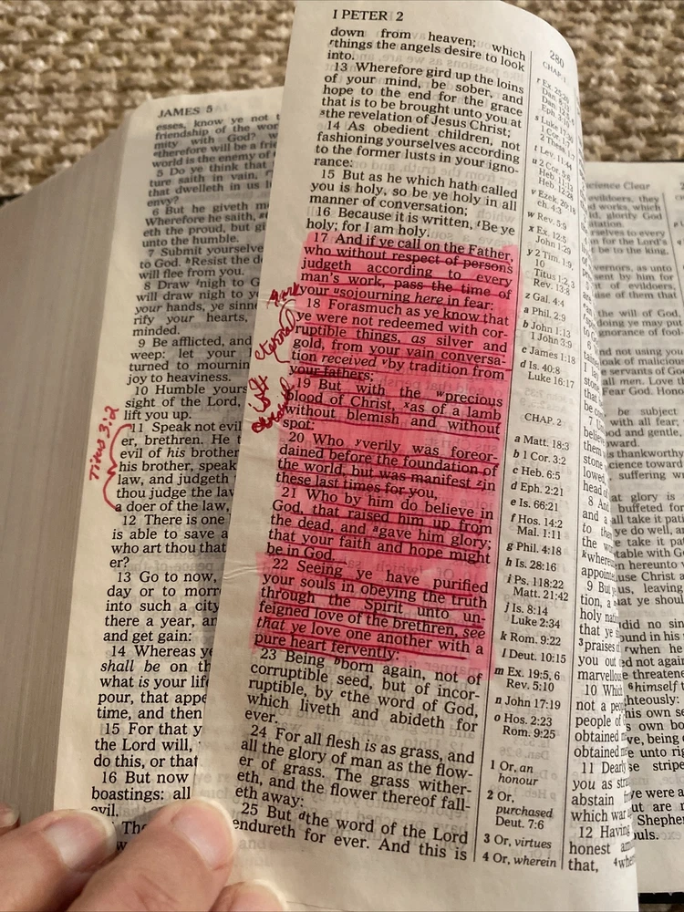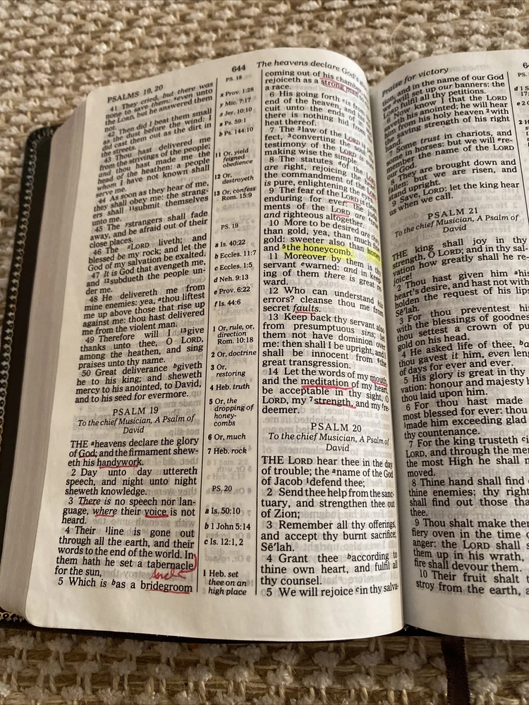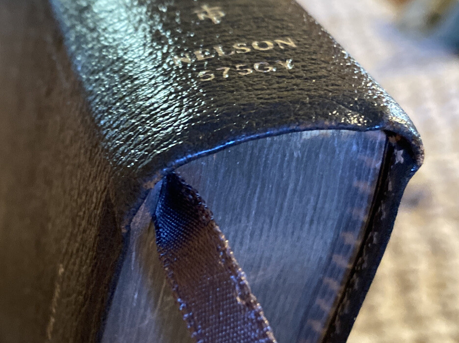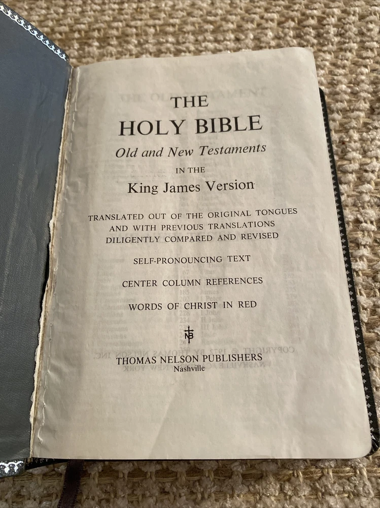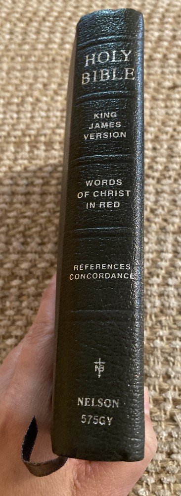 Holy Bible Reference King James Version Nelson Bonded Leather Red Letter 1972. Gray bonded leather cover. This Bible is in very good condition! The only draw back, it has pen/highlighter marks. 3 of the corners show a tiny bit of wear. Front page seems to be ripped out. Maps have bright color. See pictures for description and condition. Shipped USPS Media Mail.