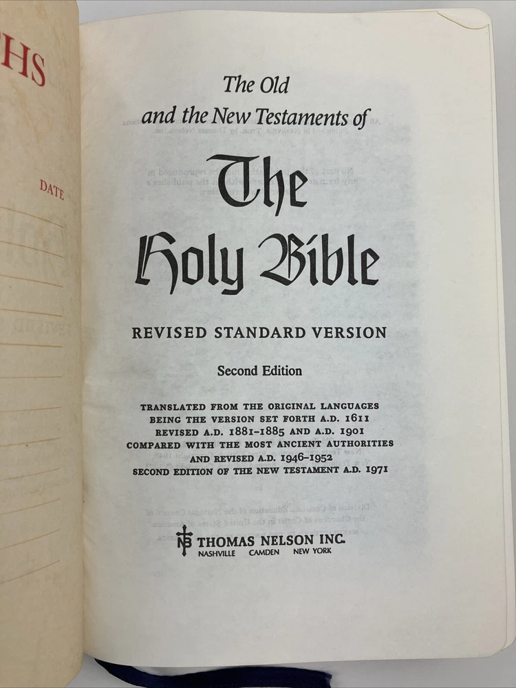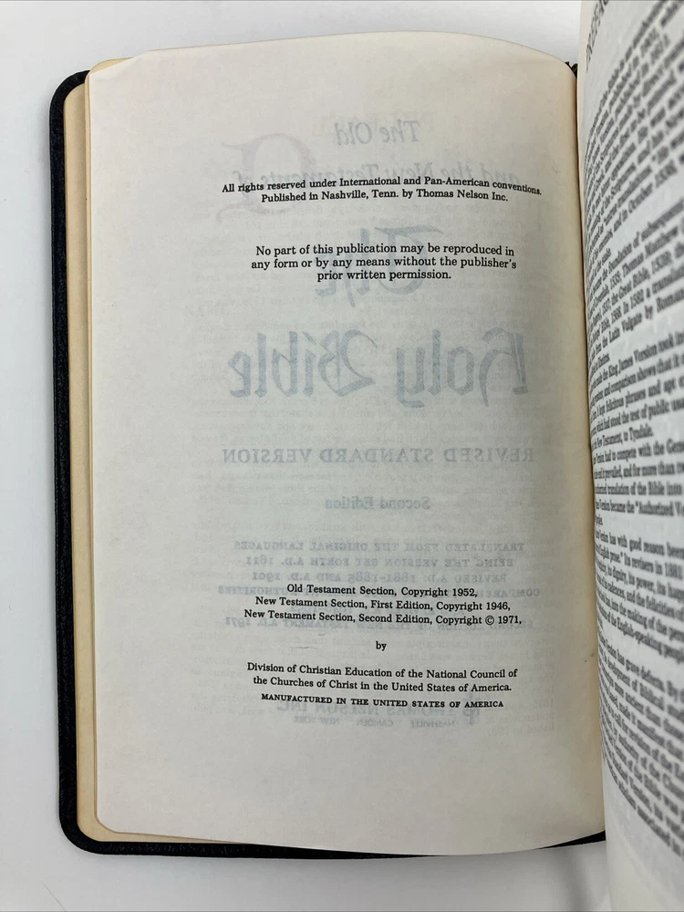 Holy Bible Revised Standard Version 2nd Edition Reference 1971 Black Leather GOOD CONDITION -- CLEAN COPY/NO MARKINGS ON THE INSIDE (see pics) *Item will be protected well for shipping and comes with a tracking number for confirmation.* I ship out items every day so expect a quick delivery!