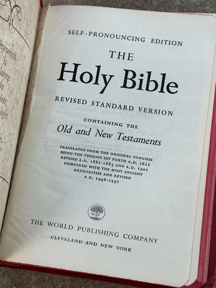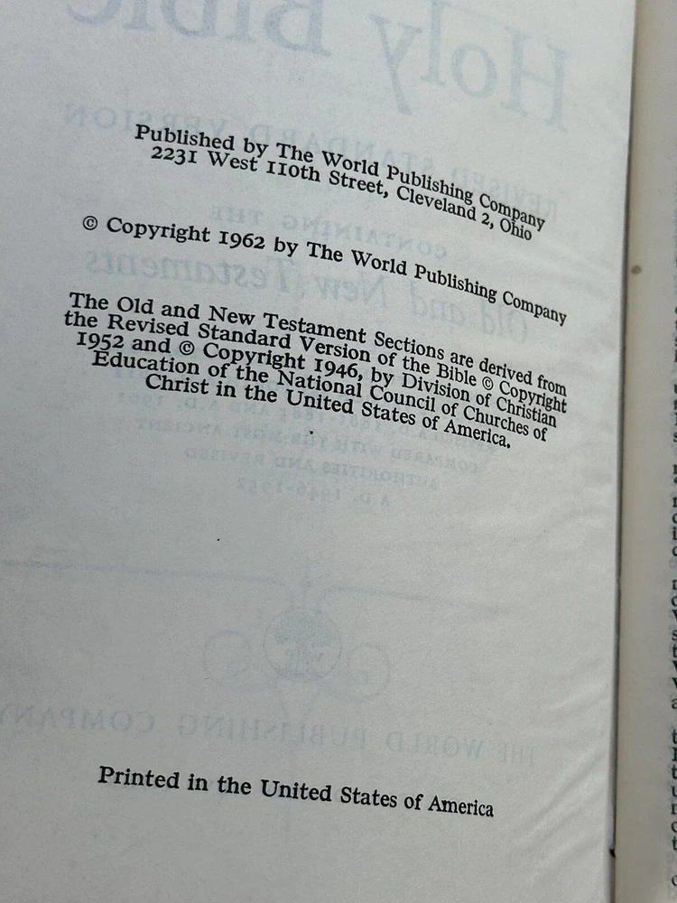 This is a genuine leather-bound Holy Bible, featuring illustrations and a self-pronouncing reference edition. There is some shelf-wear, including light scuffing & scratching, and the first inside page is missing. Other than that, the binding is tight. There are no loose pages, rips, tears, creases, intentionally dogeared, pages, writing, highlighting, or other significant flaws to note. The book is a revised standard version, published by the WORLD Publishing Company in 1962. It is a nonfiction book with a religious and spiritual genre, and it covers the topic of the Bible. The editorial staff authored it, and it is published in English.