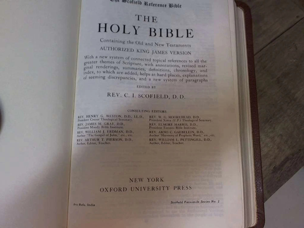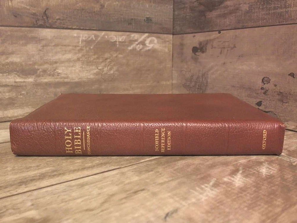 Holy Bible Scofield Reference Edition (186X / T-74, Genuine Leather) leather_bound Oxford, Description: Very Good - Scofield Facsimile Series No. 2. Brown genuine cowhide. No markings in text.. No words in Red. King James Version. Gilt page edge. Latest copyright date is 1945. Print code of T-74 / 186X on third to last page. Colored Maps with Indexed Atlas. Cowhide Binding, Oasis Grain. Concordance. Ribbon Marker. Chronology, Index. Revised marginal renderings. mon0000729932