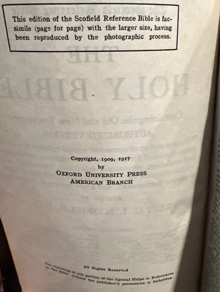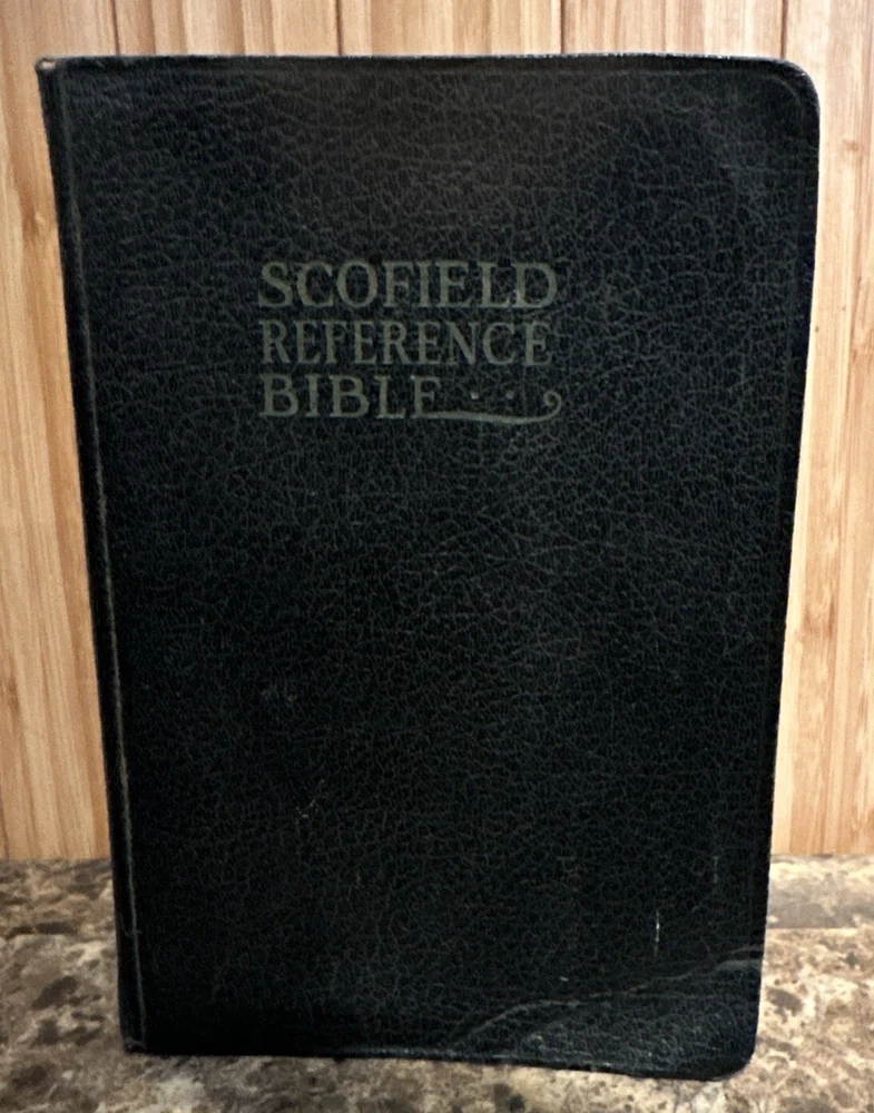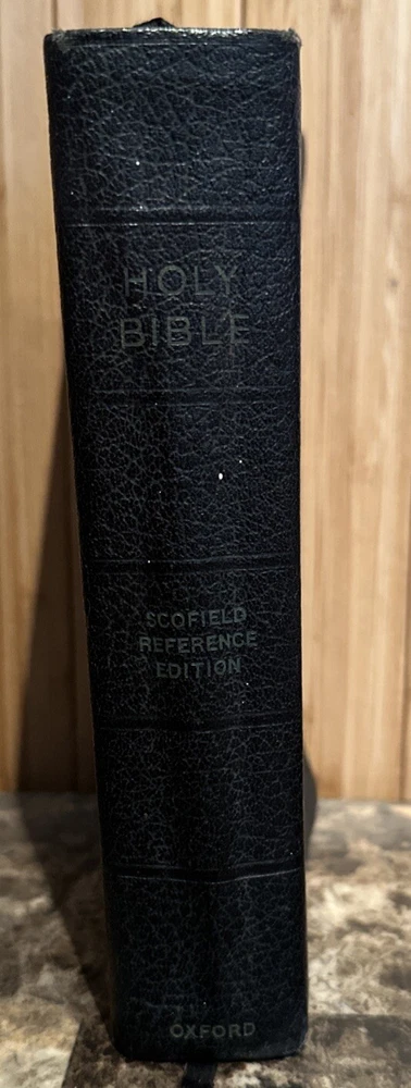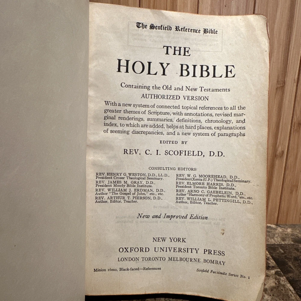 The product is a Holy Bible Scofield Reference Edition from 1917, published by Oxford University Press in black leather binding. It was authored by Rev C. I. Scofield and is printed in English. This Bible is a reference edition focusing on Christianity and includes study notes and explanations. It was manufactured in the United States and is part of the Antiquarian & Collectible category. Includes color map pages, a black ribbon place holder. Inscription on front page, otherwise free of writings and markings. A few dog ear red pages, but most pages free of creases. Bottom right corner of leather peeling from inside black page as shown in photo.