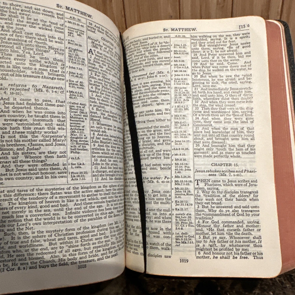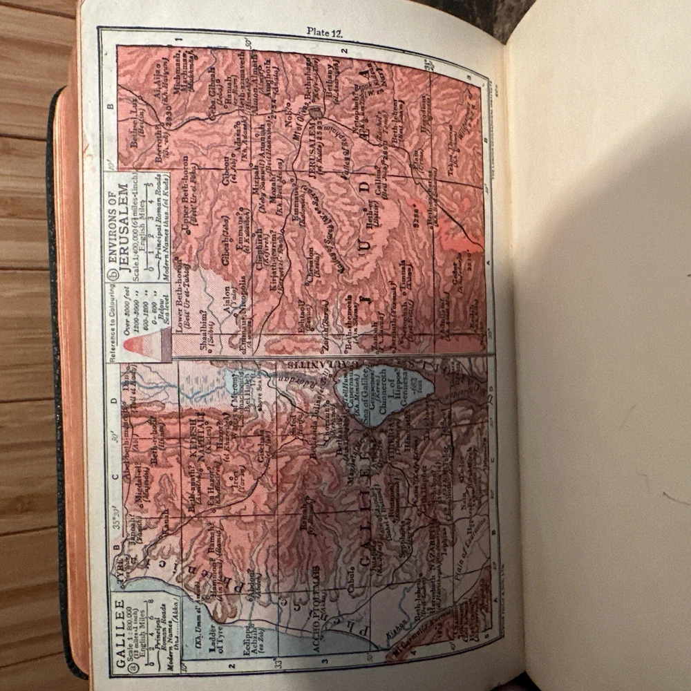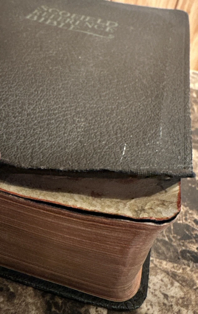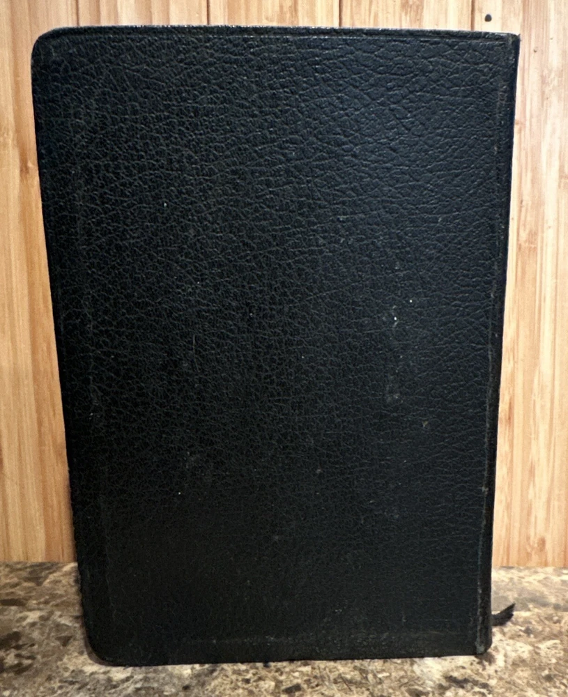 The product is a Holy Bible Scofield Reference Edition from 1917, published by Oxford University Press in black leather binding. It was authored by Rev C. I. Scofield and is printed in English. This Bible is a reference edition focusing on Christianity and includes study notes and explanations. It was manufactured in the United States and is part of the Antiquarian & Collectible category. Includes color map pages, a black ribbon place holder. Inscription on front page, otherwise free of writings and markings. A few dog ear red pages, but most pages free of creases. Bottom right corner of leather peeling from inside black page as shown in photo.