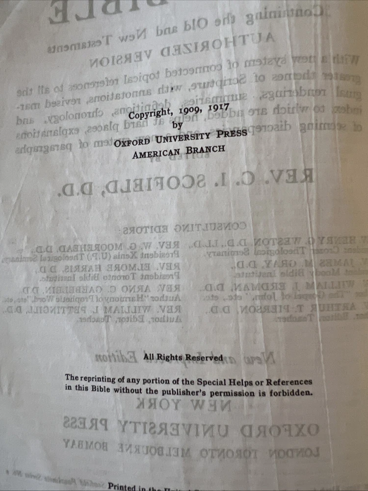 The product is a Holy Bible Scofield Reference Edition Concordance Oxford 1917, featuring a leather binding. It is an antique collectible with a focus on Christianity and reference material. This edition is likely to appeal to collectors, scholars, and individuals interested in studying the Bible within a Christian context, given its historical significance and detailed reference features. This was used by a minister to do his sermons. Hence you will see many markings and notations in the Bible. Please see all pictures so you know the condition of this Bible prior to purchasing Thank you for your interest