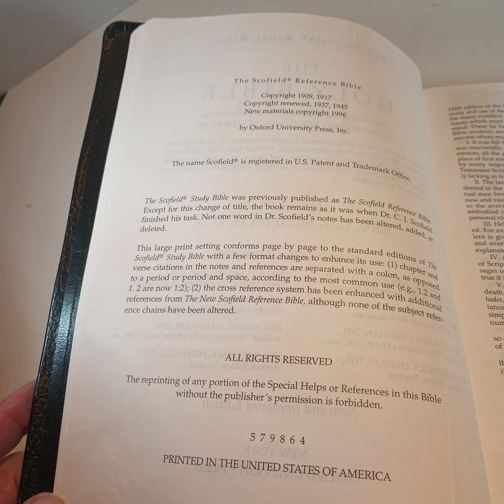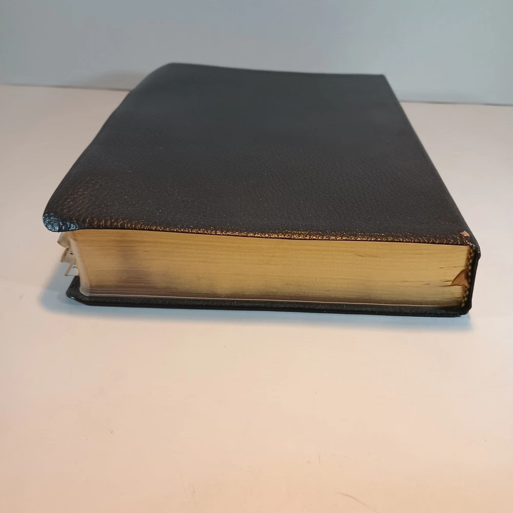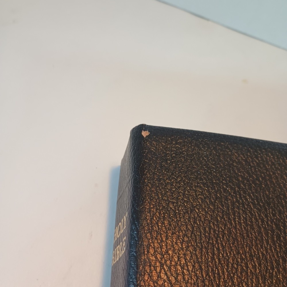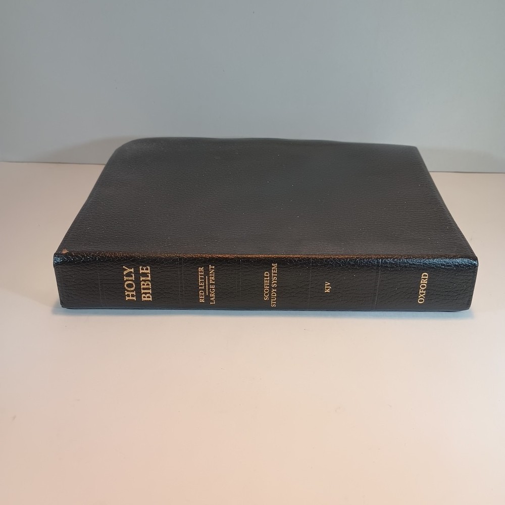 This lot is a Holy Bible Scofield Study Bible KJV LARGE Print. The Bible is i n used condition with writing on the presentation page. There is a some ding in the , please see photos. I am doing a clear out of our books we have too many to fit the space we have. We are a non-smoking household with cats.