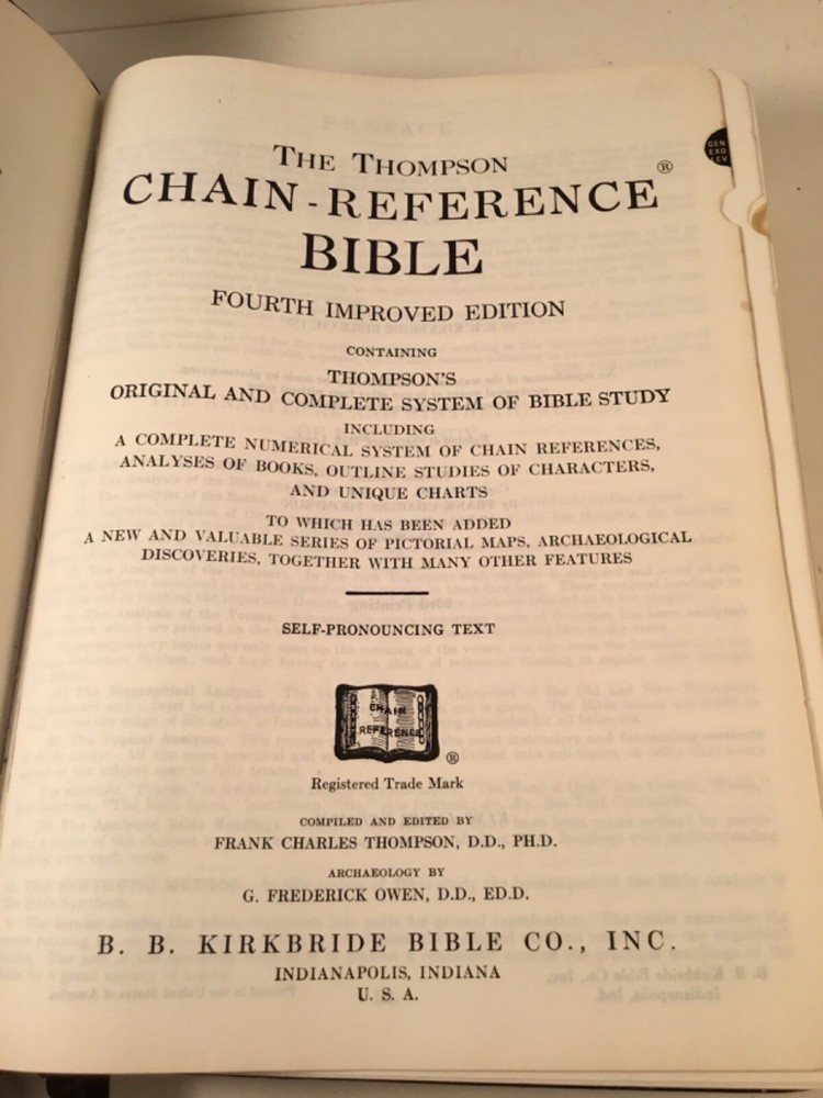 The Thompson Chain-Reference Bible Fourth Improved Edition Containing Thompson's Original and Complete System of Bible Study Including A Complete Numerical System of Chain References, Analysis of Books, Outline Studies of Characters, and Unique Charts To Which Has Been Added A New and Valuable Series of Pictorial Maps, Archaeological Discoveries, Together With Many Other Features.