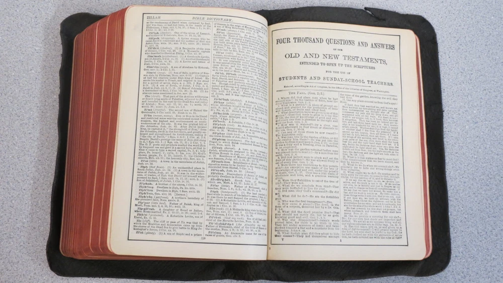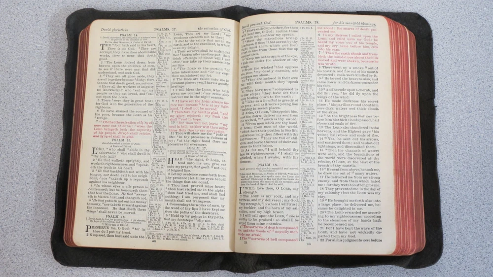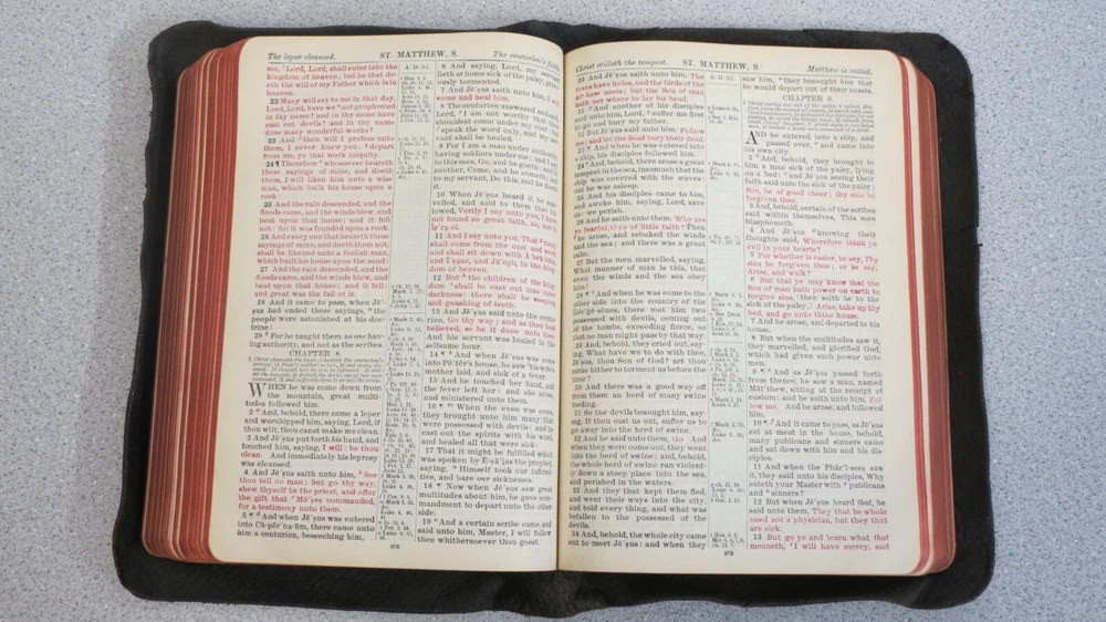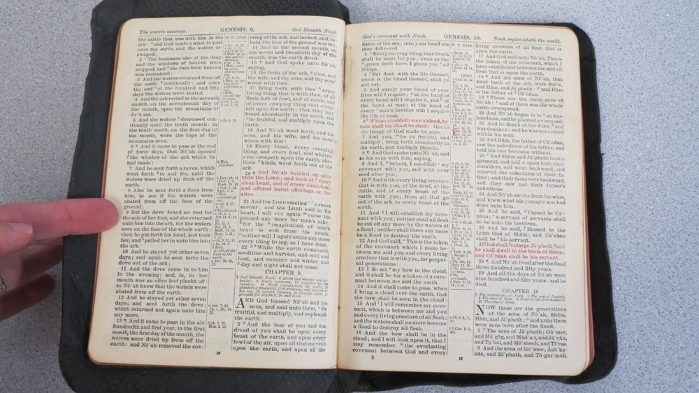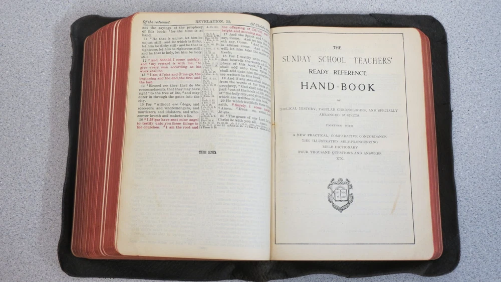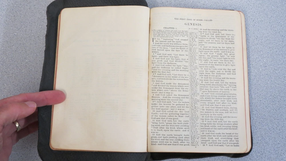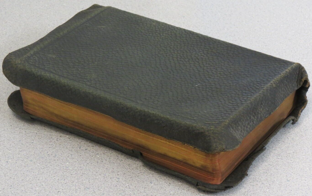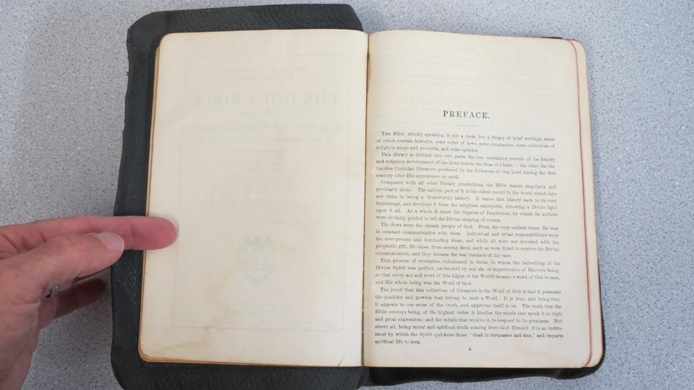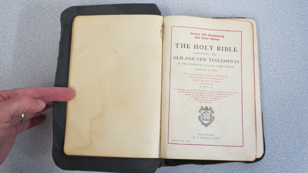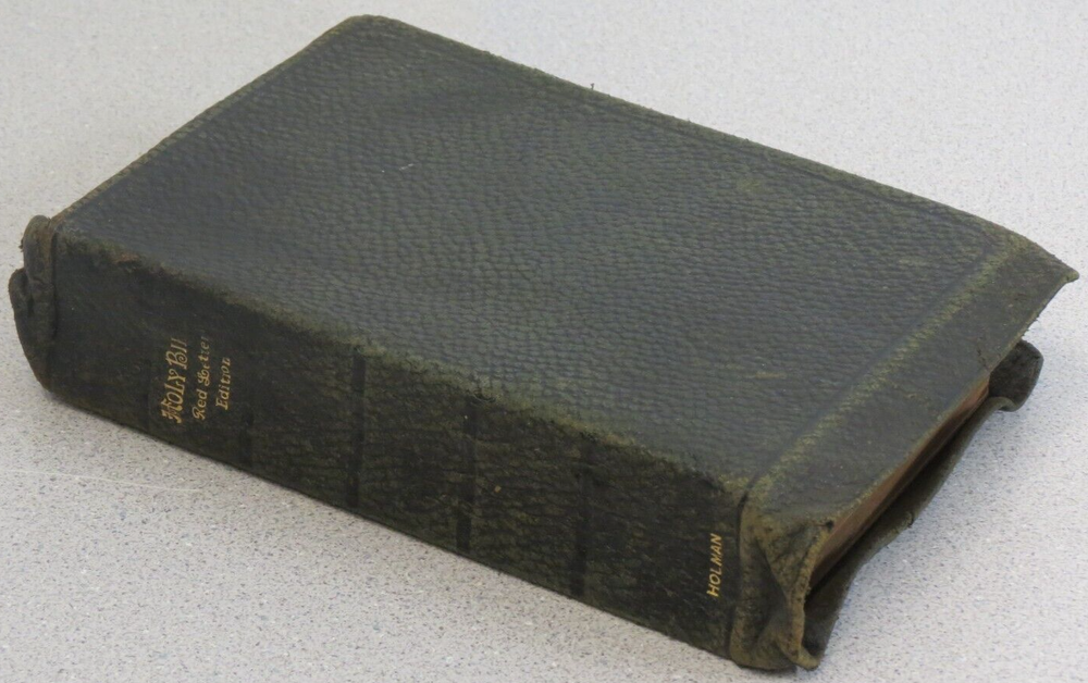 Holy Bible vintage Holman KJV arranged to show... center reference distressed black leather approx size: 6 x 9" cover shows wear and fading, distressed, vintage condition, see pics.