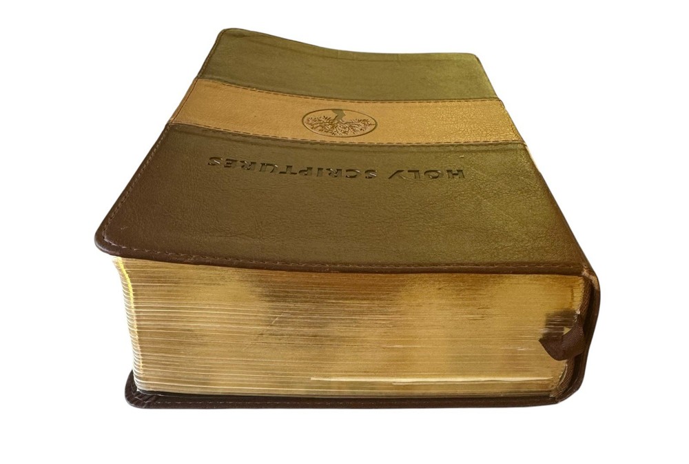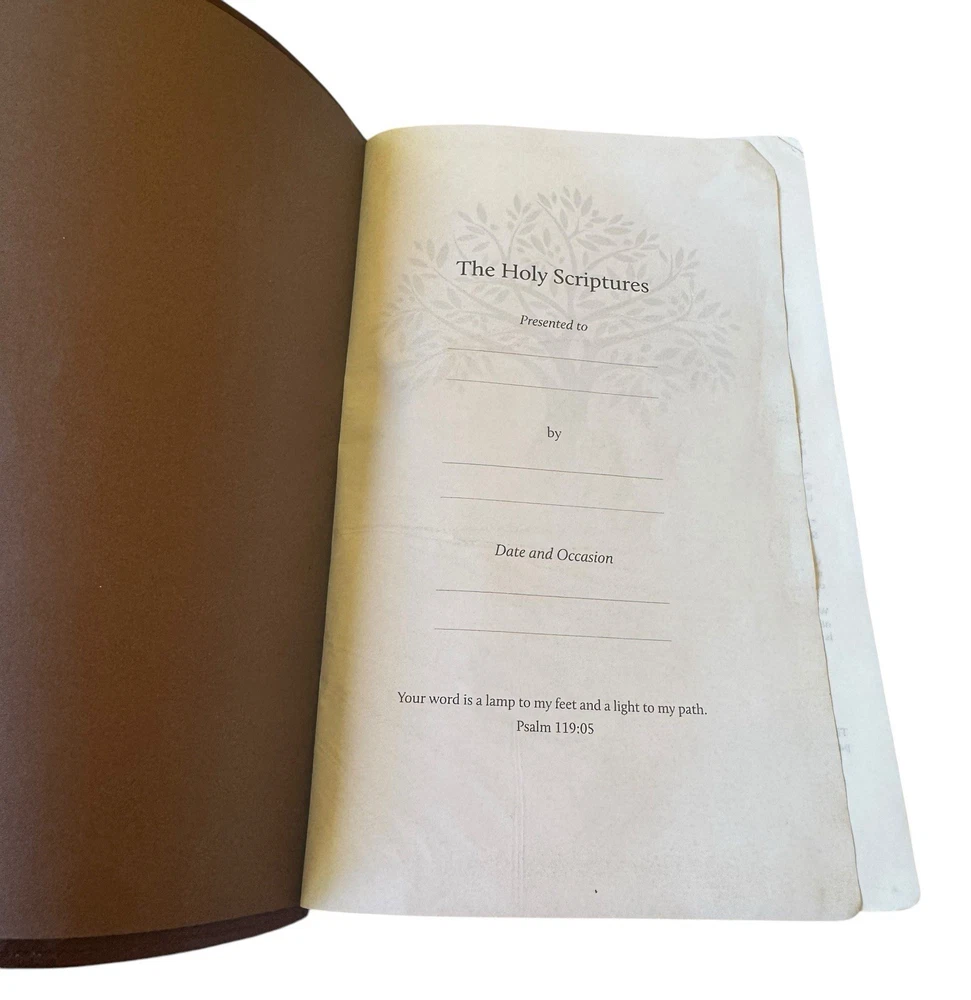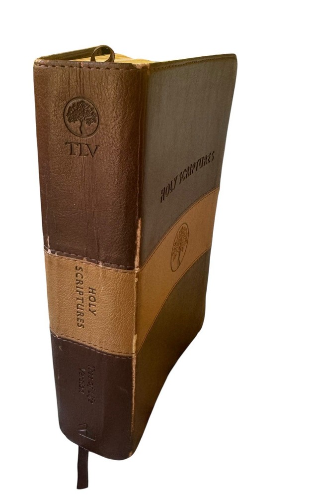 In good overall shape. Along this spine in the front and the bottom front corner, there is slight peeling. This is the two-to e brown and tan TLV Personal Size Bible with giant print and reference. This Holy Scriptures Tree of Life Version by Messianic Jewish Family Bible Society is a must-have for any individual seeking spiritual enlightenment. The book is a nonfiction religious book that is imitated in leather and published by Baker Books. The book is written in English and the original language is Greek Hebrew Aramaic. The book has a length of 8.7”, a height of 2.25”, and a width of 5.6” with a total of 1981 pages. The book is intended for young adults and adults and is an excellent edition for anyone studying pre-1500s literary movements. The book is also a great addition to anyone's collection of Bibles, especially those interested in other translations.