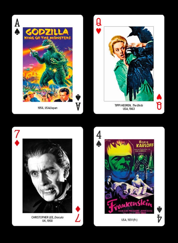 Find Horror Movie (King Kong Godzilla Dracula Frankenstein) Playing Cards by Piatnik and over 2000 other decks, at X-decks ! We ship all our standard size decks in one of our free plastic deck protectors for their safety and your peace of mind! Have a collection you’d like to sell? X-decks is interested! Historic horror movie posters and mighty monsters from King Kong to Godzilla on every card. Also starring Dracula, Frankenstein and Screaming Skulls. Welcome to the terrifying world of the Spine Tingler.