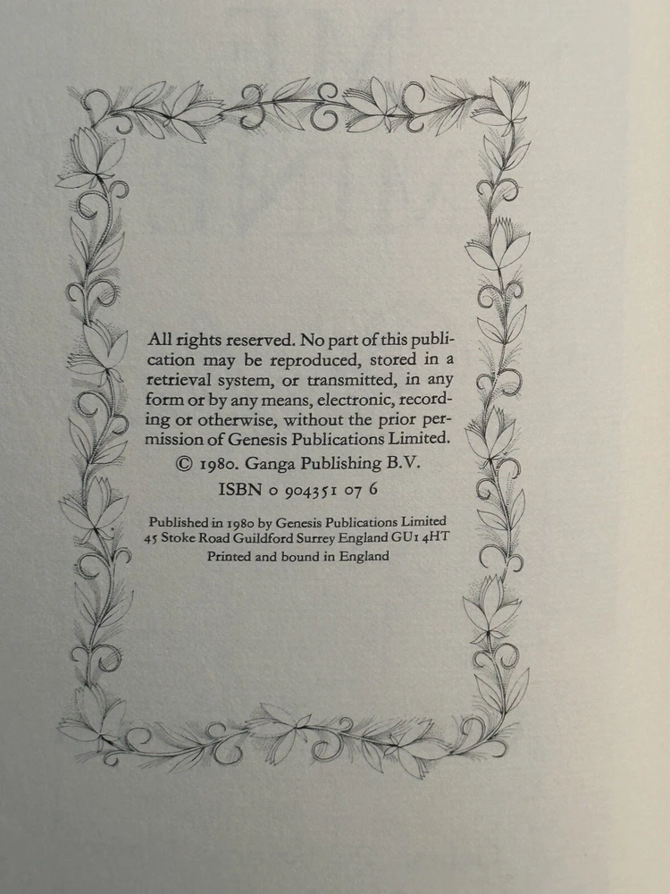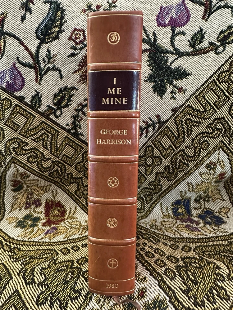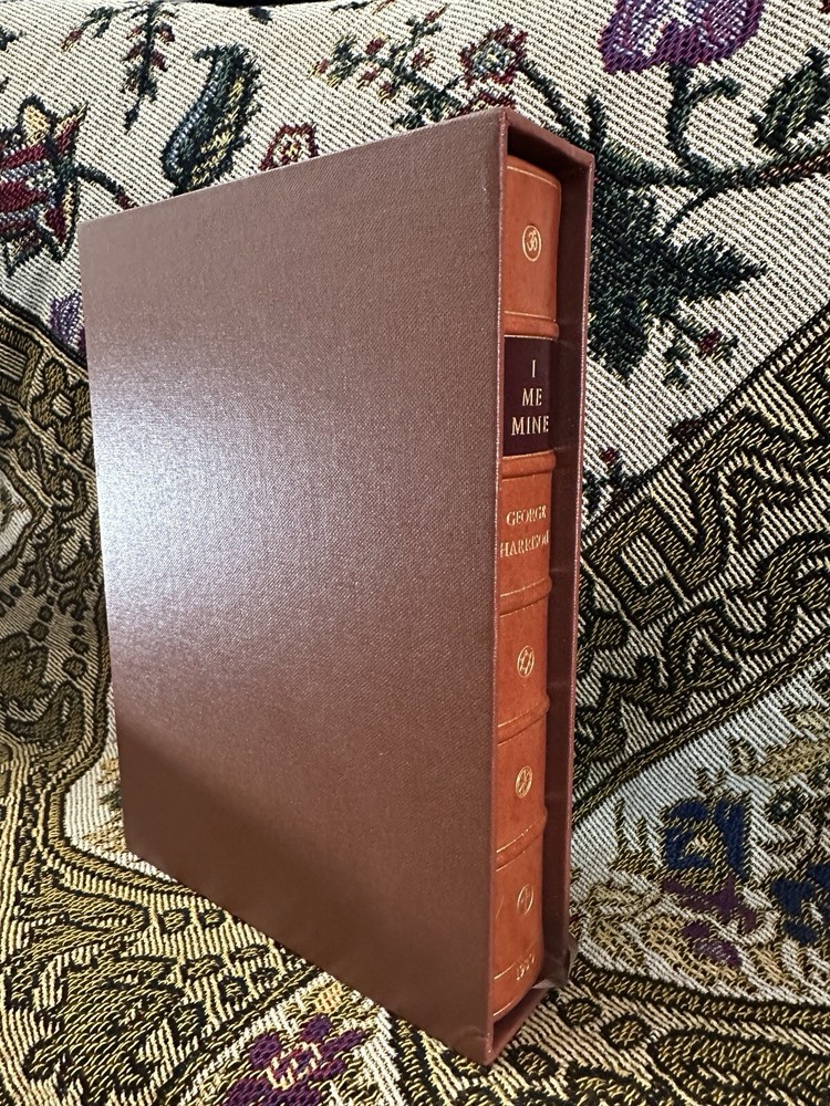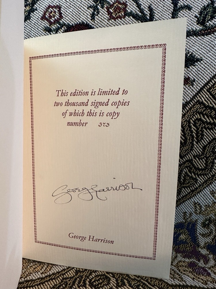 This is a rare and special edition of the book "I Me Mine" by George Harrison, signed by the author himself. The book is a limited, first edition hardcover copy printed in 1980 by Genesis Publications Limited. The book and matching deluxe slipcase are in excellent condition and have rarely been handled, making it a true collector's item. It contains special attributes that make it a unique collectible item for fans of The Beatles and George Harrison. This 1st edition pressing was limited to 2000 copies and this is copy #373, a very low number compared to most you can find on sale today. Notice that the signature is much higher on the page and more legible than most copies with higher numbers. It is bound in gorgeous brown leather with brown accents and housed in a matching leather dustcover slipcase. The book is in its original deluxe form and has not been reprinted. It is a must-have for collectors of antique and collectible books. The author, George Harrison, is known for his significant contribution to The Beatles and this book is a testament to his talent and creativity. The book will be professionally packed and shipped to ensure a fast and secure arrival with no hassles. Get your hands on this rare gem and add it to your collection today!