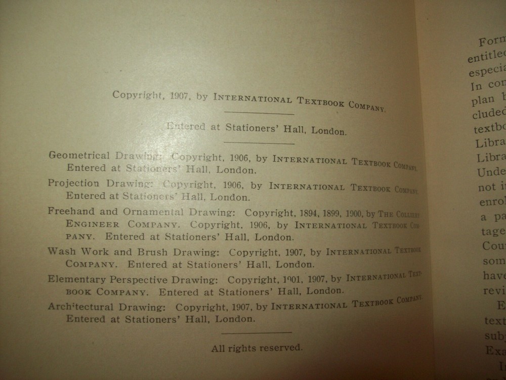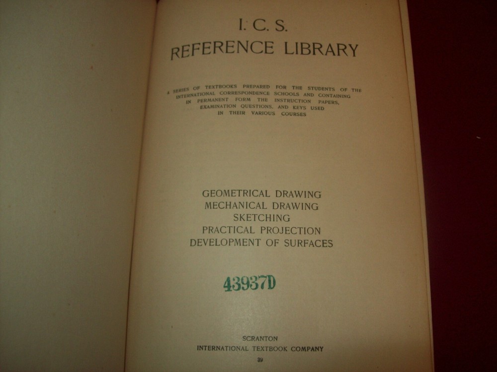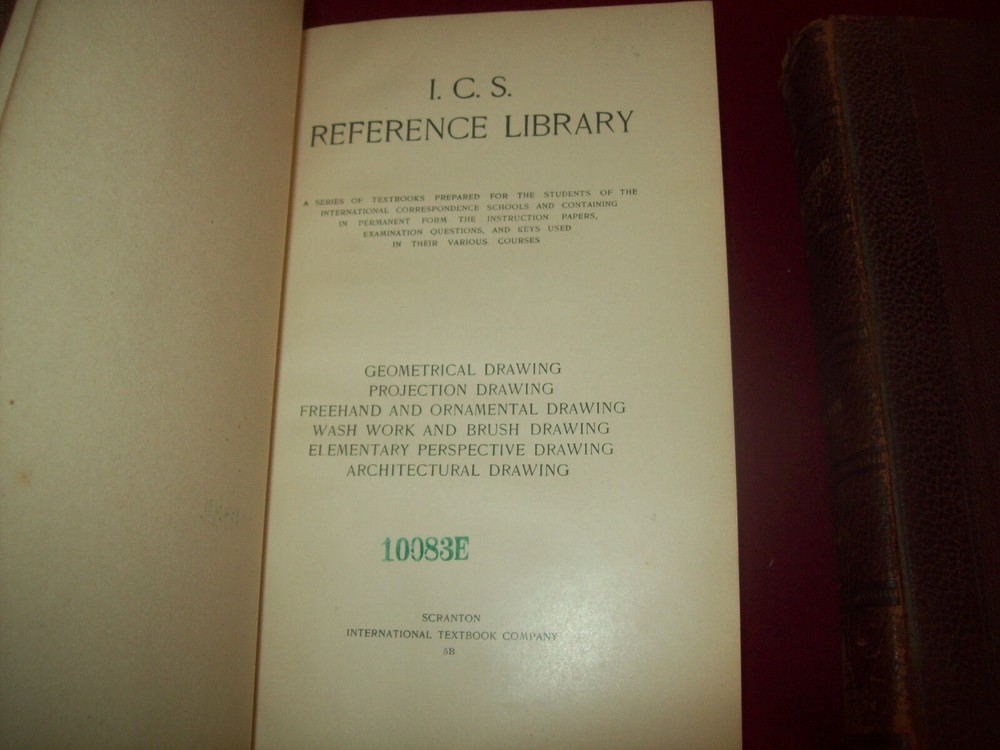 Pair of hardcover books from the International Correspondence School including: Geometrical Ornamental Architectural Freehand, and Perspective Drawing (1907) Drawing (1905) Both books are leather bound with a fair amount of wear and rubbing to the boards, the binding is solid and the pages are in nice condition. Free media mail shipping.