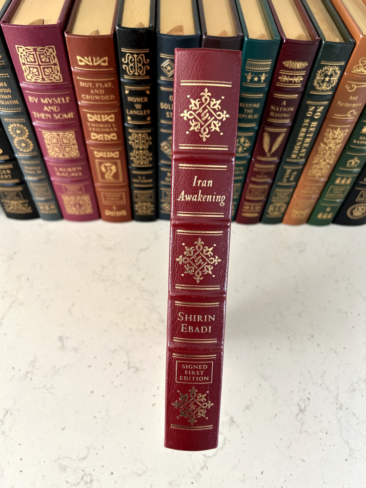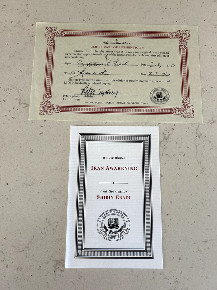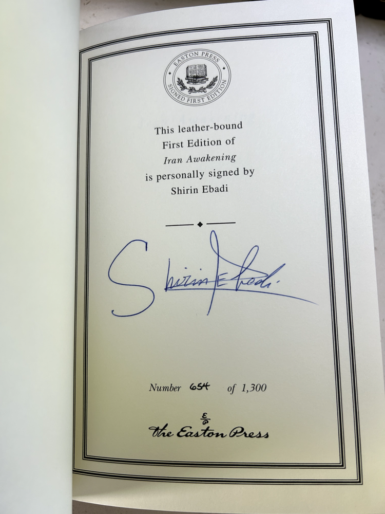 Iran Awakening by Shirin Ebadi Signed leather bound edition with COA, numbered 654 of 1,300 Like new - book has not been read, no bent pages Easton Press "Signed First Editions" (2006) Bound in fine genuine leather with 22K gold page edges Archival acid-free paper Domestic shipping only Returns accepted within 30 days