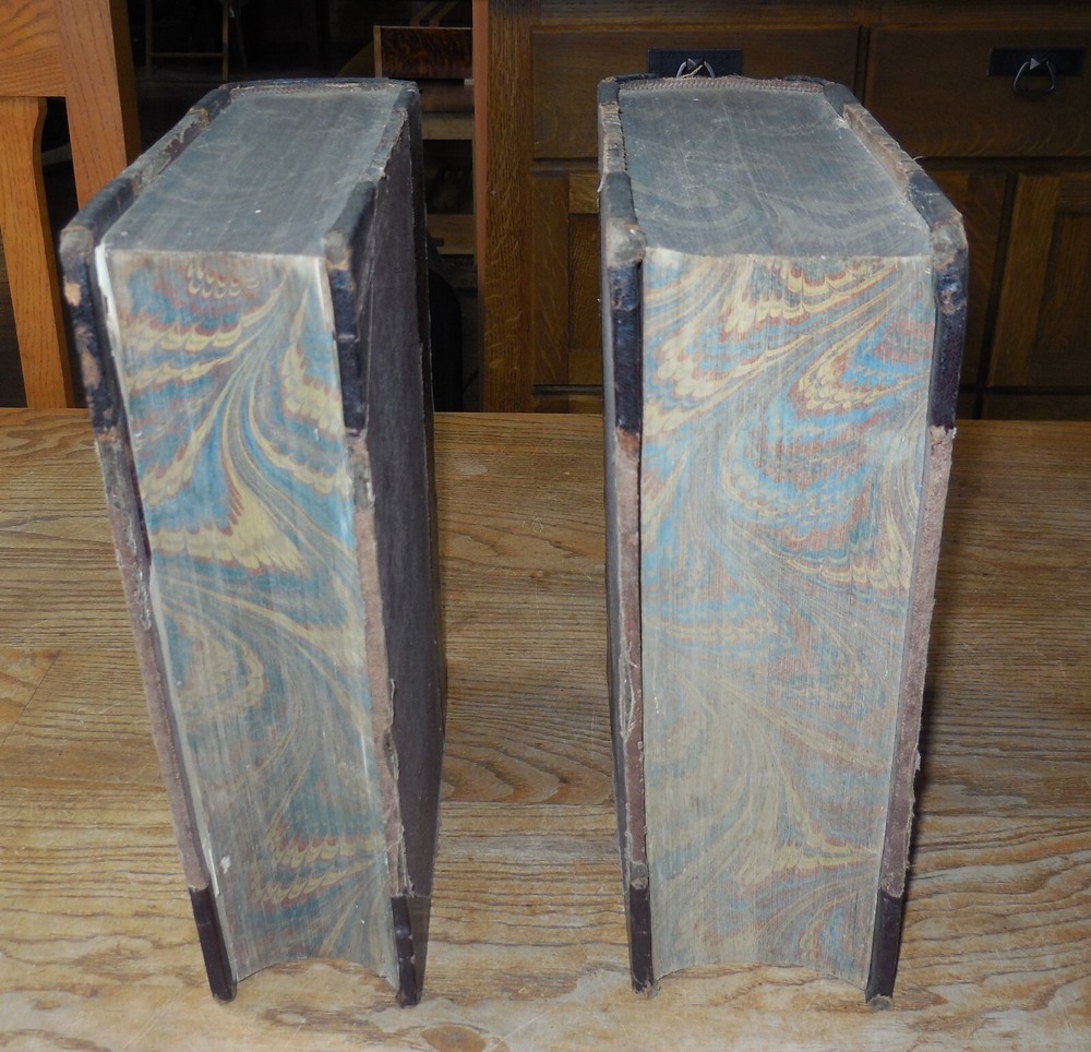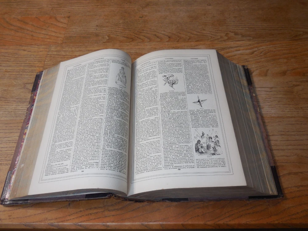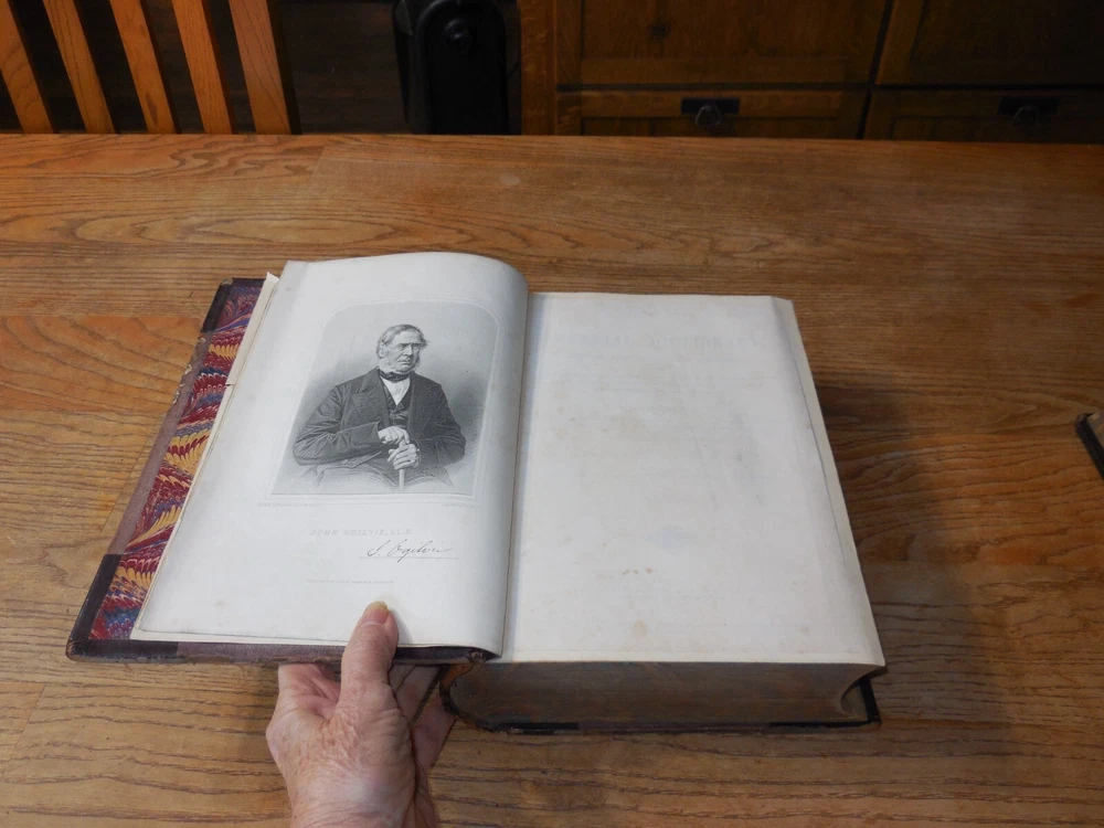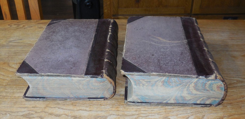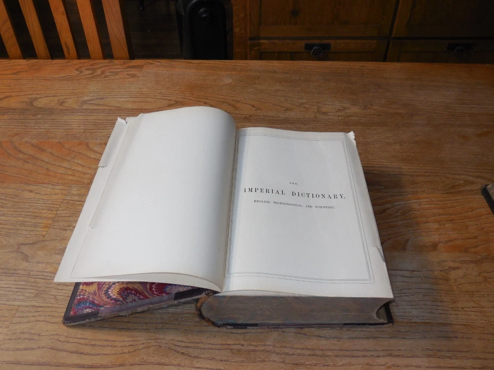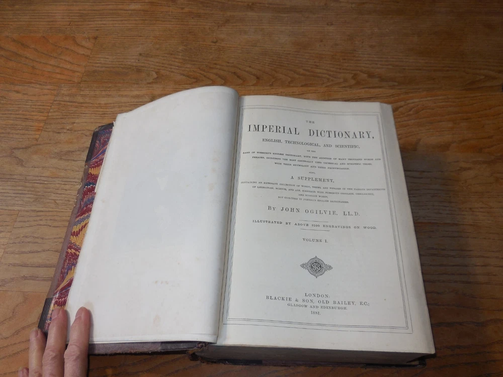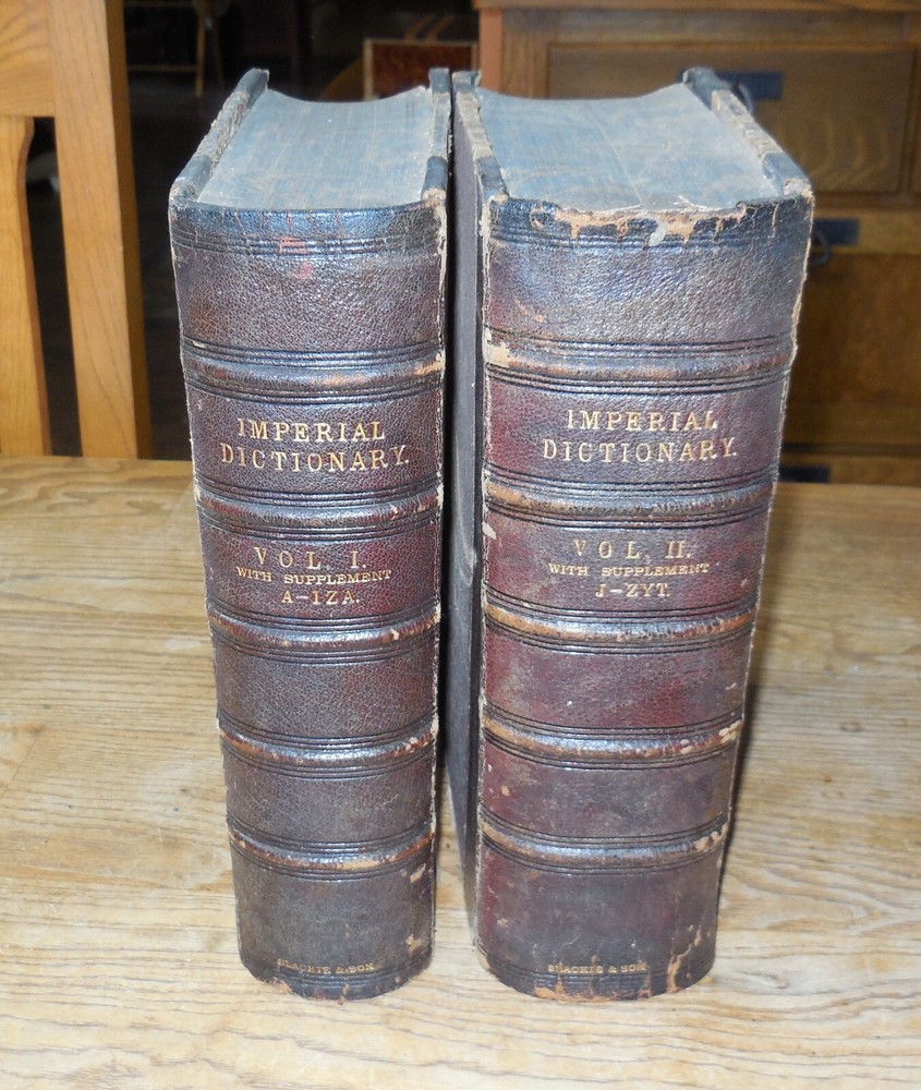 This listing is for The Imperial Dictionary, English, Technological, and Scientific, ... Also, A Supplement... By John Ogilvie, LL.D. Illustrated by Above 2500 Engravings On Wood. This is a two volume set dated 1881. Published by Blackie & Son of London. Condition on this set is very good. Bound in leather and cloth over boards. Spines are 5 ribbed. There is typical wear as from age. See photos. Volume I has tears to the front fly leaf pages at the top corner front and a tear to the front decorate page at the front edge. The frontispiece is of John Ogilvie with a protective tissue page. It also looks like it is signed by him but I can't be positive. Volume I is 1273 pages which includes a large Supplement section. The very last page of this volume has a single notation at the bottom of the page. I have looked and can find no other markings but this is a very large volume so I cannot promise there are not any others. Volume II is in slightly better condition that I. 1779 pages which includes a large Supplement section. I can find no markings in this volume. Both are tight and straight. These are remarkable early Dictionaries. Wonderful illustrations.