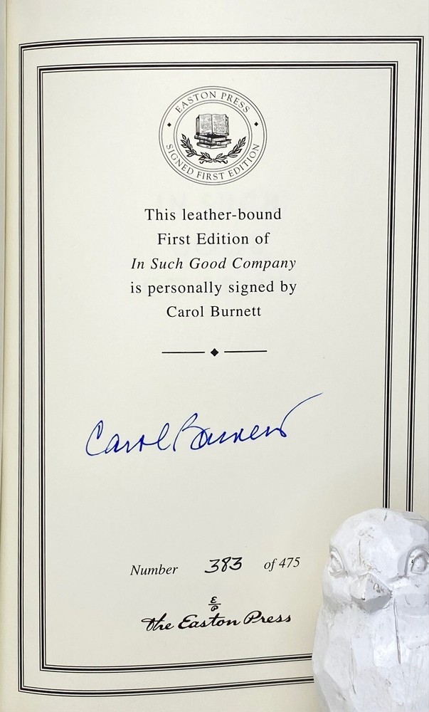 In Such Good Company: Eleven Years of Laughter, Mayhem, and Fun in the Sandbox SIGNED by Carol Burnett; Limited Edition of just 475 Hand-numbered 383 of 475 Condition and Terms This book is in excellent preowned condition. There are no attached bookplates, embossed seals, or other owner-marks to the interior. Sharp corners, no conspicuous scuffs or rubs to the exterior. There are little to no scratches/marks to the gilded page-edging. Please see the photographs for best description and free to reach out with questions and/or to request additional photos if desired. Returns are only allowed due to shipping damage or item not being as described. Due to USPS insurance claims procedures, partial refunds are not allowed due to shipping damage. Items damaged in shipping must be returned in the original packaging as received. The USPS requires inspection of the packaging and item damaged. Synopsis In In Such Good Company , Carol Burnett pulls back the curtain on the twenty-five-time Emmy-Award winning show that made television history, and she reminisces about the outrageously funny and tender moments that made working on the series as much fun as watching it. Carol delves into little-known stories of the guests, sketches and improvisations that made The Carol Burnett Show legendary, as well as some favorite tales too good not to relive again. While writing this book, Carol rewatched all 276 episodes and screen-grabbed her favorite video stills from the archives to illustrate the chemistry of the actors and the improvisational magic that made the show so successful. Putting the spotlight on everyone from her costars to the impressive list of guest stars, Carol crafts a lively portrait of the talent and creativity that went into every episode. With characteristic wit and incomparable comic timing, she details hiring Harvey Korman, Vicki Lawrence, Lyle Waggoner, and Tim Conway; shares anecdotes about guest stars and close friends, including Lucille Ball, Roddy Mcdowell, Jim Nabors, Bernadette Peters, Betty Grable, Steve Lawrence, Eydie Gorme, Gloria Swanson, Rita Hayworth, and Betty White; and gives her take on her favorite sketches and the unpredictable moments that took both the cast and viewers by surprise. This book is Carol's love letter to a golden era in television history through the lens of her brilliant show. Get the best seat in the house for "eleven years of laughter, mayhem, and fun in the sandbox."