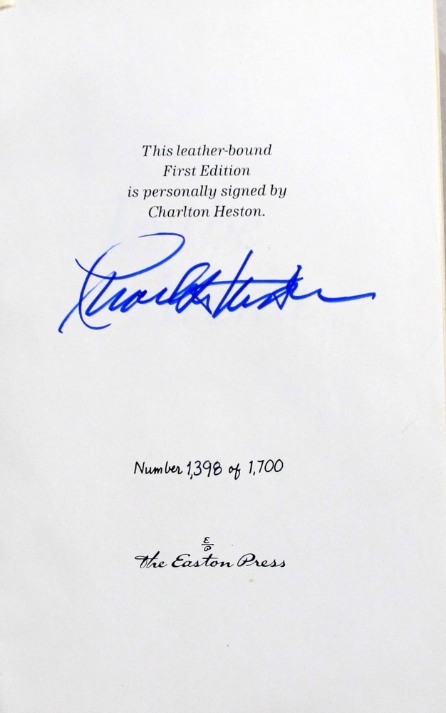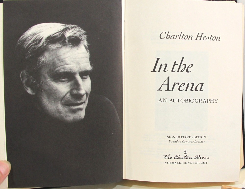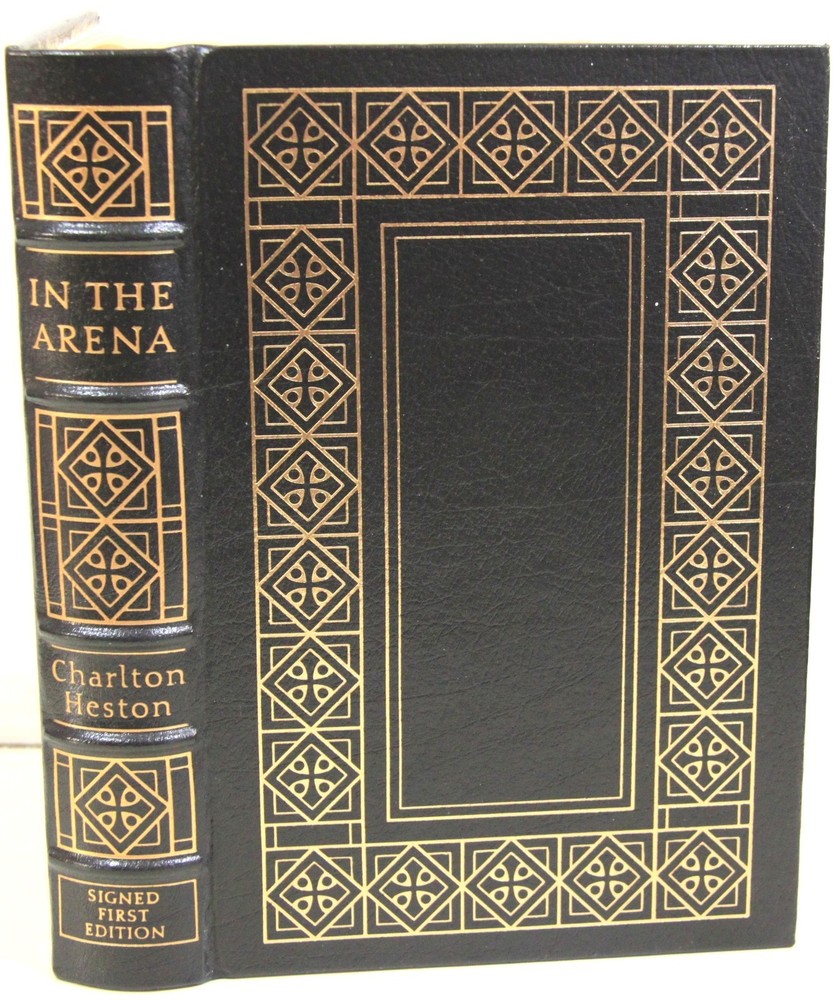 In the Arena: An Autobiography by Charlton Heston . Easton Press, Norwalk, Connecticut, 1995. Full-Leather. Signed by Heston and a limited edition of 1398/1700 . First edition. Looking back over a career that has spanned half a century and a lifetime devoted to being the best possible, both as an actor and as a man, Charlton Heston writes of what it was like to live In the Arena. Heston began his career as an actor in New York shortly after he returned from service in World War II. Television was a fledgling industry then, and there were many opportunities for young performers in this new medium. Broadway was thriving as well, and Heston found work there too. It was not long, however, before Hollywood took note of his talents and his commanding presence. Soon he was embarked on a series of films that were both memorable and hugely successful. He was Moses in The Ten Commandments; he played the title character in Ben-Hur (for which he won an Academy Award); he was Michelangelo in The Agony and the Ecstasy; he played the title character in El Cid; he has played presidents, generals, and statesmen. Typically beautiful Easton Press book. Nice clean and possibly unread copy. Bookplate laid in. Very light gilt loss on the bottom edge, otherwise beautiful. Powered by eBay Turbo Lister The free listing tool. List your items fast and easy and manage your active items.